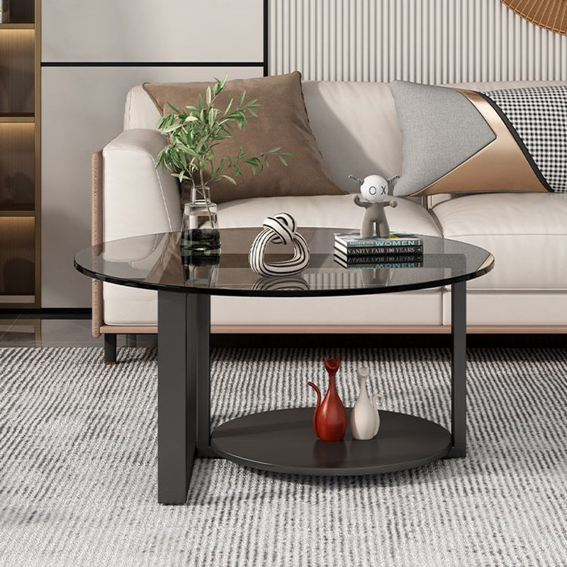 Contemporary Scandinavian Round Sintered Stone Glass Carbon Steel Coffee Table 2-Tier For Living Room