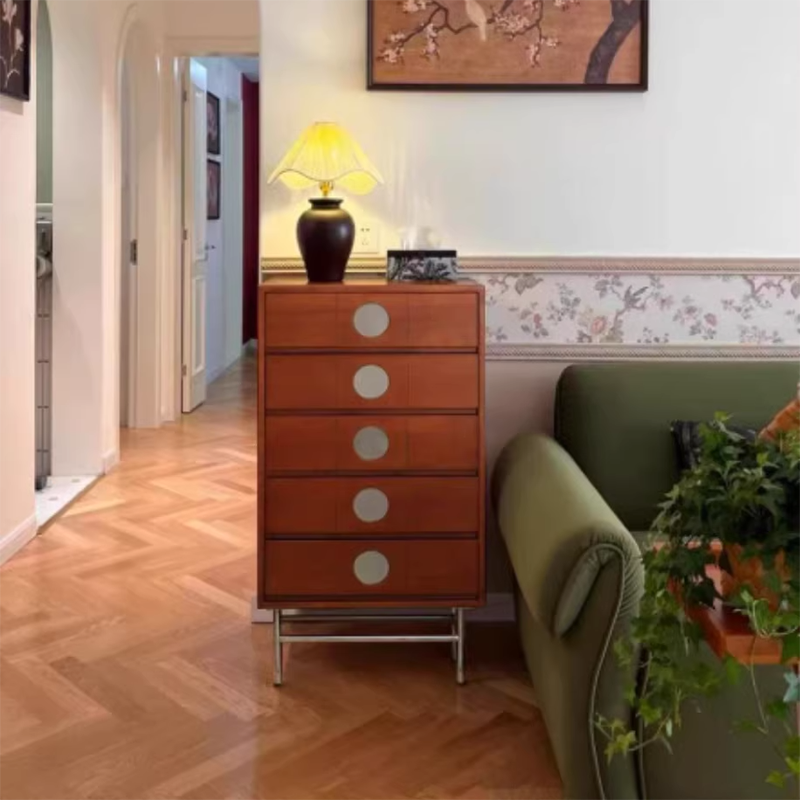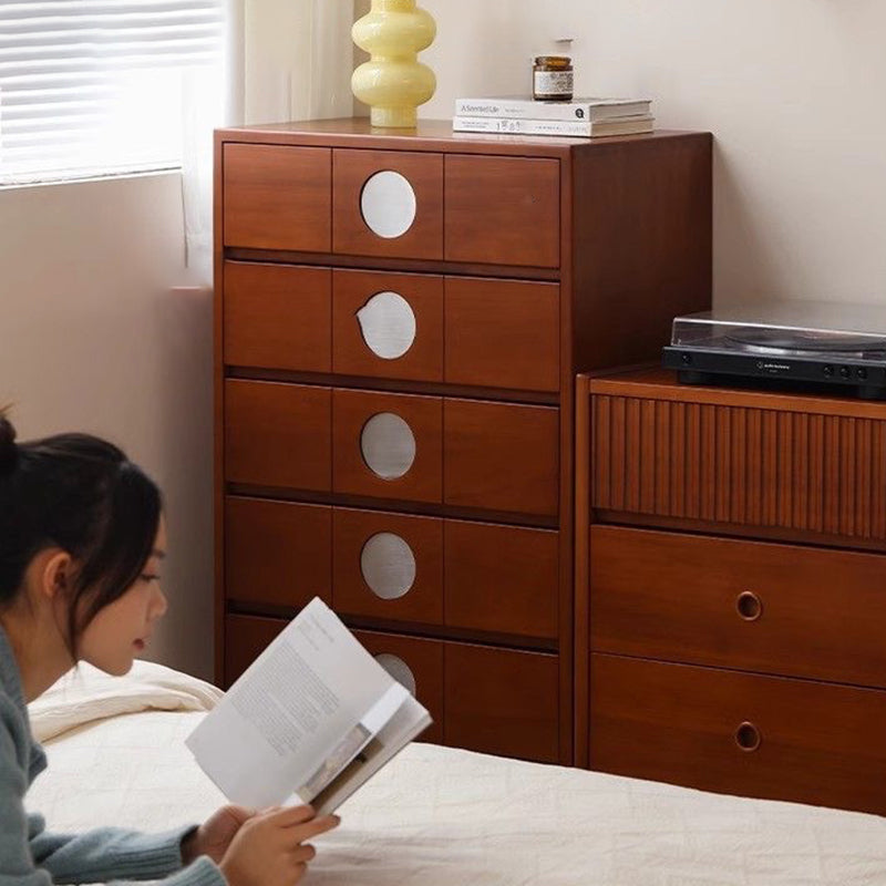 Finished in a warm walnut tone, this solid wood storage cabinet combines a durable pine structure, multilayer wood back panel, and rust-resistant stainless steel base for reliable support. With five generously sized drawers, it provides practical storage while working perfectly as a bedside cabinet or sofa-side chest in bedrooms and living spaces.