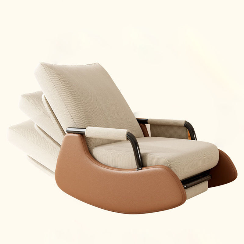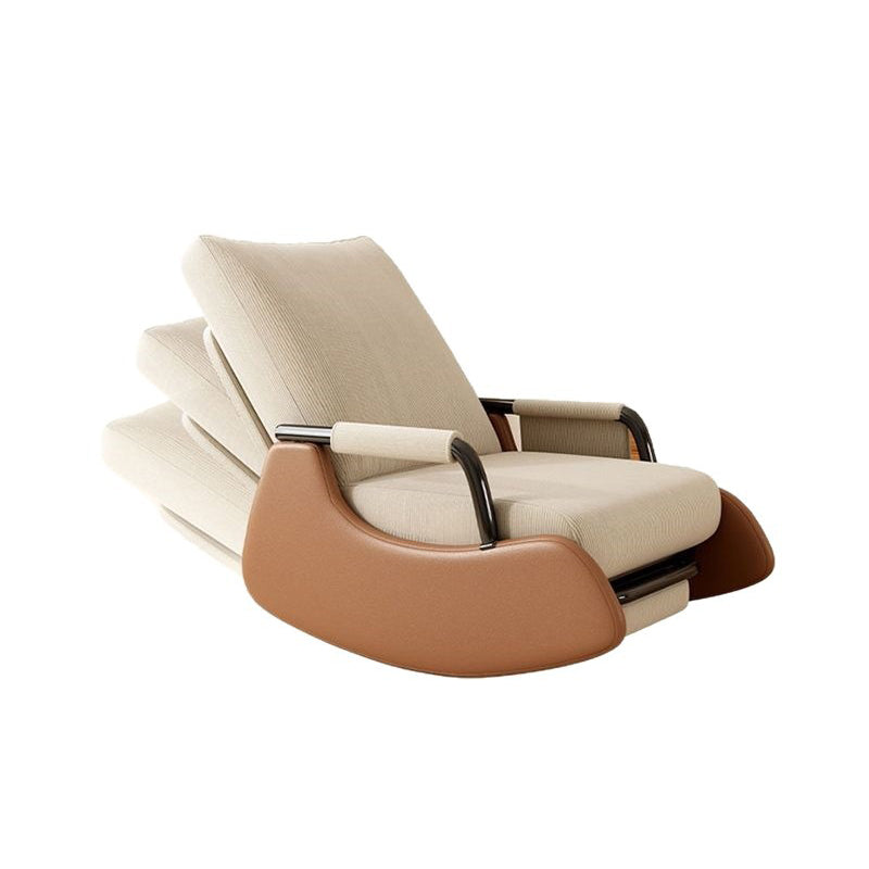 Relax in modern comfort with this Nordic-style lounge and rocking chair crafted from soft corduroy, faux leather, and a sturdy solid wood and steel frame. Designed with an adjustable backrest and supportive armrests, it offers a cozy, flexible seating experience. Available in off-white, green, and gray, this recliner adds effortless style and comfort to any living room or reading nook.