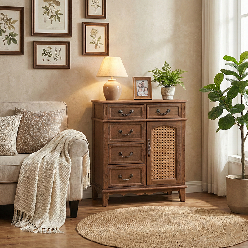 Elevate your living space with this modern minimalist storage cabinet, masterfully crafted from solid wood and natural rattan. Finished in a rich coffee color, its durable, rectangular frame effortlessly houses five smooth-gliding drawers and two spacious cabinets, providing effortless organization for all your essentials. This versatile sideboard is the perfect living room accent, offering reliable, long-lasting storage and display space, all wrapped in a design that speaks to timeless quality and understated sophistication.