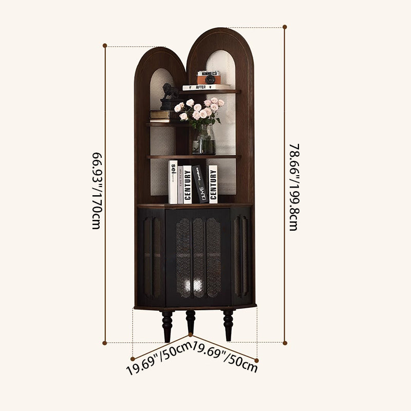 This contemporary retro corner storage cabinet is crafted from ash wood, solid wood multi-layer boards, and textured glass, available in a walnut color and black finish. Featuring four open tiers, a 1-door enclosed cabinet, and a 90° space-saving corner design with stable triangular support, it offers practical and stylish storage for living rooms or bedrooms.