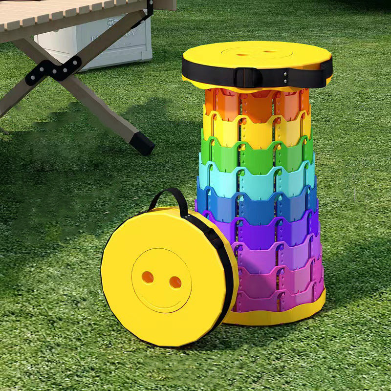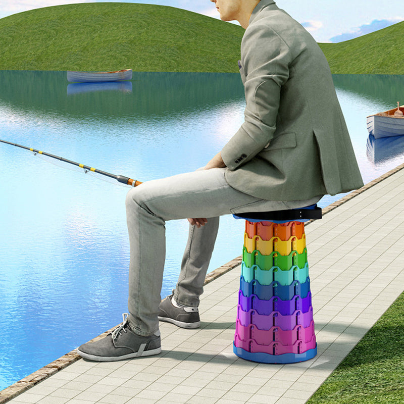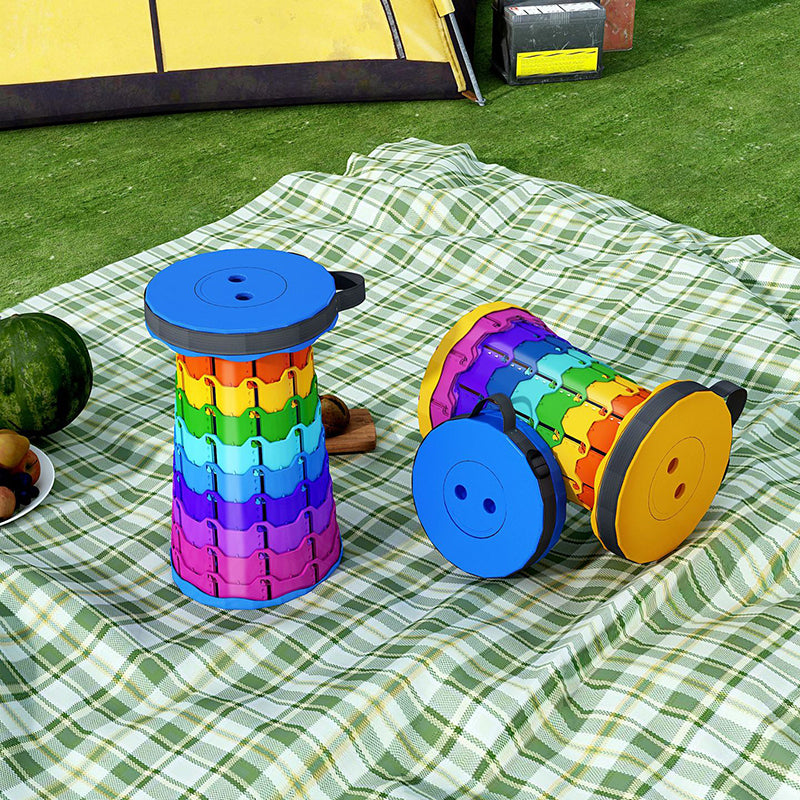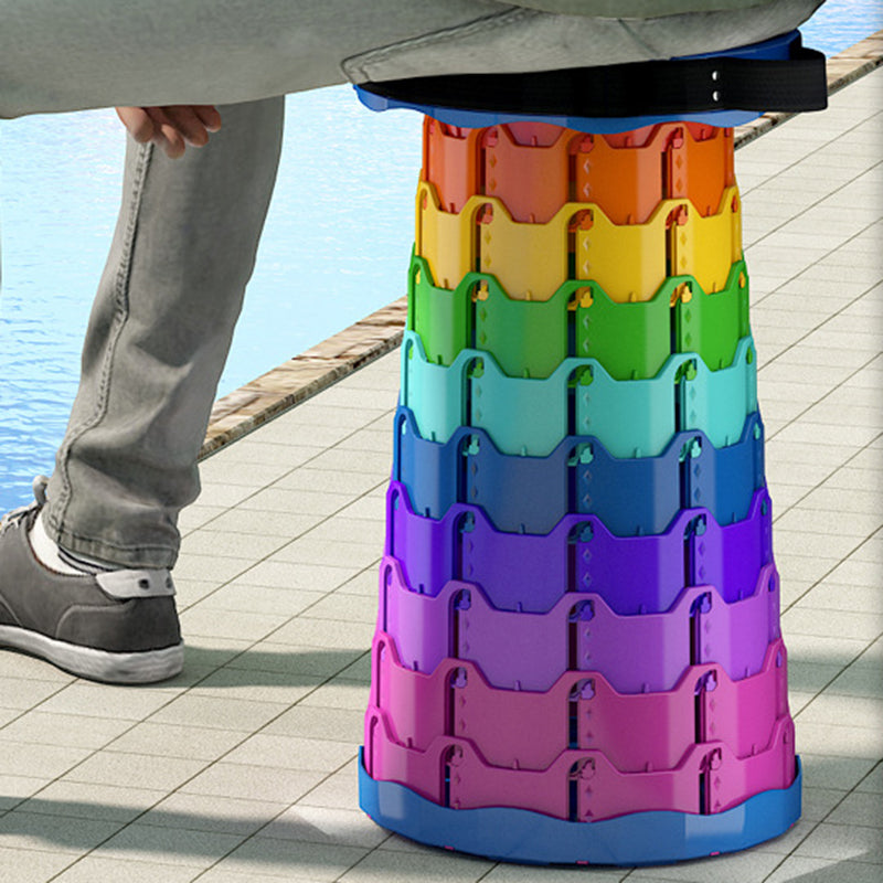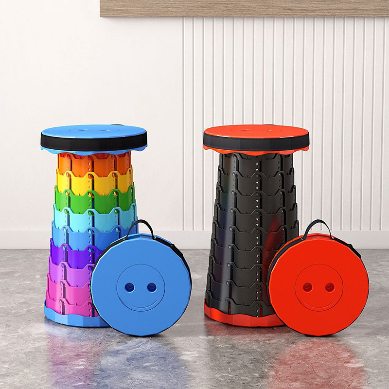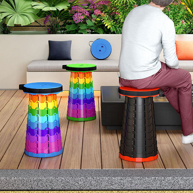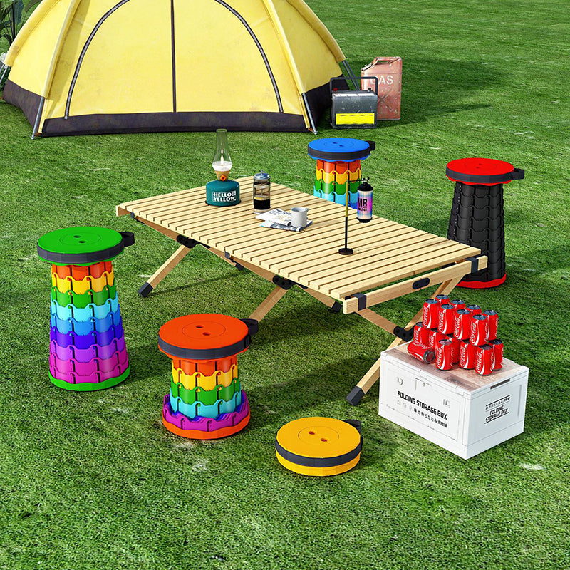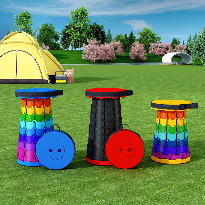 Discover the convenience of this colorful cylindrical outdoor folding stool. Constructed from durable PP (polypropylene), this backless stool features an innovative adjustable design that collapses down instantly into a compact handheld form for effortless travel.