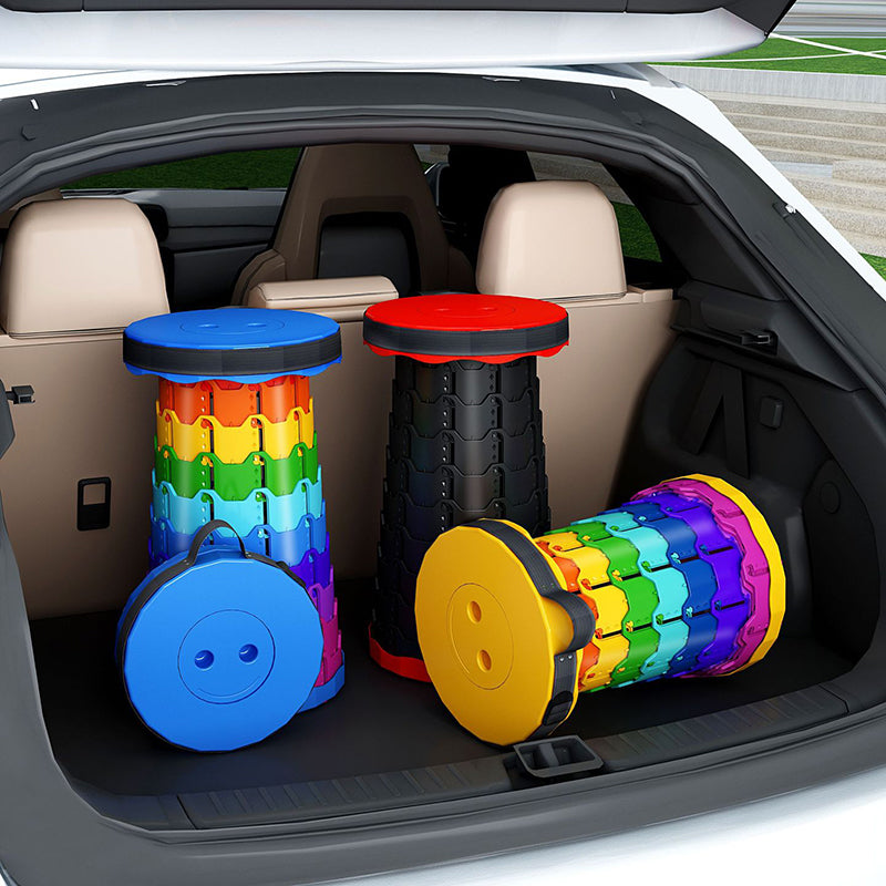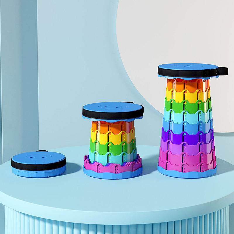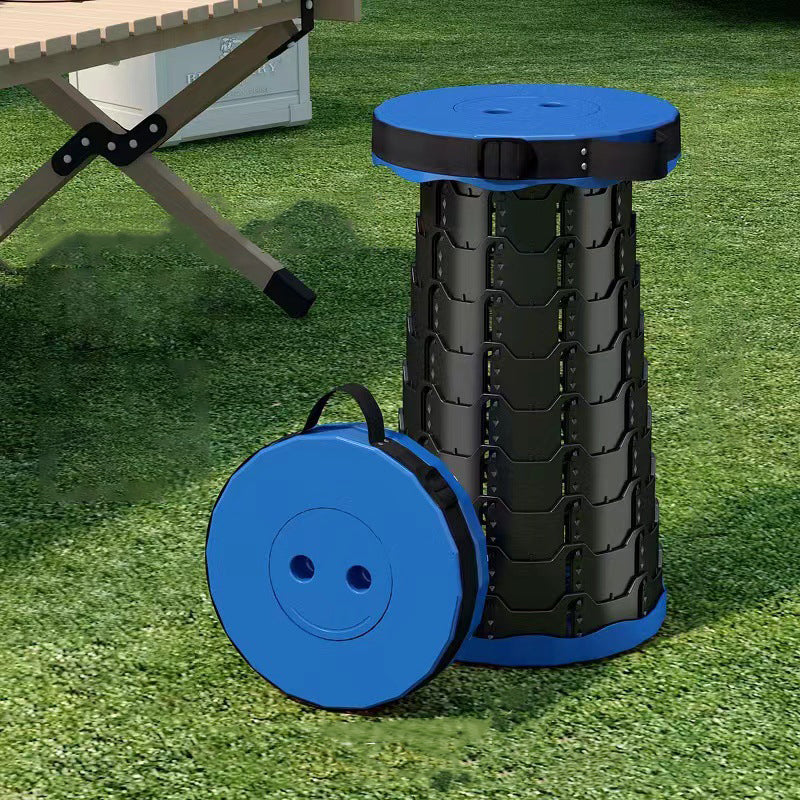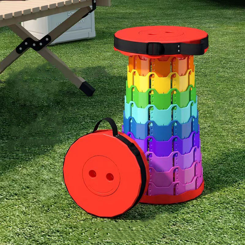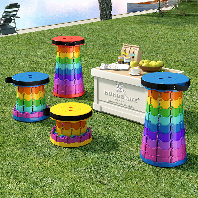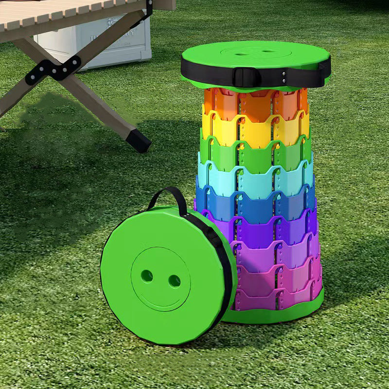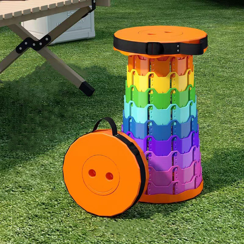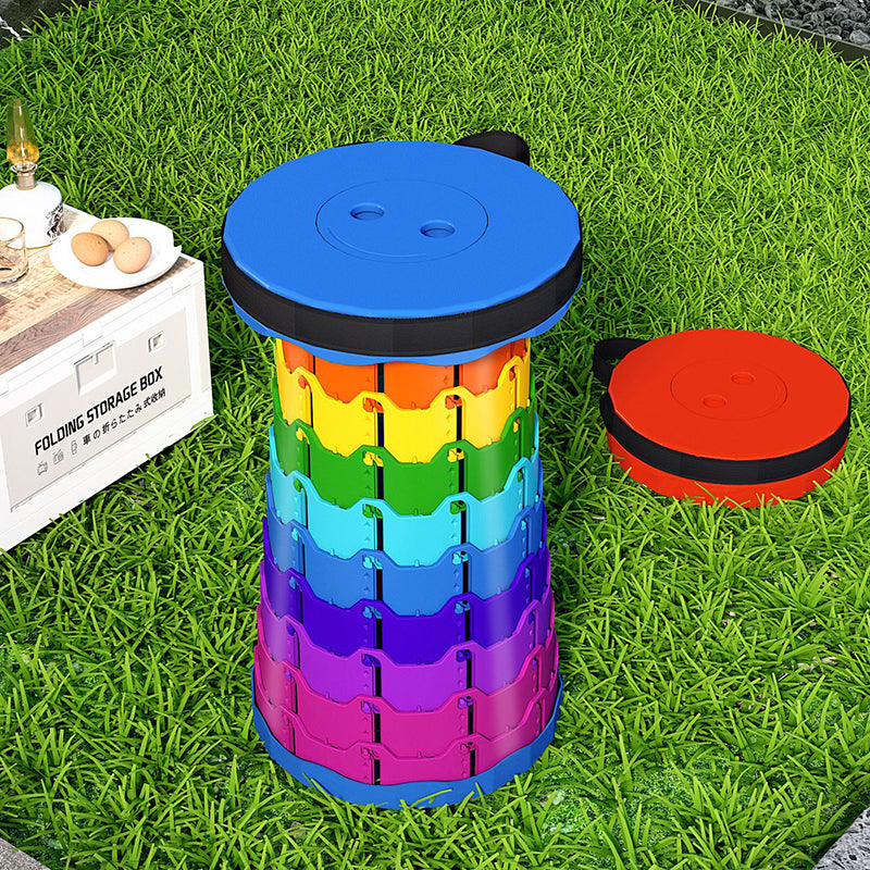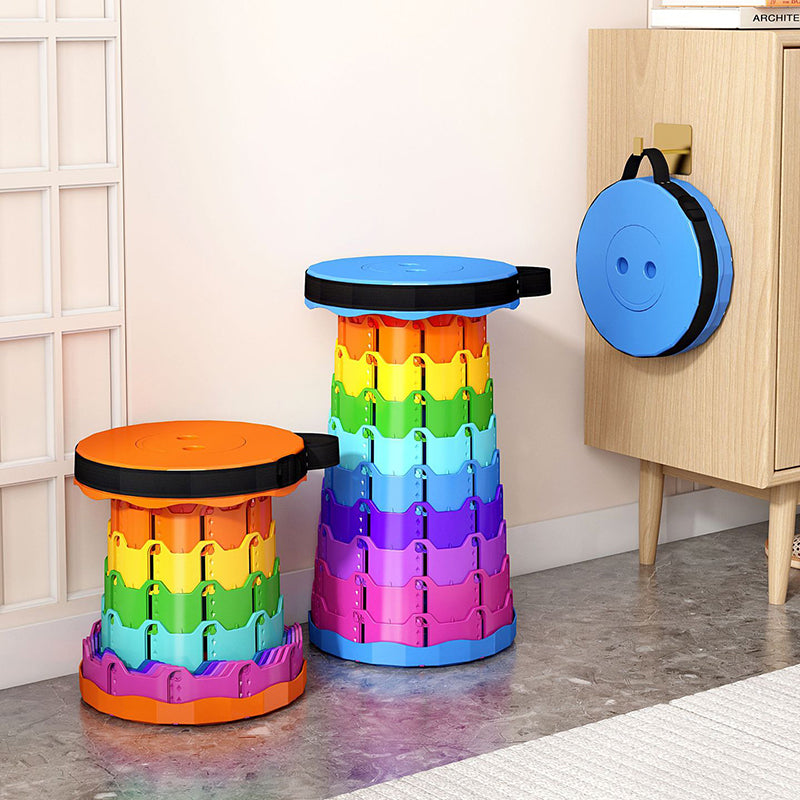 Discover the convenience of this colorful cylindrical outdoor folding stool. Constructed from durable PP (polypropylene), this backless stool features an innovative adjustable design that collapses down instantly into a compact handheld form for effortless travel.