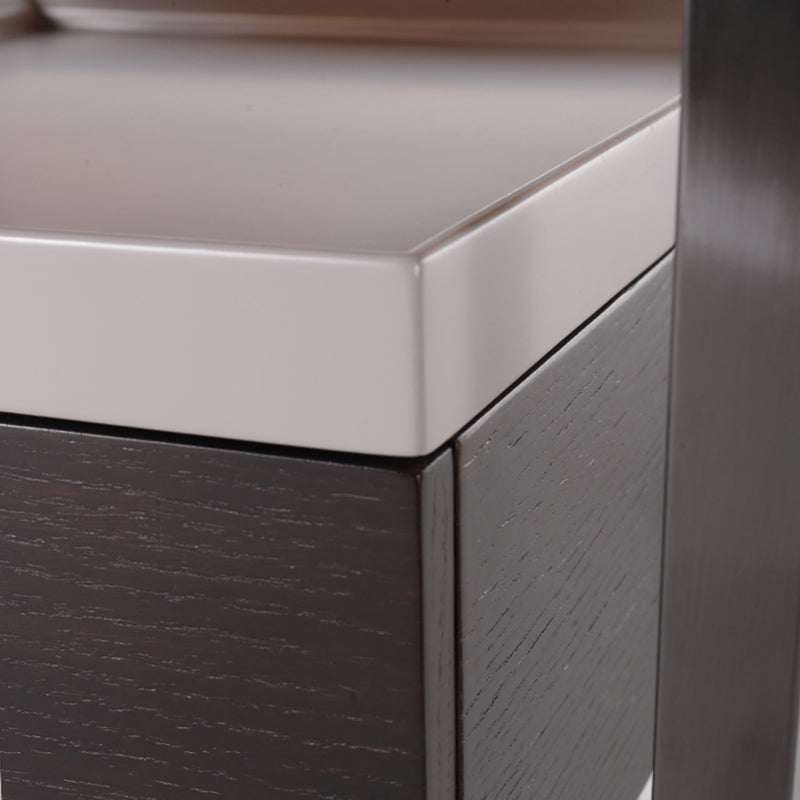 This modern creative nightstand combines minimalist geometry with industrial refinement. The open stainless steel frame delivers a clean, architectural silhouette that feels both strong and airy. Its tempered smoked glass top rests lightly above the structure, creating a floating visual effect with modern elegance. The drawer, crafted from eco-friendly MDF and veneered plywood, provides durable storage with a warm, natural texture.