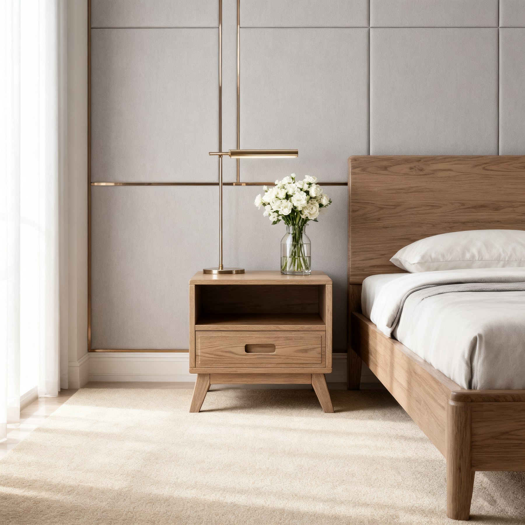 This nightstand blends modern minimalist design with North American imported ash wood—its hard texture ensures stable, wobble-free support; the clear natural grain adds inherent beauty; it’s eco-friendly and non-toxic, keeping your space healthy. The square tabletop, crafted from ash wood, is durable, easy to clean, and aesthetically pleasing; the solid wood legs (also ash) firmly hold the cabinet, making your bedroom corner both sleek and reliable.
