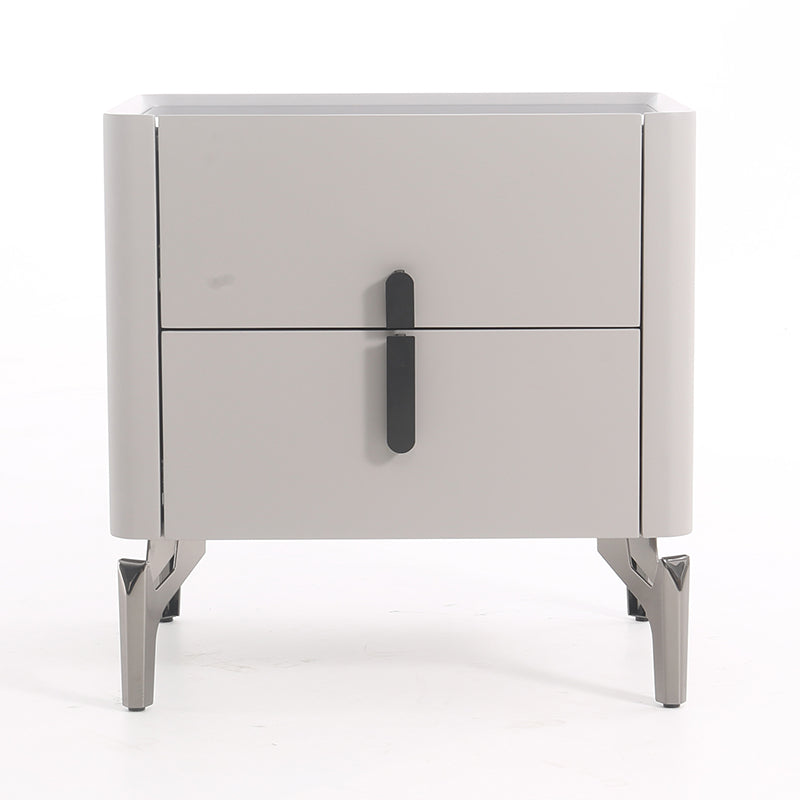 Elevate your space with this modern light luxury nightstand, a statement piece defined by its clean lines and refined details. The core of its design is the elegant contrast between the matte gray lacquered body and the sophisticated black glass top, radiating an understated sense of luxury. Supported by sleek stainless steel legs, the structure feels effortlessly light yet reliably stable. Boasting two spacious drawers, it provides ample, clutter-free storage for all your bedside essentials, making it the perfect, high-style addition to modern, minimalist, or luxury-themed interiors.