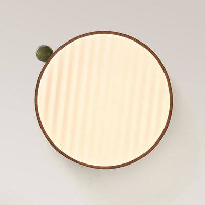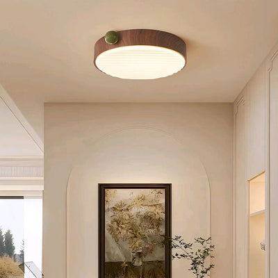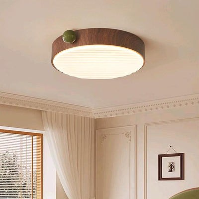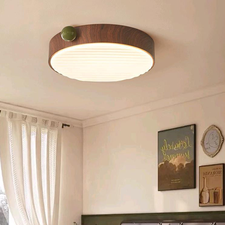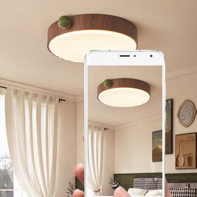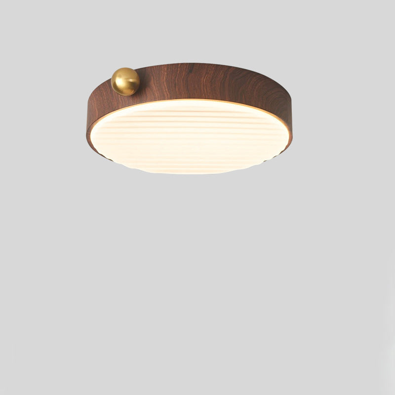 Contemporary Retro Round Iron Walnut Grain Chips Acrylic Shade LED Flush Mount Ceiling Light For Bedroom