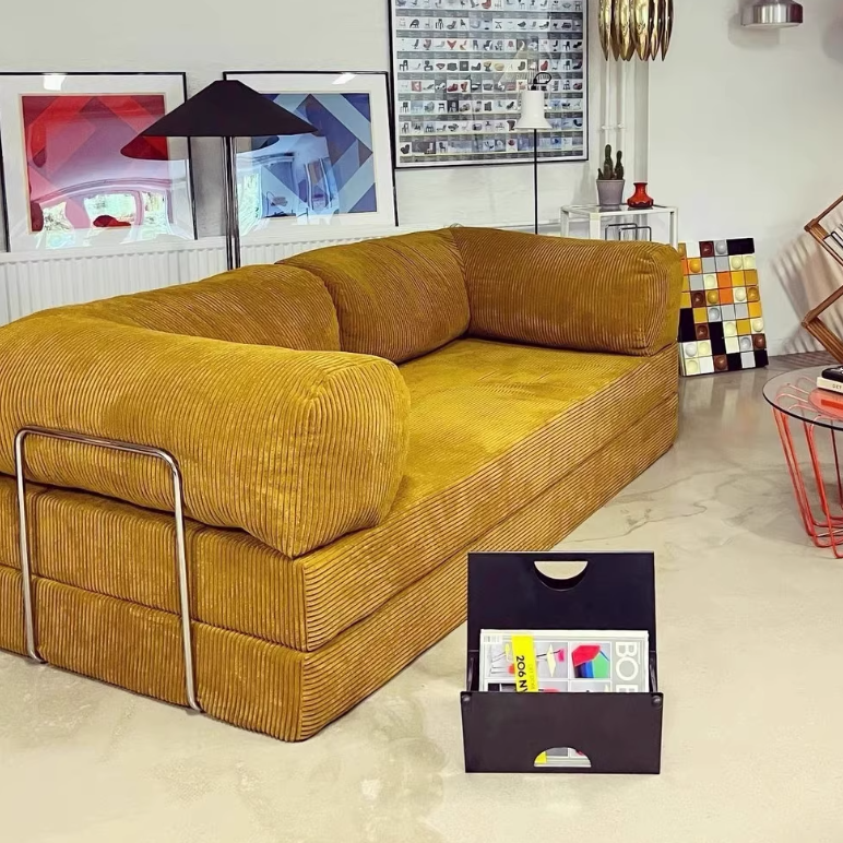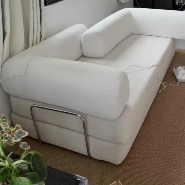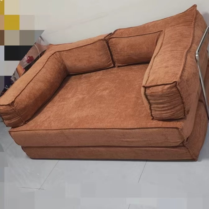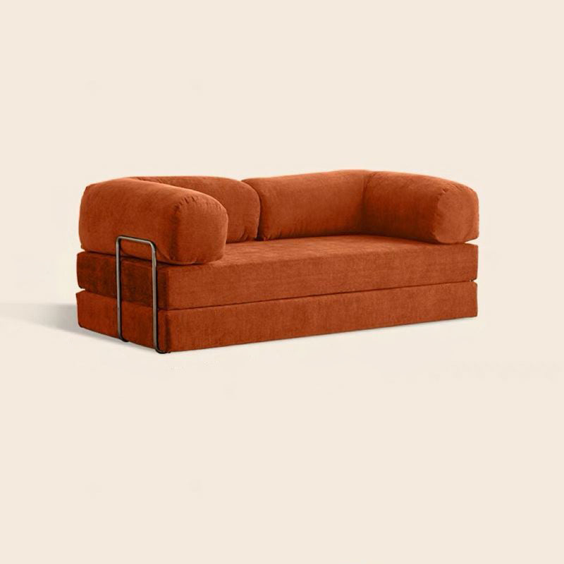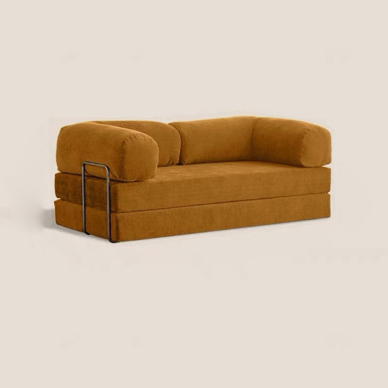 This modern minimalist fabric sofa features a curved square silhouette with backrest and armrests, built on a stainless steel fixed frame for long-lasting stability and shape retention. Available in caramel, ginger yellow, green, dark green, off-white, light gray, blush pink, and blue, it’s ideal for small living rooms seeking a comfortable, stylish, and space-efficient seating solution.