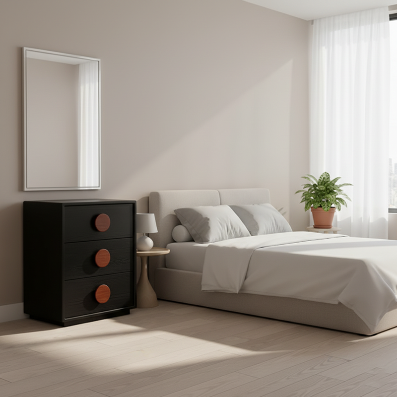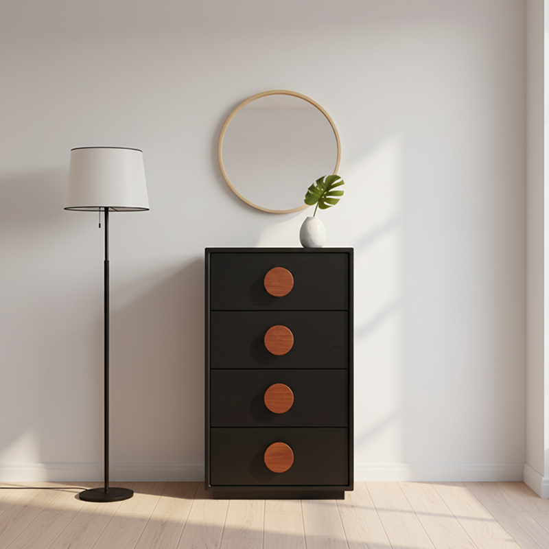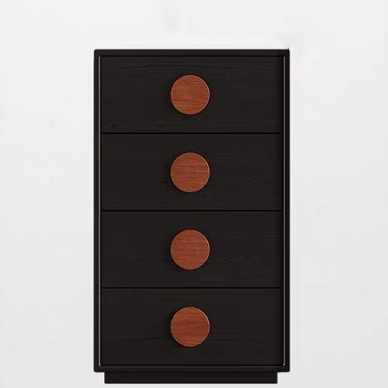 This traditional French-style 3/4-drawer cabinet is crafted from high-quality solid wood multi-layer board---selected sturdy, thick materials ensure strong load-bearing capacity and long-lasting durability; meanwhile, it adopts an eco-friendly formaldehyde-free process, which is healthy and pollution-free for safer home use. The cabinet features a classic black base tone, paired with log-textured round handles, fully showcasing French minimalist elegance; the drawers are equipped with precision rails, sliding smoothly without jamming for convenient storage and access. Whether used for bedroom storage or living room organization, it combines practicality and decoration, infusing the space with an elegant French atmosphere.