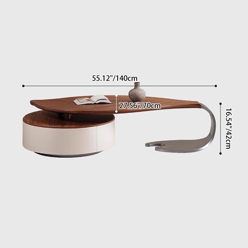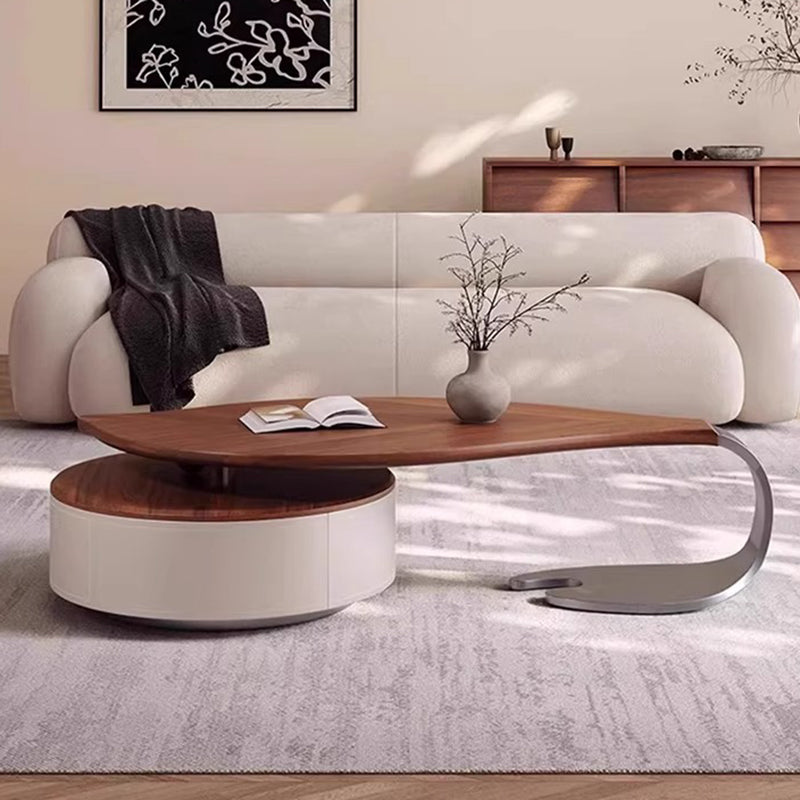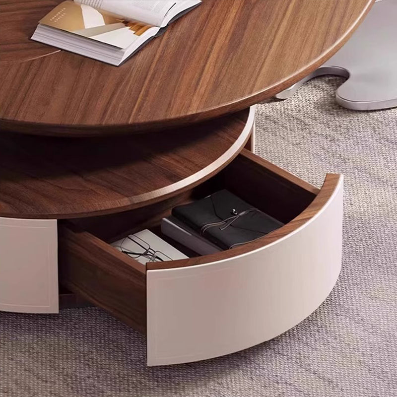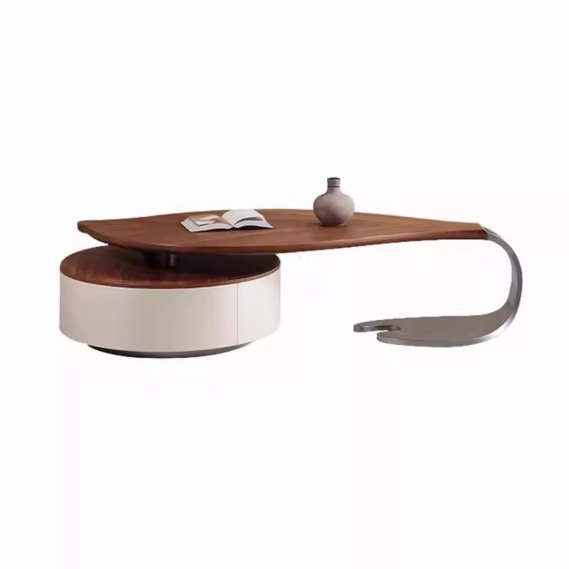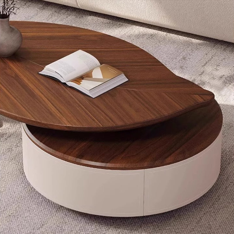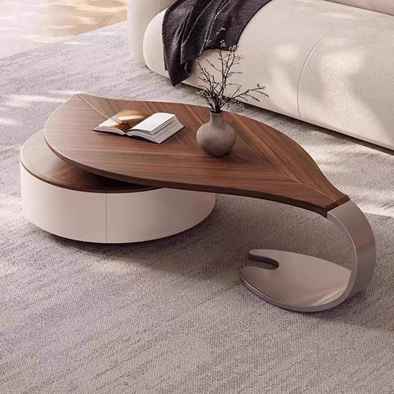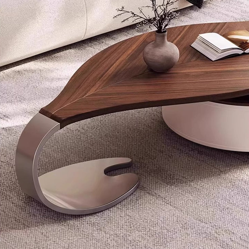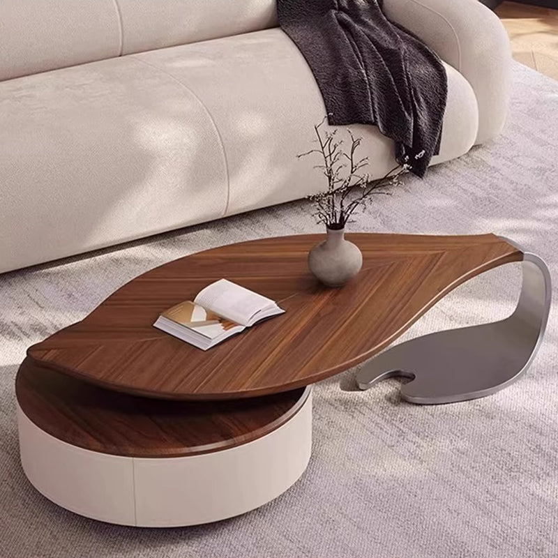 Anchor your living room with this exquisite modern luxury round coffee table, a piece defined by its sophisticated blend of organic form and premium materials. The spacious, inviting tabletop is finished in a rich walnut-tone wood veneer, beautifully accentuating its unique, smooth rounded edges and subtle leaf-inspired form. This elegant design introduces a refined, warm aesthetic that immediately elevates any upscale interior.