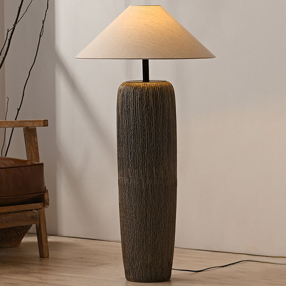 Japanese Wabi-sabi Fabric Shade Ceramic Column Base 1-Light Standing Floor Lamp