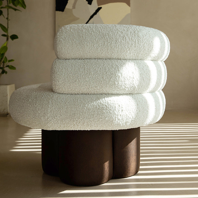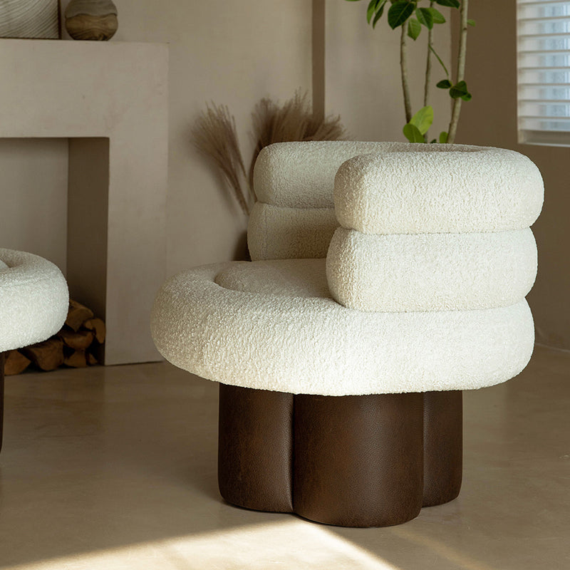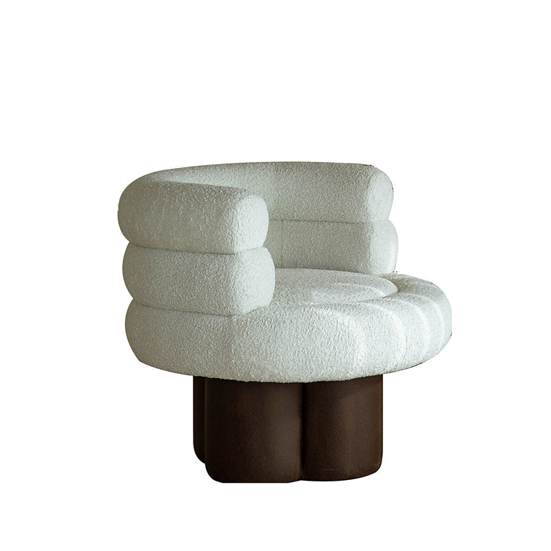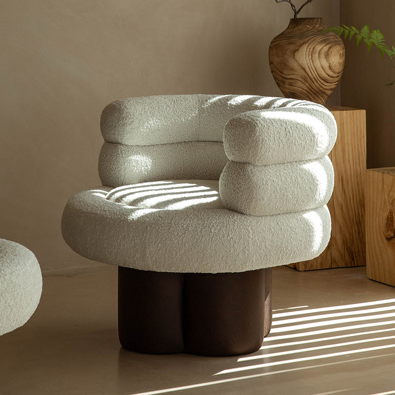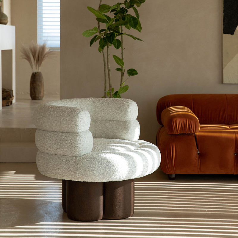 This contemporary Scandinavian lounge chair combines soft white shearling, walnut-tone solid wood, and a curved cylindrical silhouette, featuring supportive armrests and backrest. Filled with high-density foam for balanced support, it offers lasting comfort without sagging—ideal for creating a cozy, designer touch in your living room.