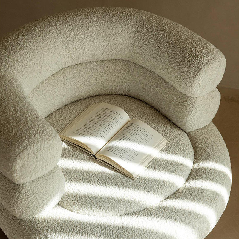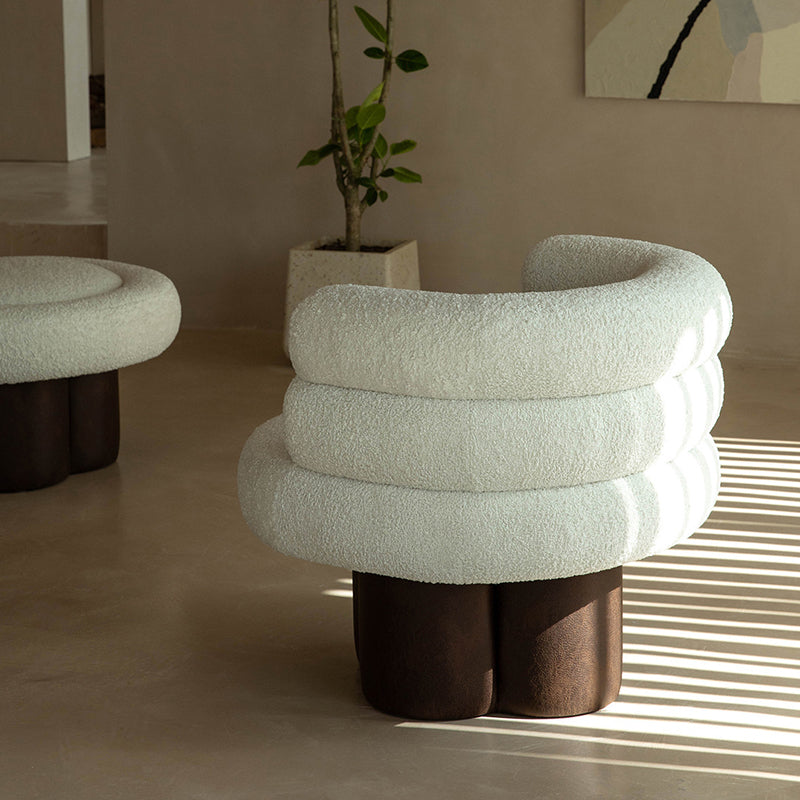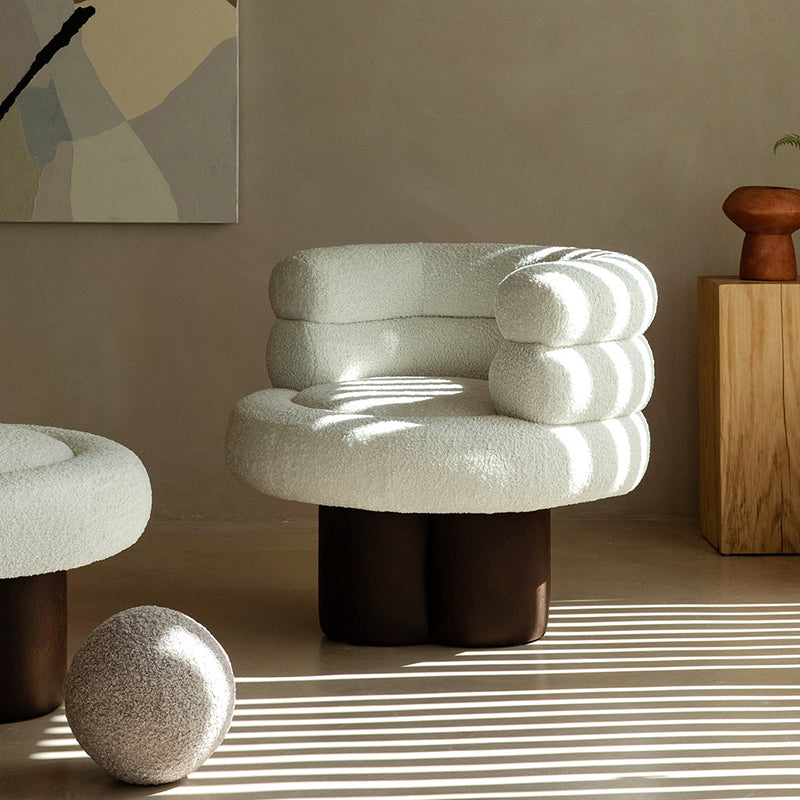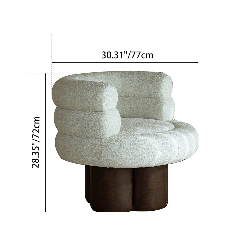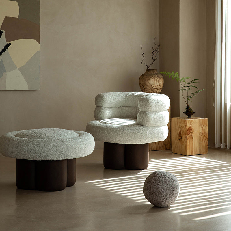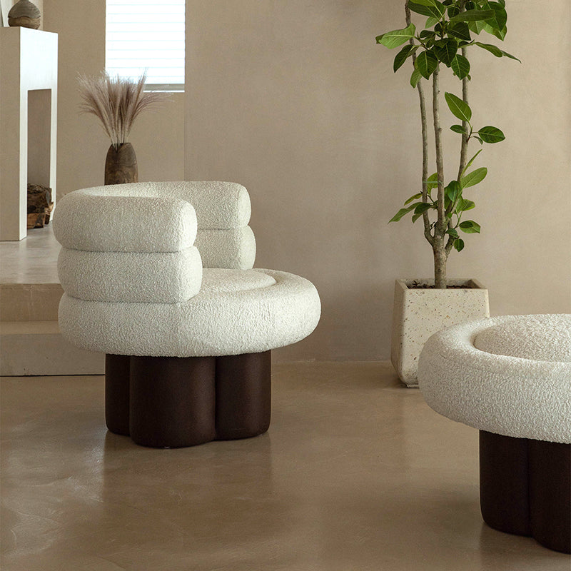 This contemporary Scandinavian lounge chair combines soft white shearling, walnut-tone solid wood, and a curved cylindrical silhouette, featuring supportive armrests and backrest. Filled with high-density foam for balanced support, it offers lasting comfort without sagging—ideal for creating a cozy, designer touch in your living room.