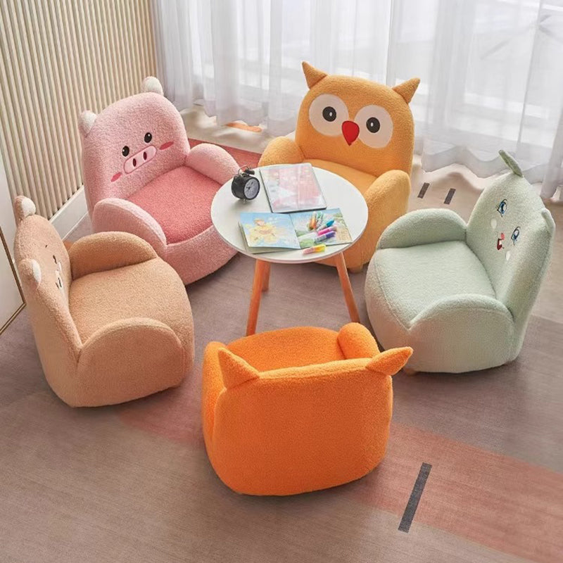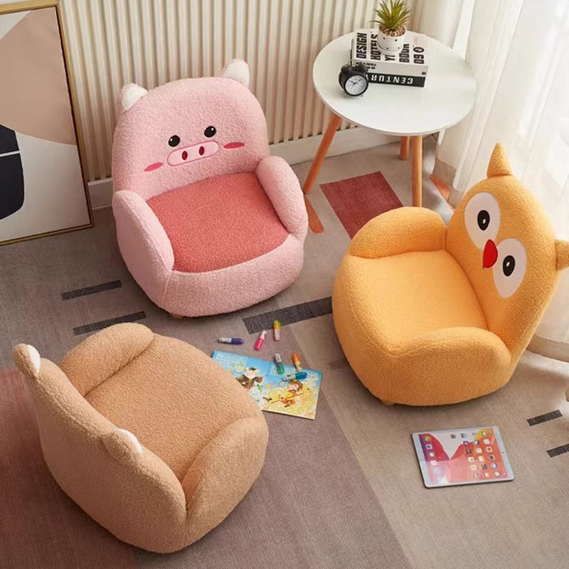 This adorable kidsâ€?accent chair features a shearling finish and solid wood frame with playful cartoon animal styling. Designed with a backrest and armrests for comfort, it comes in pink, white, green, brown, orange, and yellow—perfect for living rooms, playrooms, or reading corners.