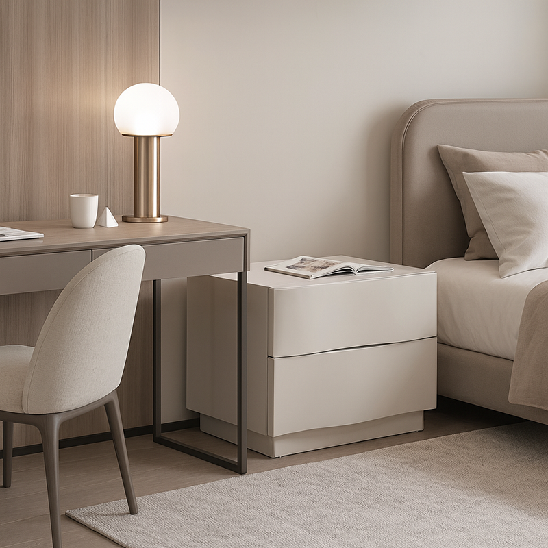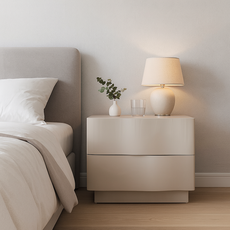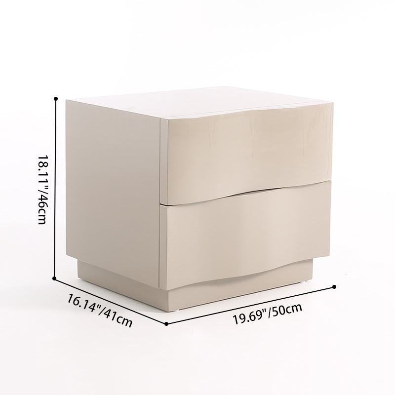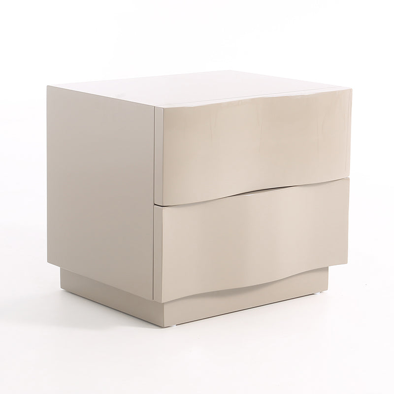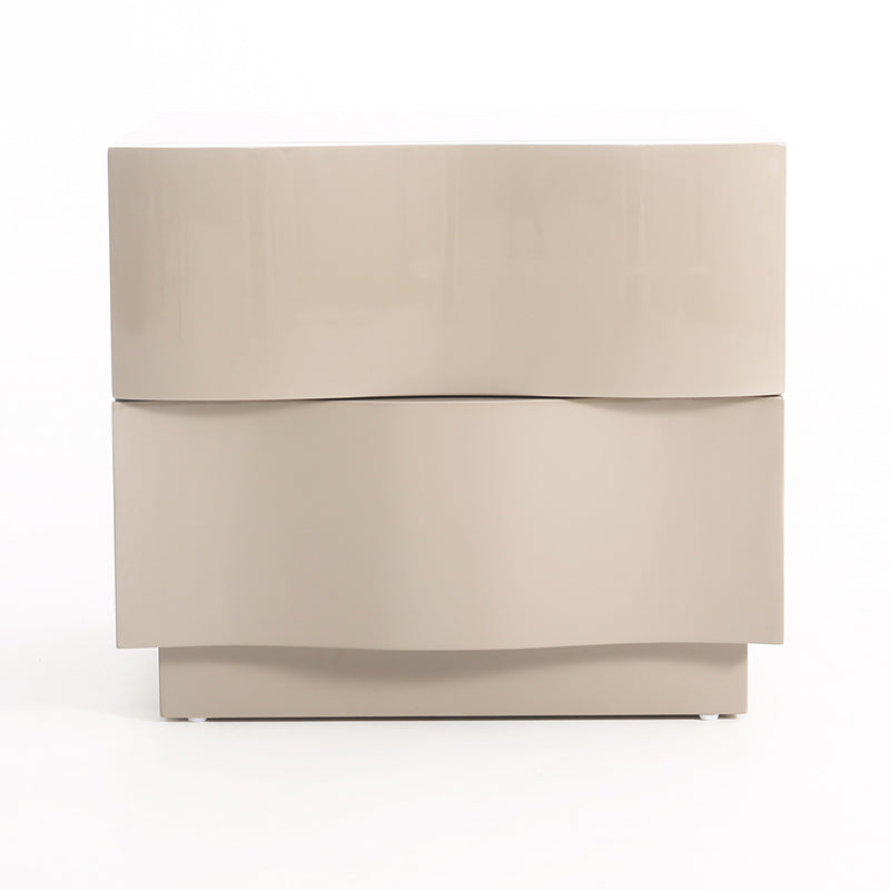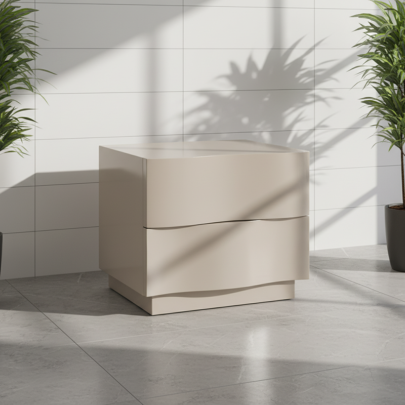Introduce texture and sculptural warmth to your bedroom with this exquisite Contemporary Scandinavian two-drawer nightstand. It features a distinctive 3D wavy drawer design—a compelling visual element that blends artistic elegance with everyday functionality. The piece is finished in a soft beige hue that promotes serenity, while the durable eco-friendly E1 MDF frame and robust solid wood base guarantee long-lasting stability and quality. The two spacious drawers keep your bedside essentials perfectly organized and within easy reach, making this nightstand the ideal accent for modern, Scandinavian, or tranquil neutral interiors.