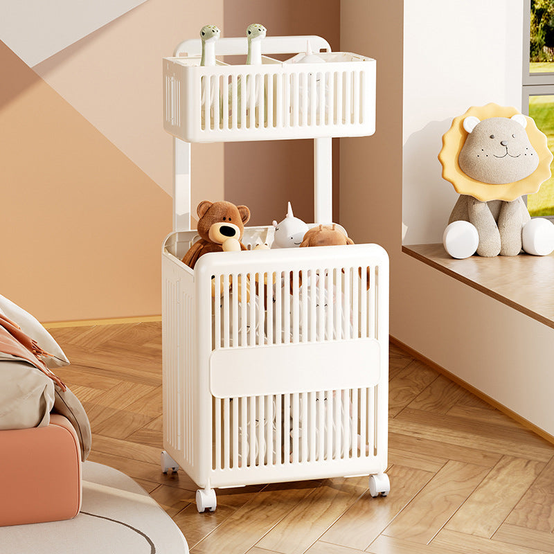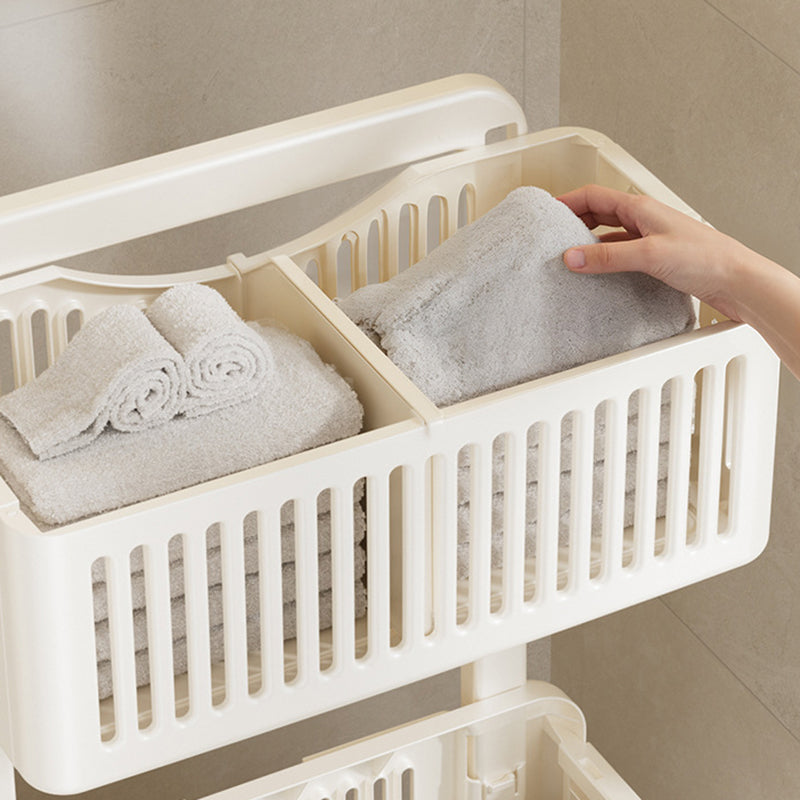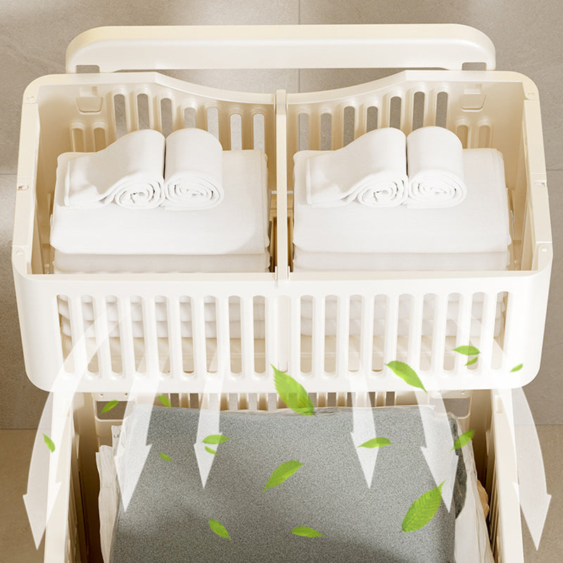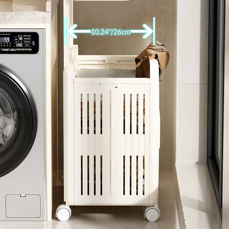 This white PP and ABS mobile side table features a hollow square design with breathable storage, 2-tier capacity, and smooth rolling wheels. With a retractable handle and strong load-bearing structure, it’s perfect for organizing laundry or daily essentials in your living room.