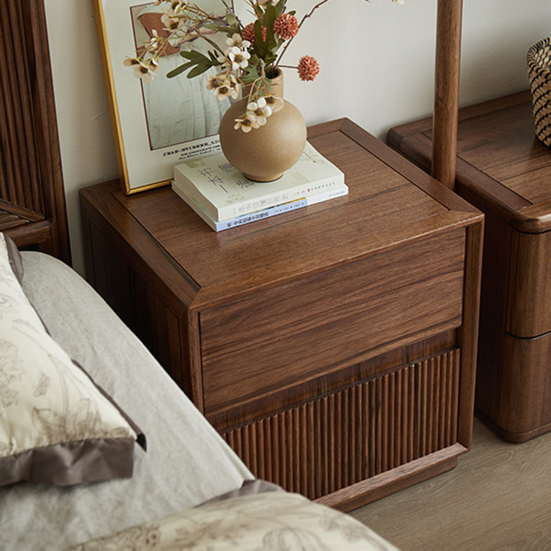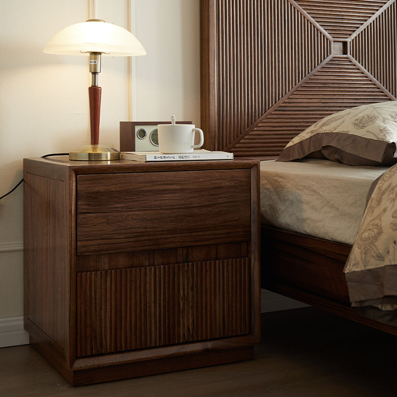 This contemporary Nordic nightstand is expertly crafted from solid South American walnut, showcasing a rich dark walnut finish and a refined rectangular silhouette. With two spacious drawers, it provides durable and highly functional bedroom storage, while the smooth tabletop offers an elegant space for everyday essentials. This premium walnut bedside table brings both strength and modern style to any bedroom interior.