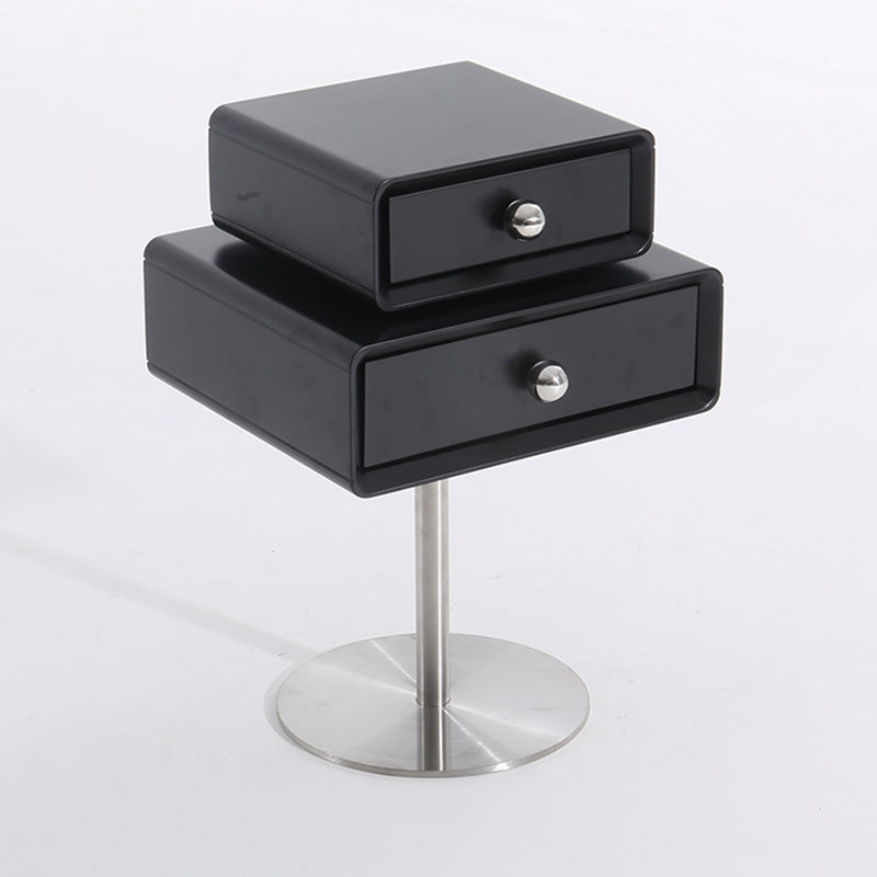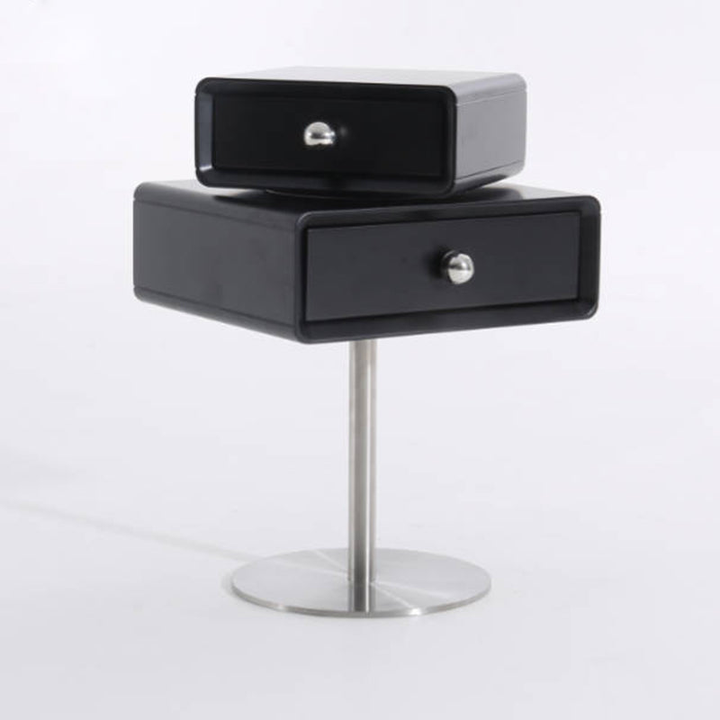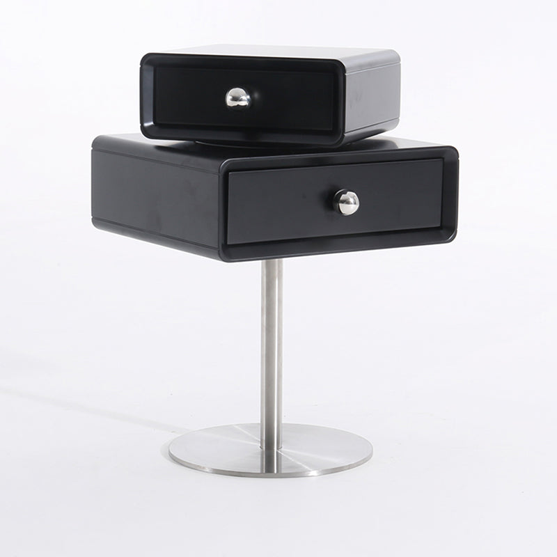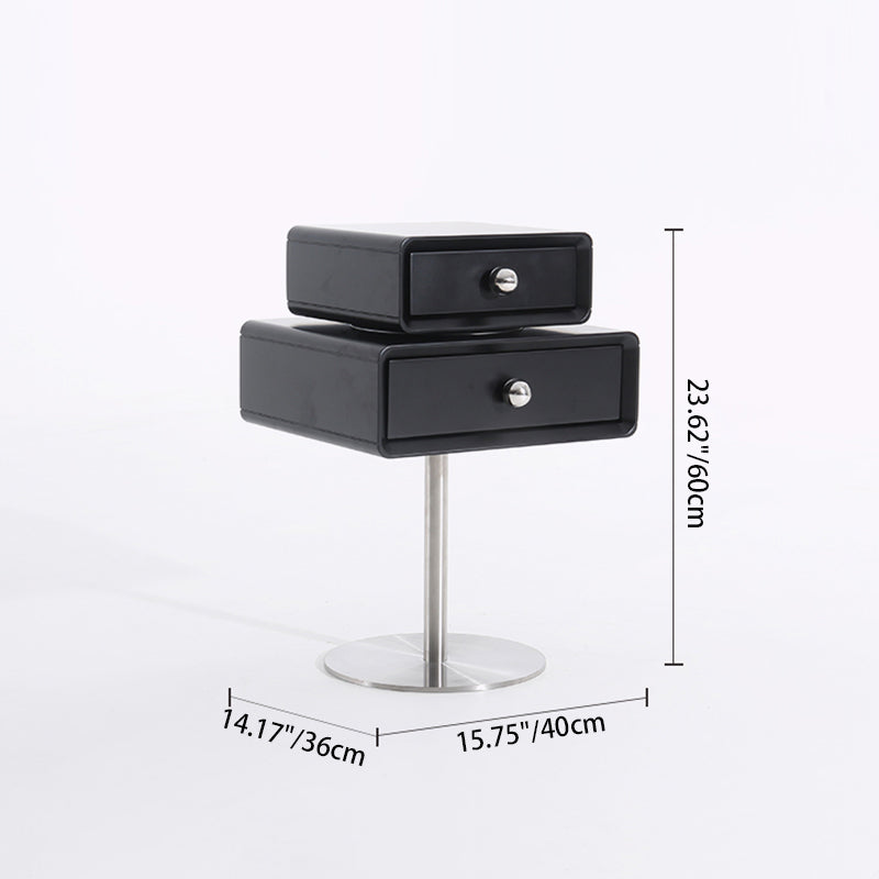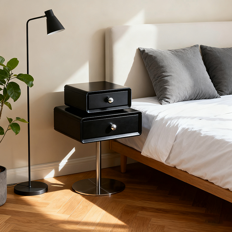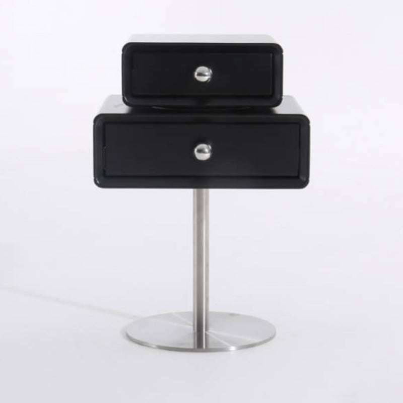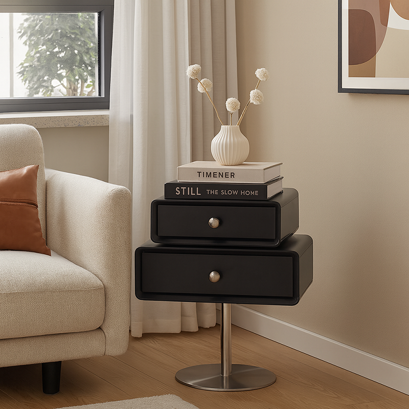 This modern nightstand features a unique floating double-drawer structure, with both drawers able to rotate freely for flexible, playful storage. The body is crafted from eco-friendly MDF combined with solid wood, finished in a deep matte black for a refined contemporary look. A sleek stainless steel column and round base provide stable support while enhancing its sculptural presence.