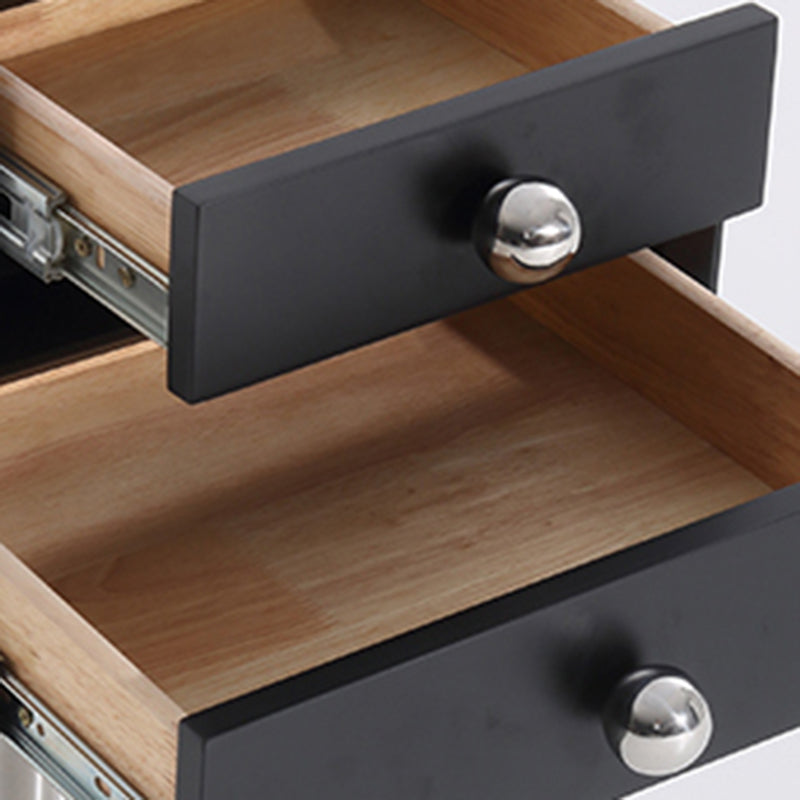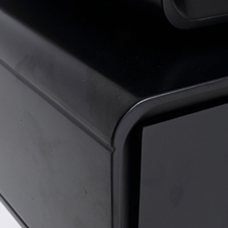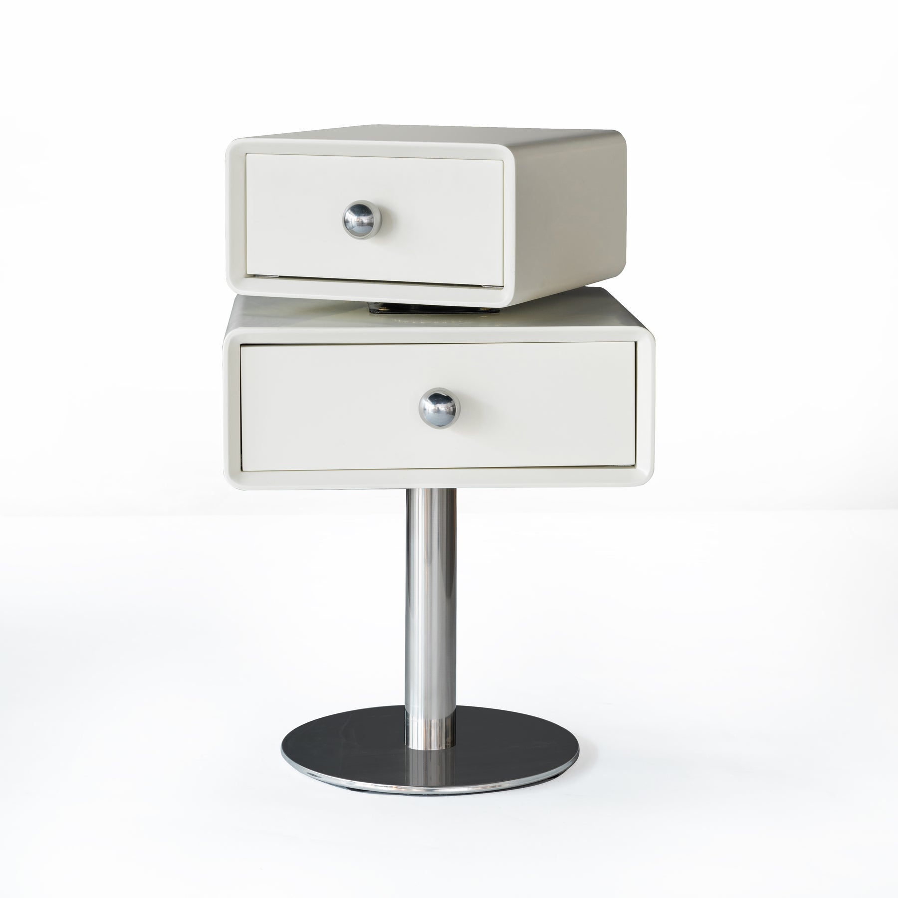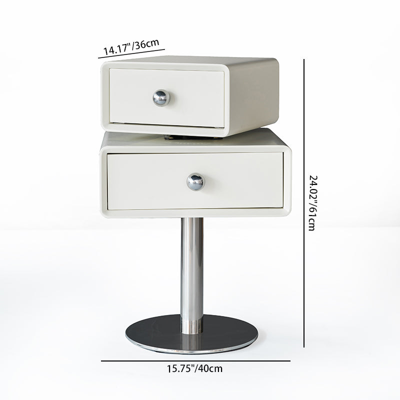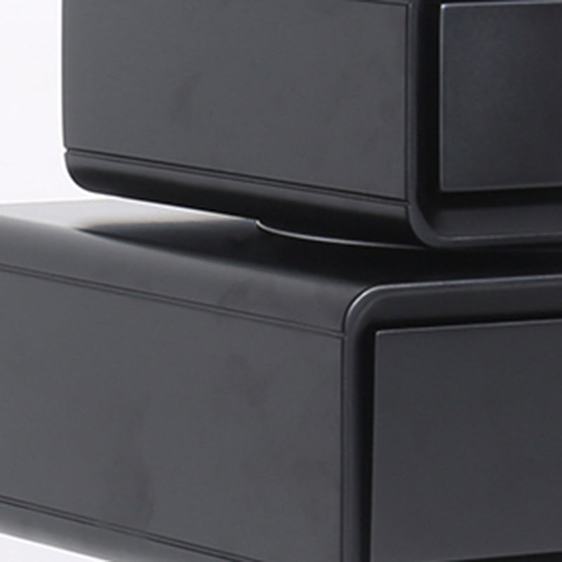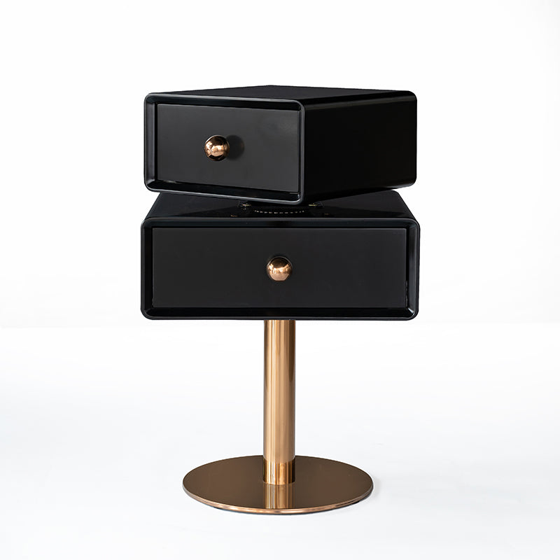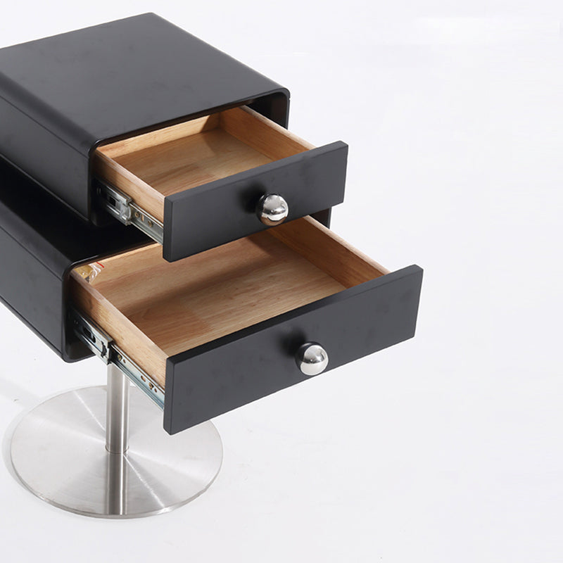This modern nightstand features a unique floating double-drawer structure, with both drawers able to rotate freely for flexible, playful storage. The body is crafted from eco-friendly MDF combined with solid wood, finished in a deep matte black for a refined contemporary look. A sleek stainless steel column and round base provide stable support while enhancing its sculptural presence.