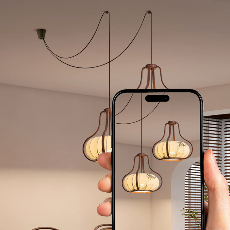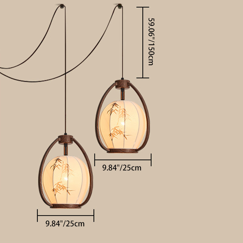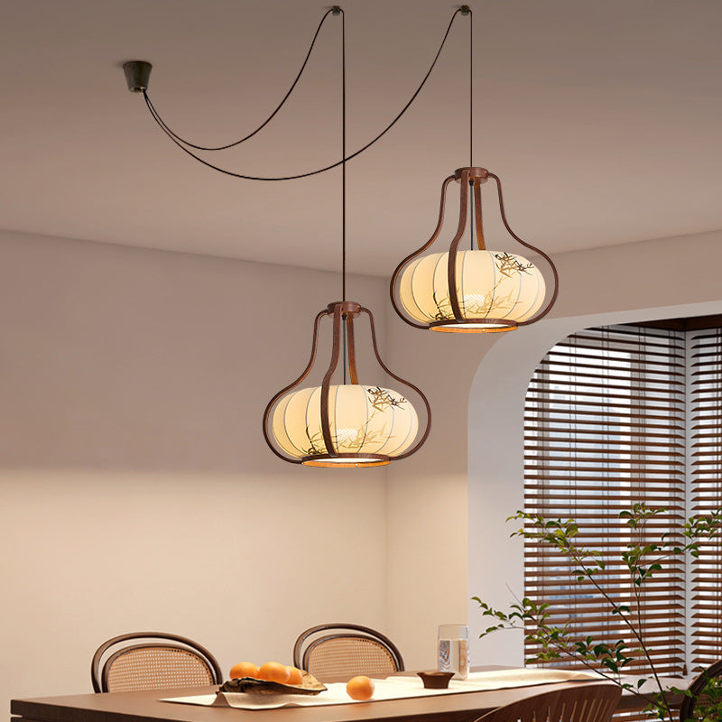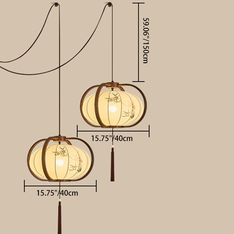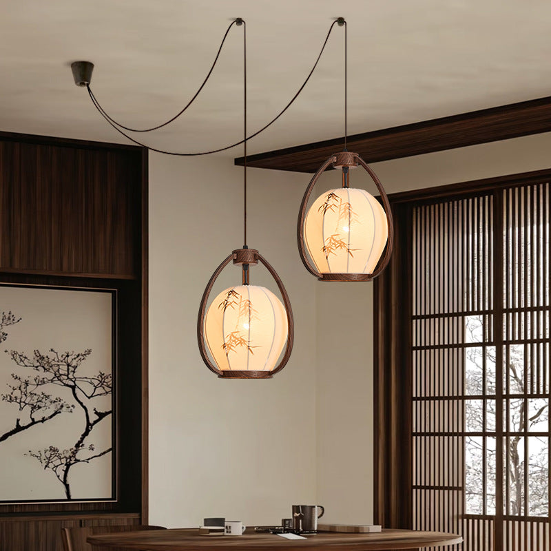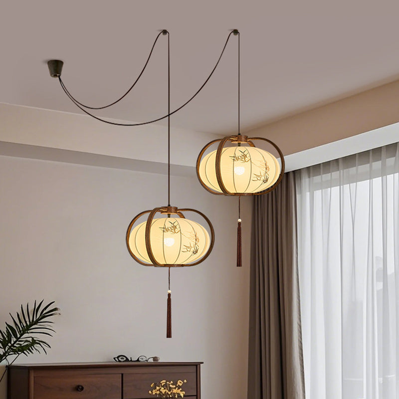 This traditional Chinese lantern-style chandelier features an iron frame with soft fabric in warm walnut and beige tones, creating a serene and artistic ambiance. Designed with an adjustable hanging cord and dual-light structure, it is perfect for enhancing living rooms, bedrooms, and dining areas with a calm, Zen-inspired atmosphere.