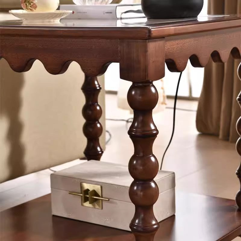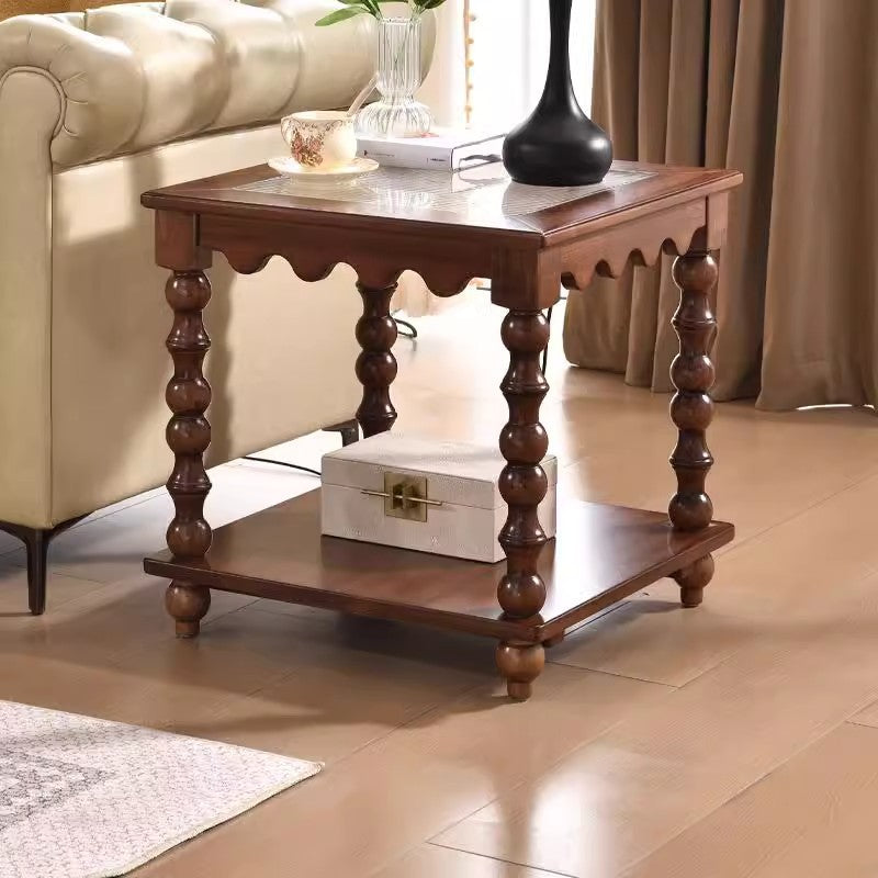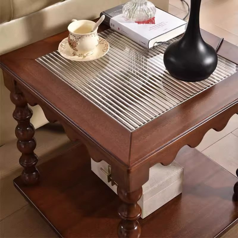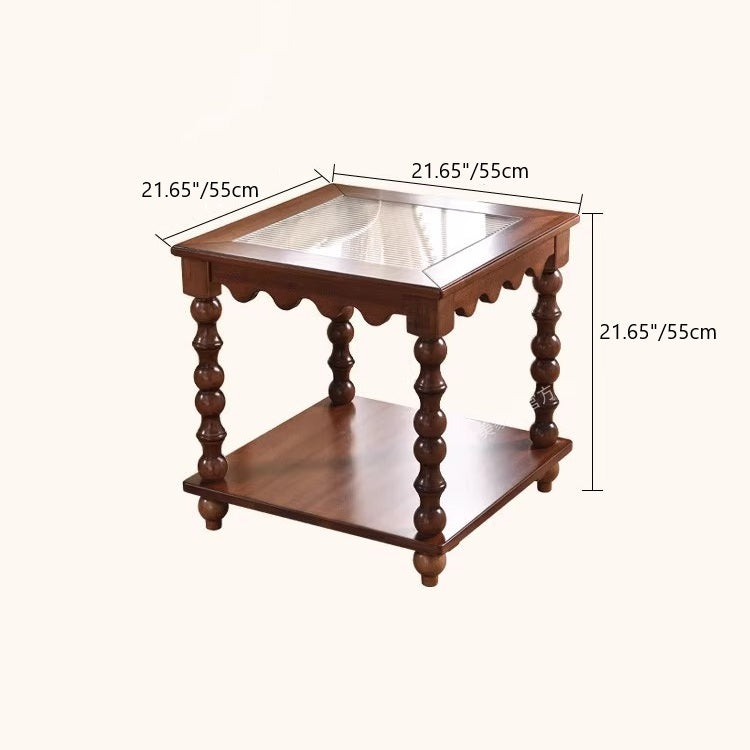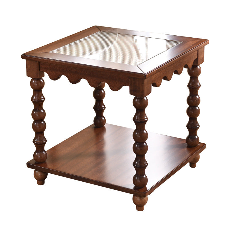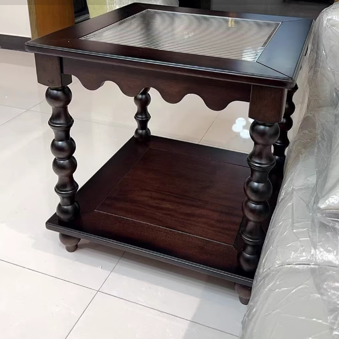 This Traditional Chinese–style coffee table combines tempered glass, solid rubberwood, and engineered solid wood board construction, finished in a warm vintage tone for a refined, light-luxury look. Featuring a 2-tier square design with Roman column–inspired beaded legs, it offers stable support, smooth rounded edges, and practical storage—ideal as a movable sofa side coffee table for living rooms, boutique apartments, and elegant home interiors.