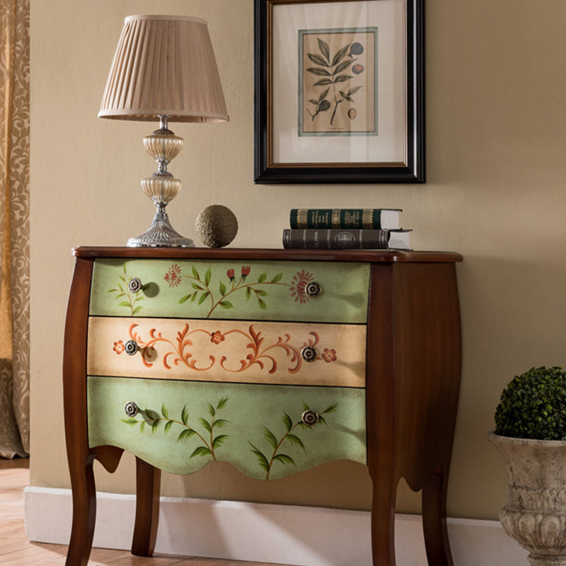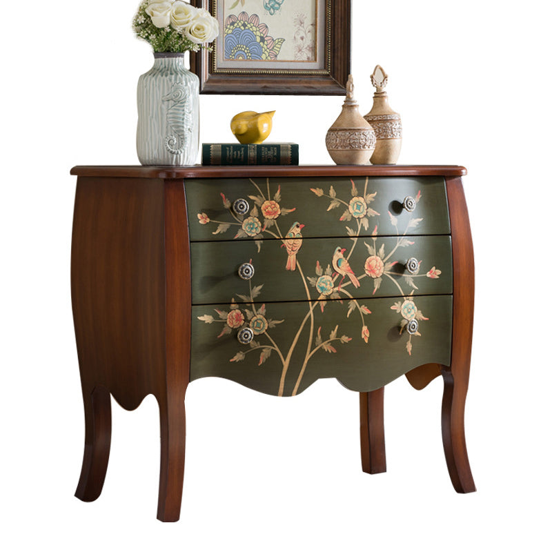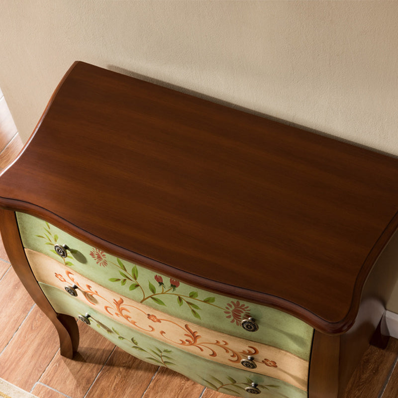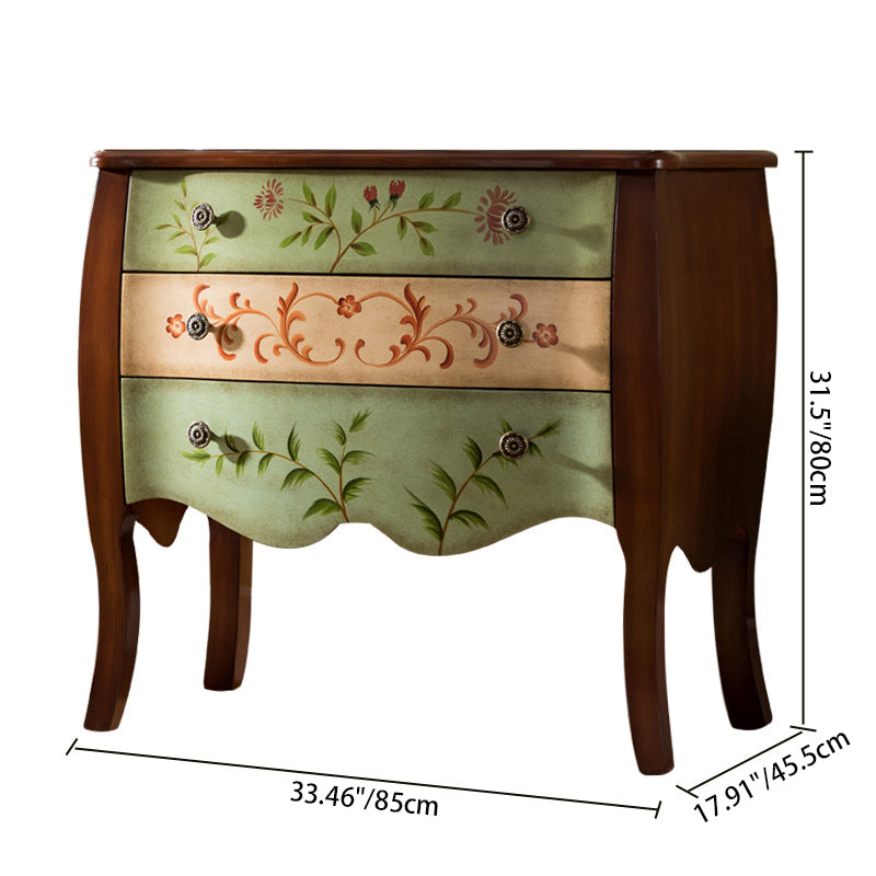 This Traditional Chinese storage cabinet pairs MDF and Birch Wood in a clean rectangular design, ideal for living rooms or bedrooms. It offers 3 roomy drawers for generous storage, features hand-painted decorative details in light and deep green hues, and stands on sturdy solid wood legs for dependable stability—blending charm with functionality.