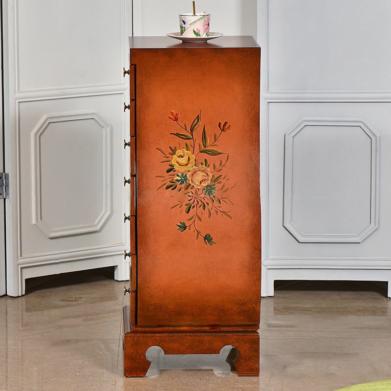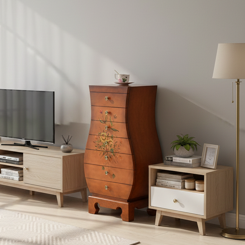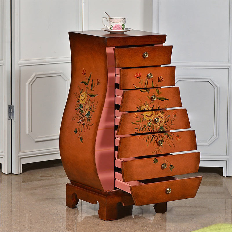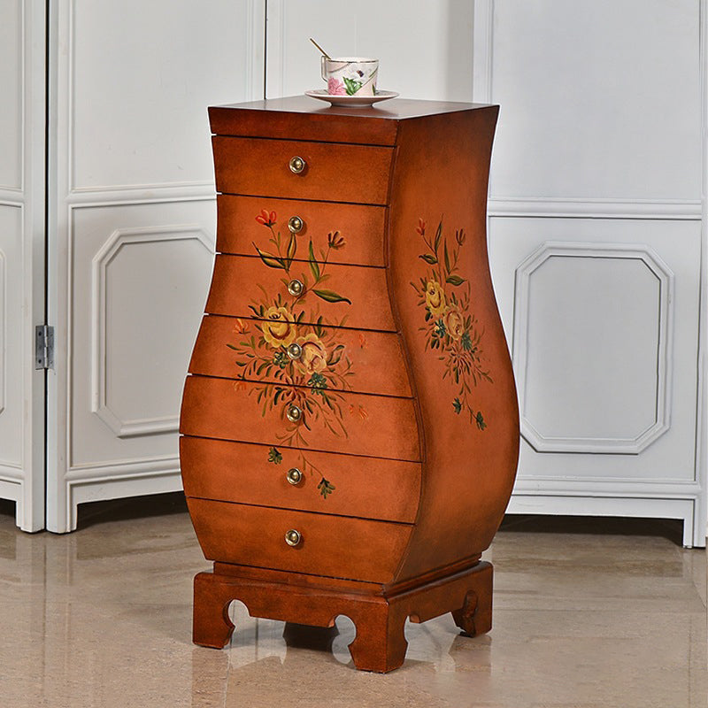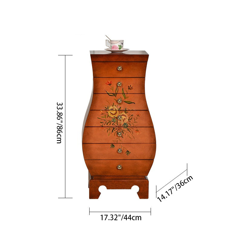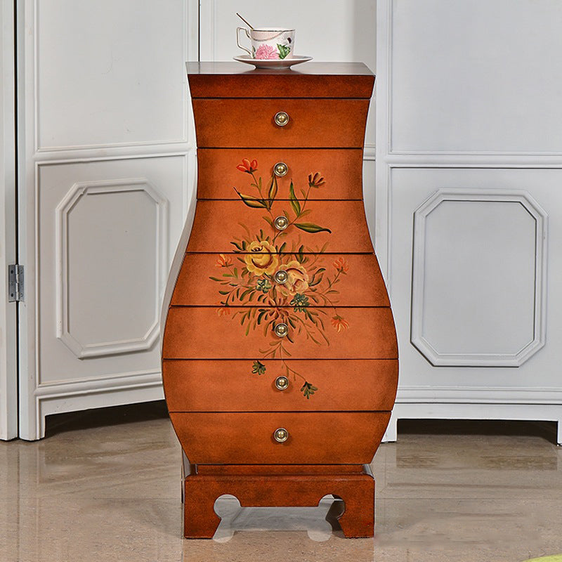 This Traditional Chinese-style storage cabinet blends MDF and birch materials into a unique vase-shaped silhouette—ideal for your living room or bedroom. Featuring 7 drawers for multi-layered organized storage, it stands on sturdy, solid birch legs and boasts hand-painted decorative details, all in a warm brown finish. A functional, eye-catching piece to elevate your space.