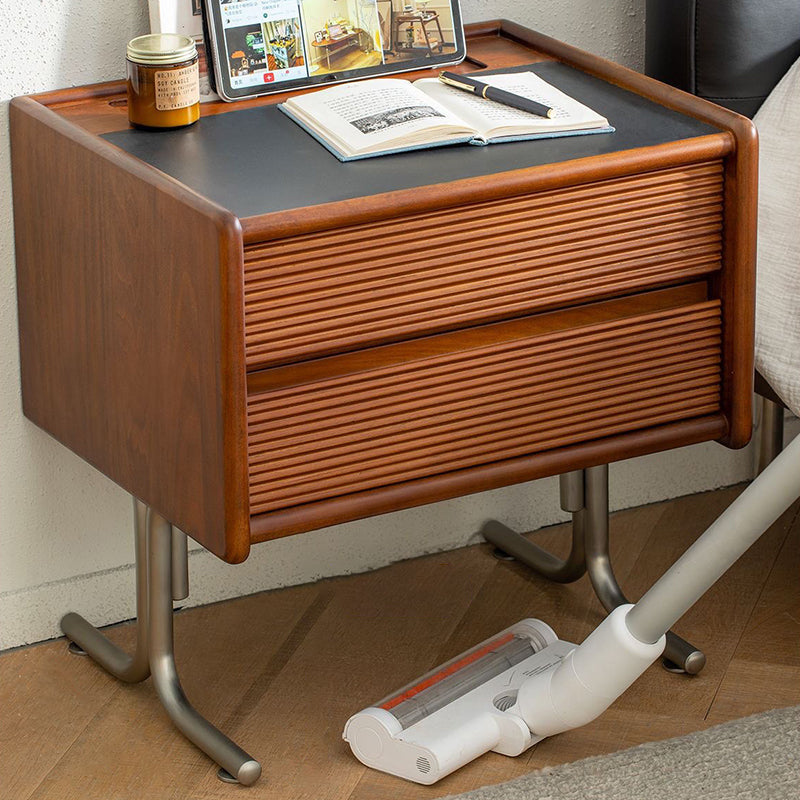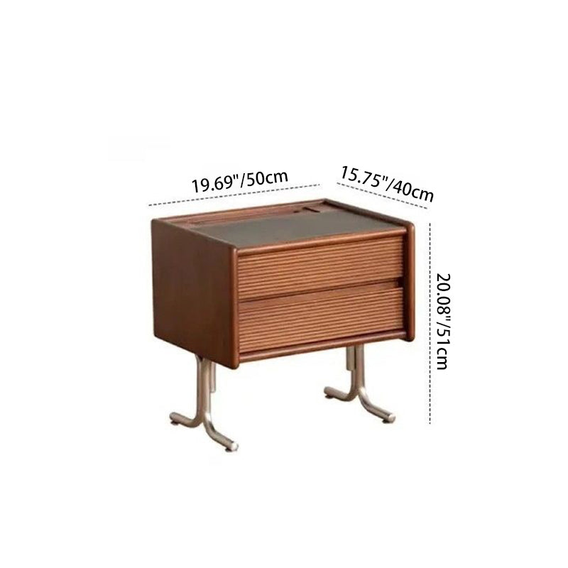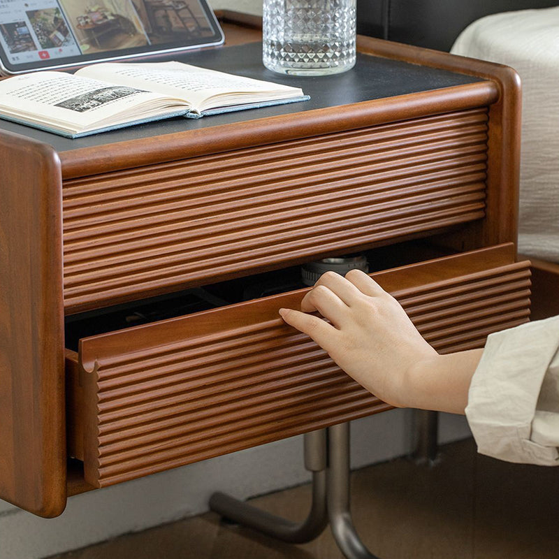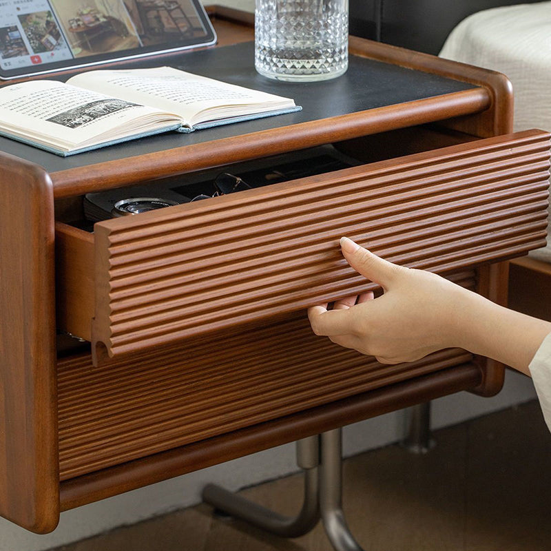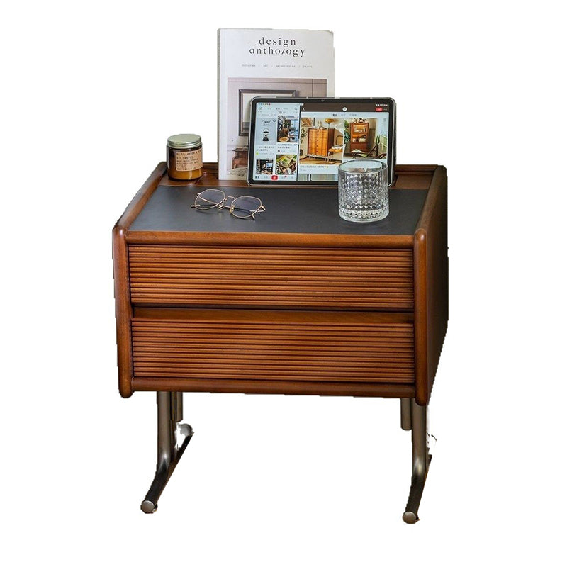 This vintage-tone nightstand is crafted from pine wood, stainless steel, and sintered stone, featuring a wavy square design with 2 drawers for organized bedside storage. Its clean tabletop, hidden pull handles, and durable, stable construction make it a refined Traditional Chinese–style addition to any bedroom.