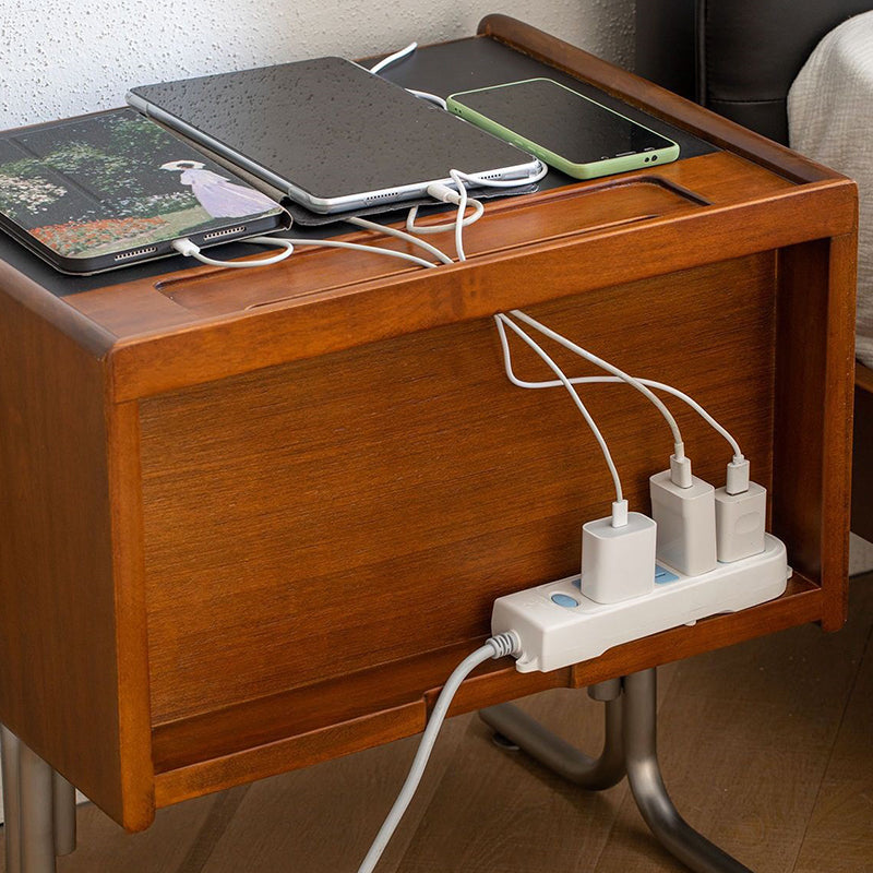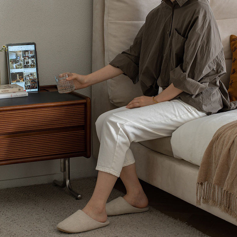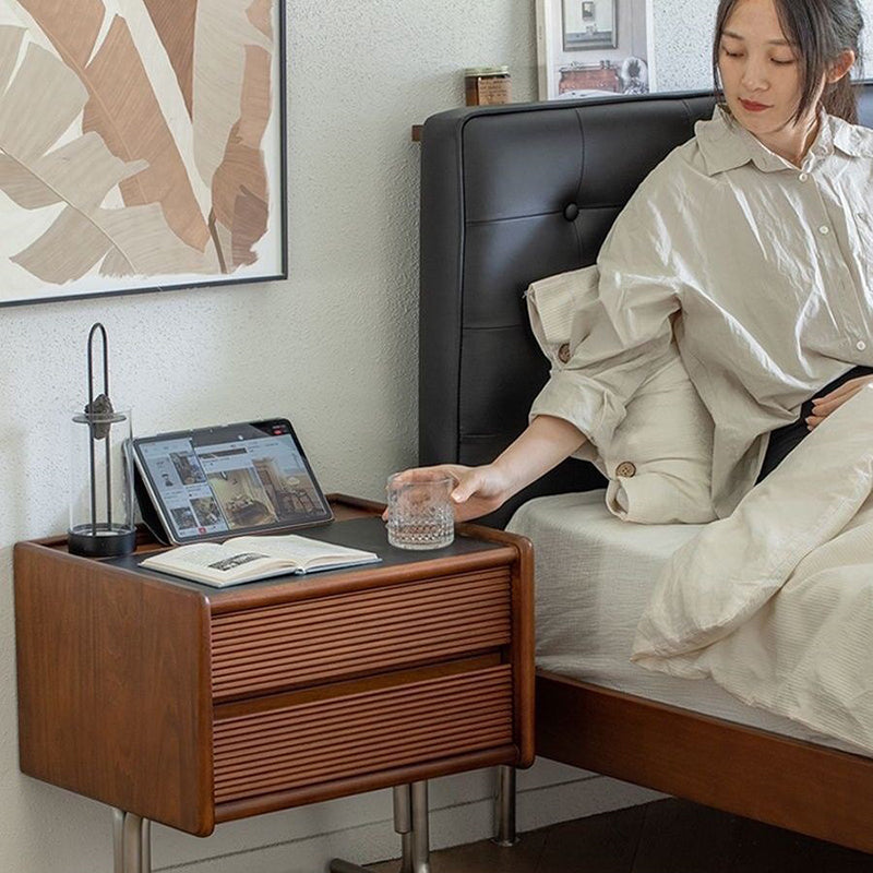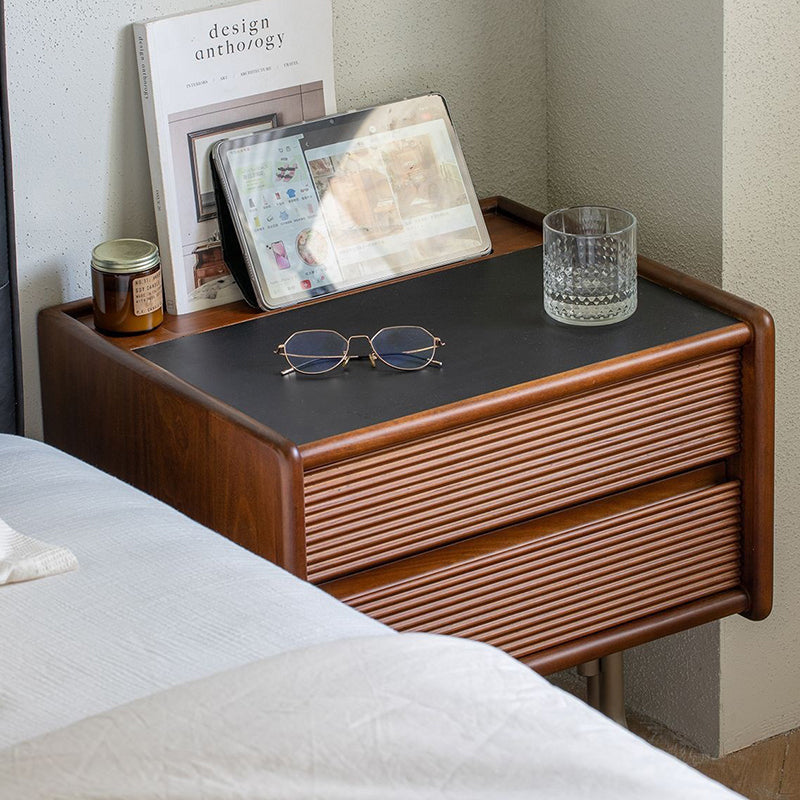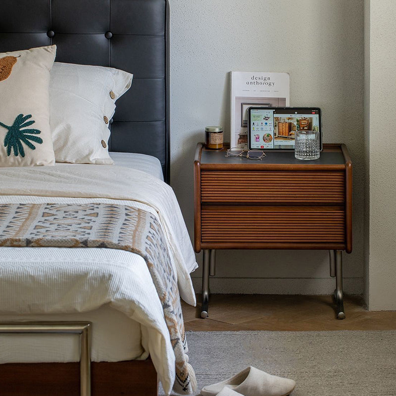 This vintage-tone nightstand is crafted from pine wood, stainless steel, and sintered stone, featuring a wavy square design with 2 drawers for organized bedside storage. Its clean tabletop, hidden pull handles, and durable, stable construction make it a refined Traditional Chinese–style addition to any bedroom.
