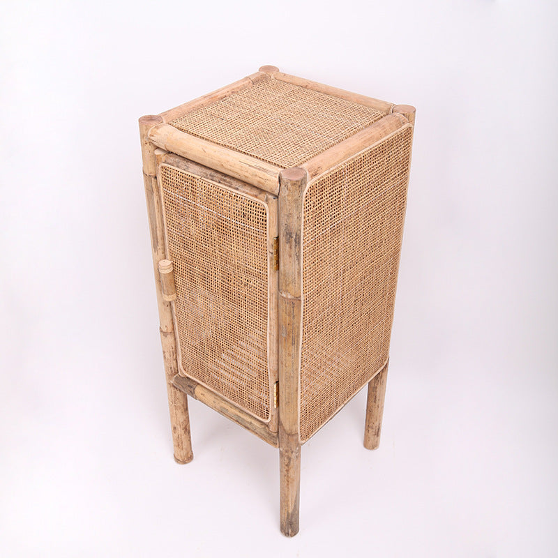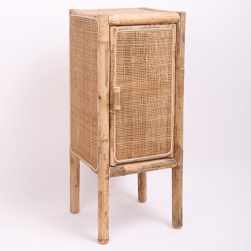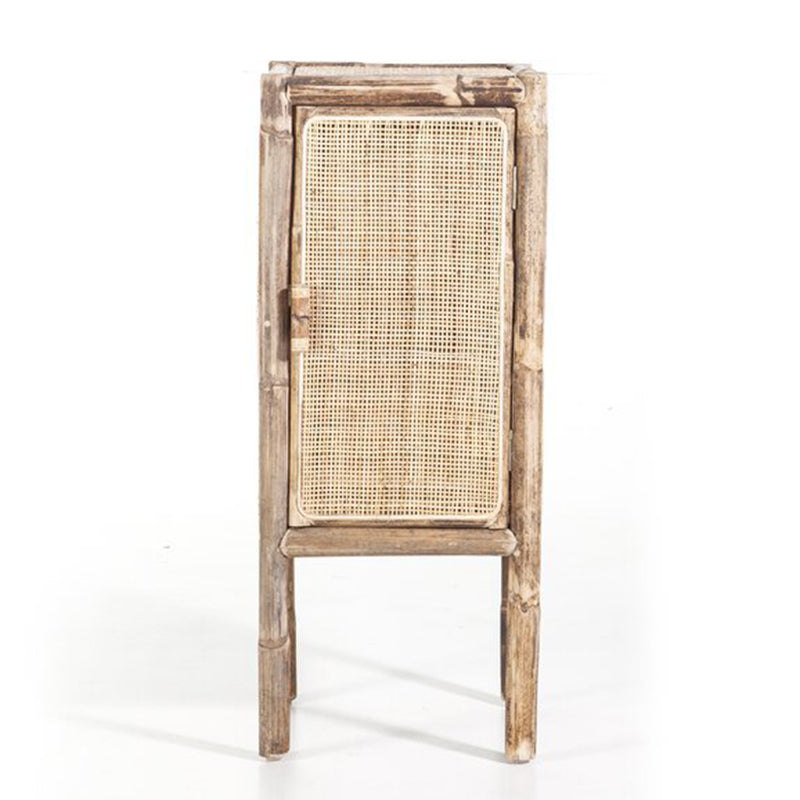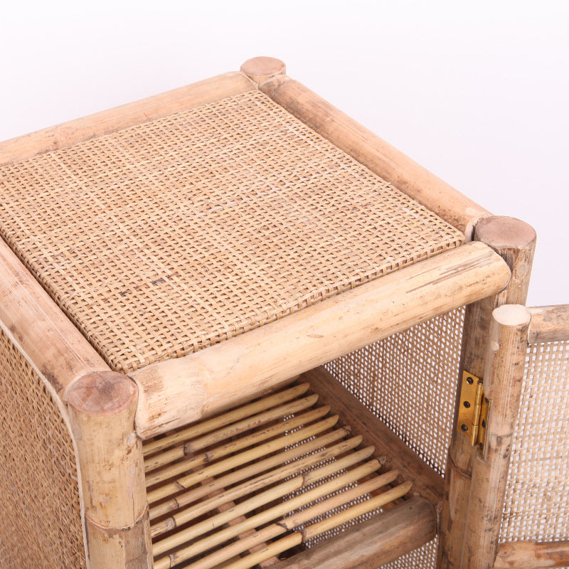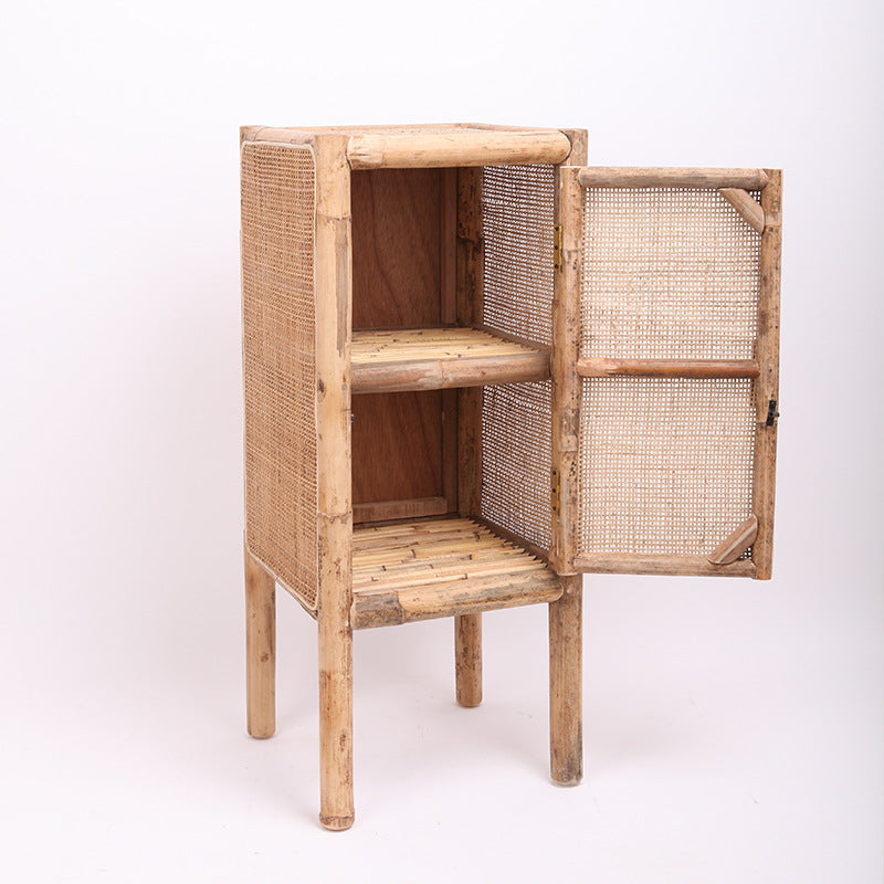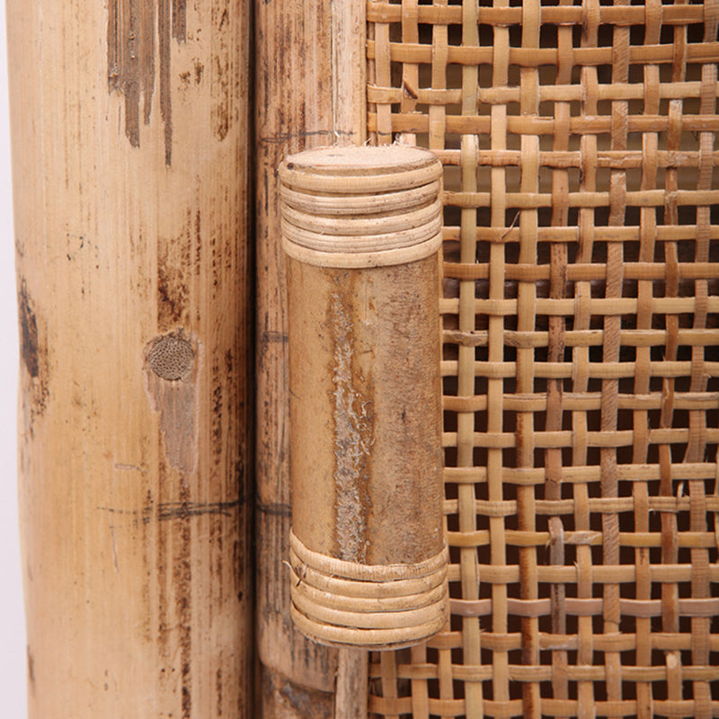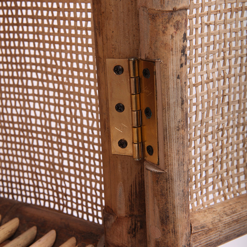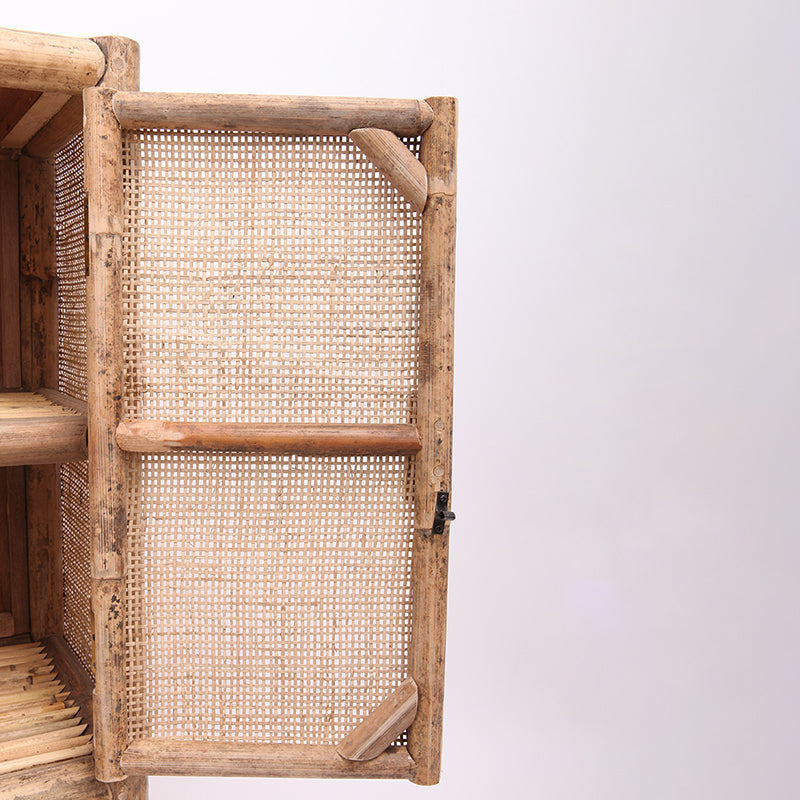Handmade Indonesian Rattan Door: Features an authentic rattan mesh panel that provides natural ventilation and a visual lightness, perfect for storing books or delicate linens.