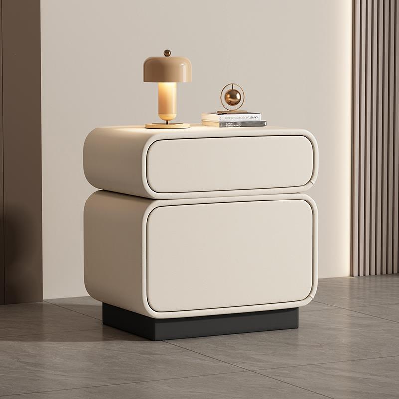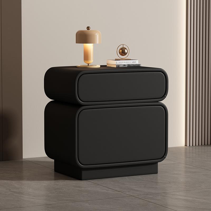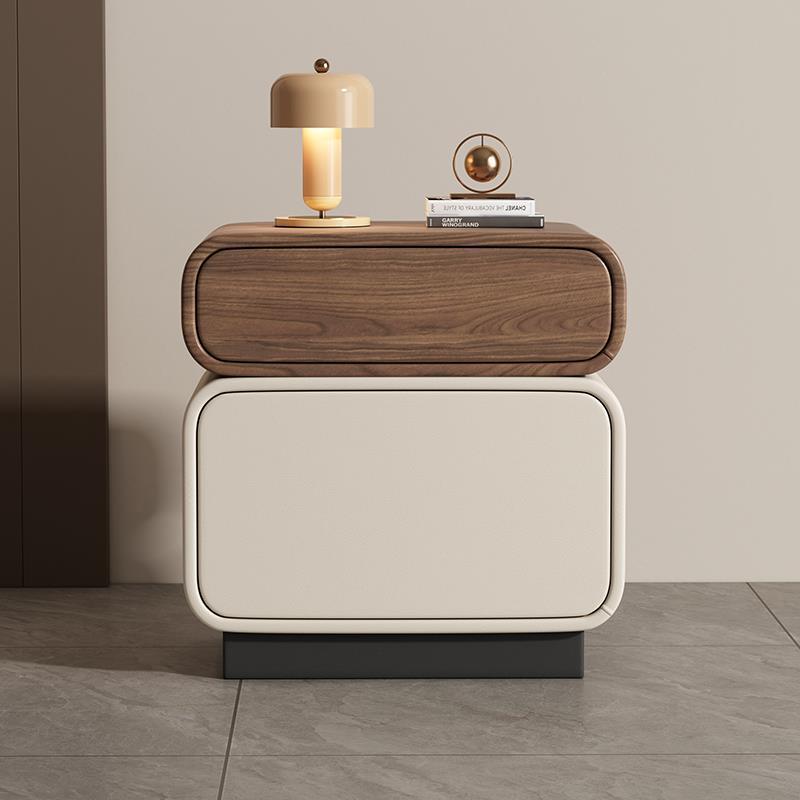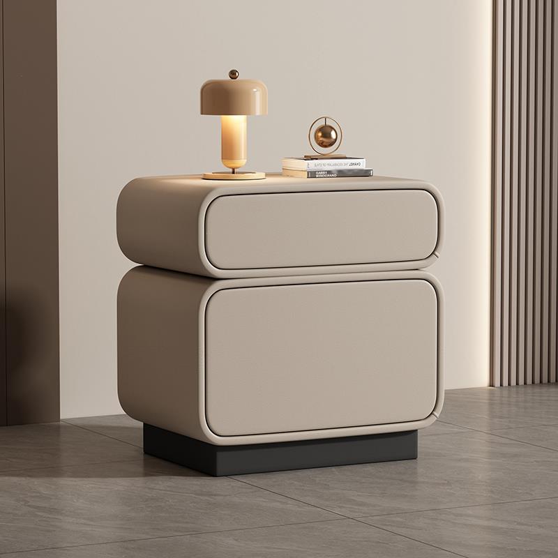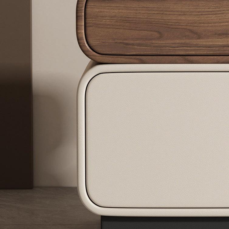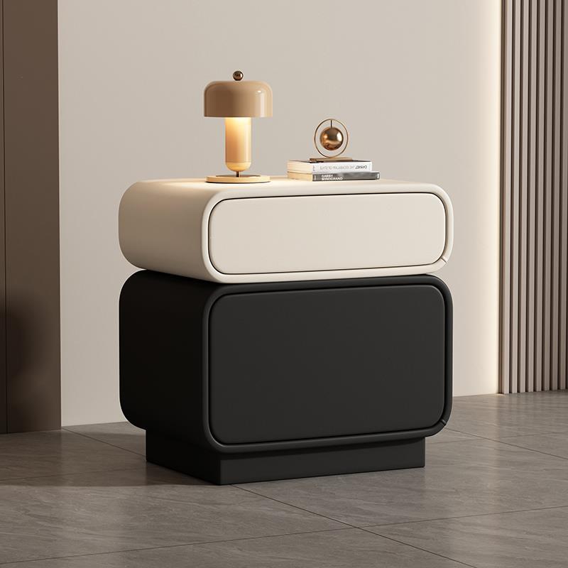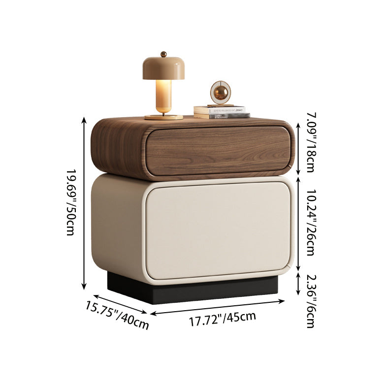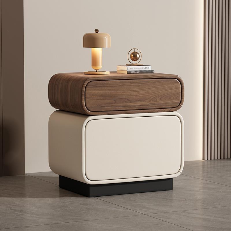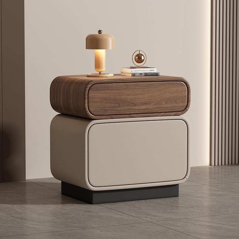 This traditional Chinese–inspired luxury nightstand features a refined blend of solid wood and faux leather, highlighted by a rounded square silhouette that adds softness and safety to modern bedrooms. Designed with two push-to-open drawers, smooth rebound slides, and anti-collision curved edges, it provides practical bedside storage in walnut, beige, khaki, light gray, and black while maintaining a clean, elegant look ideal for contemporary bedroom interiors.