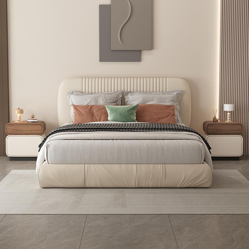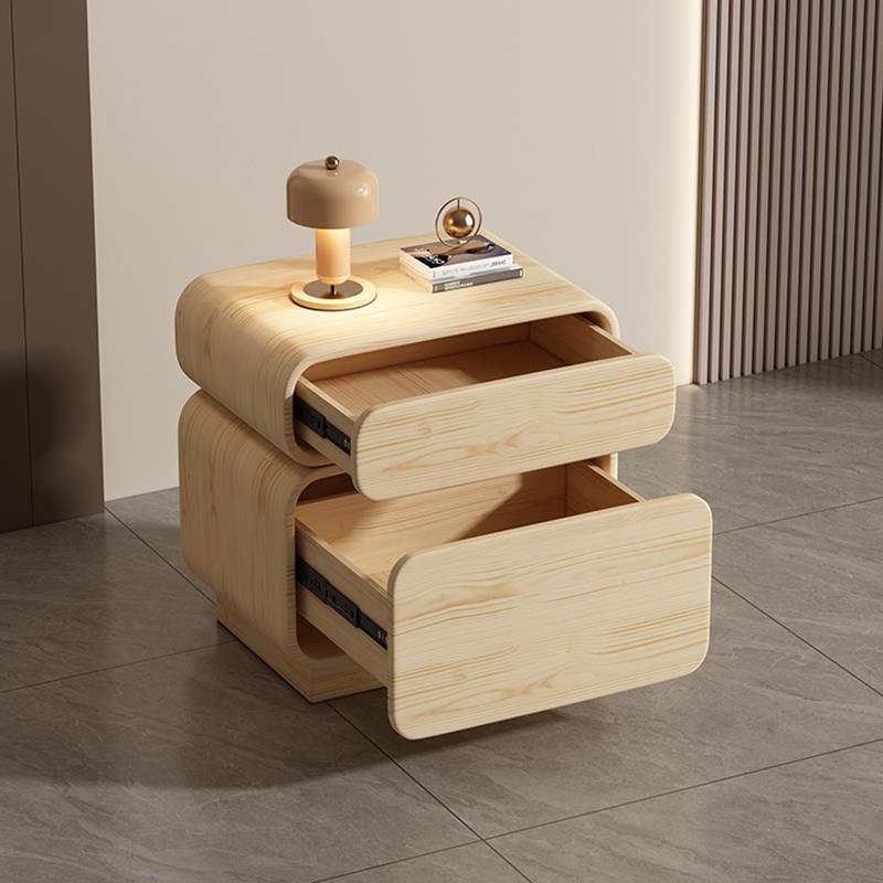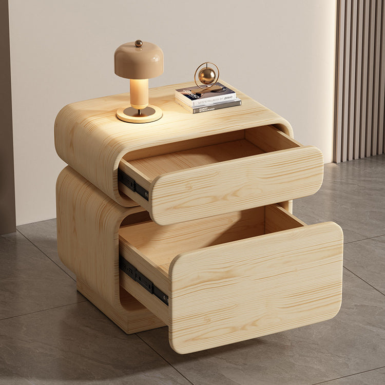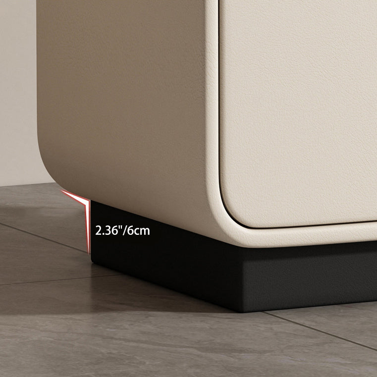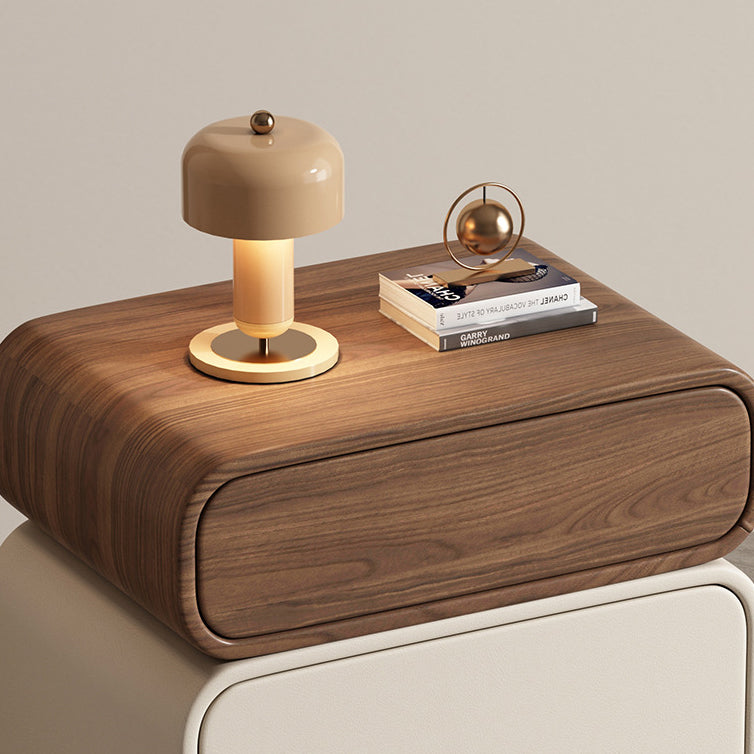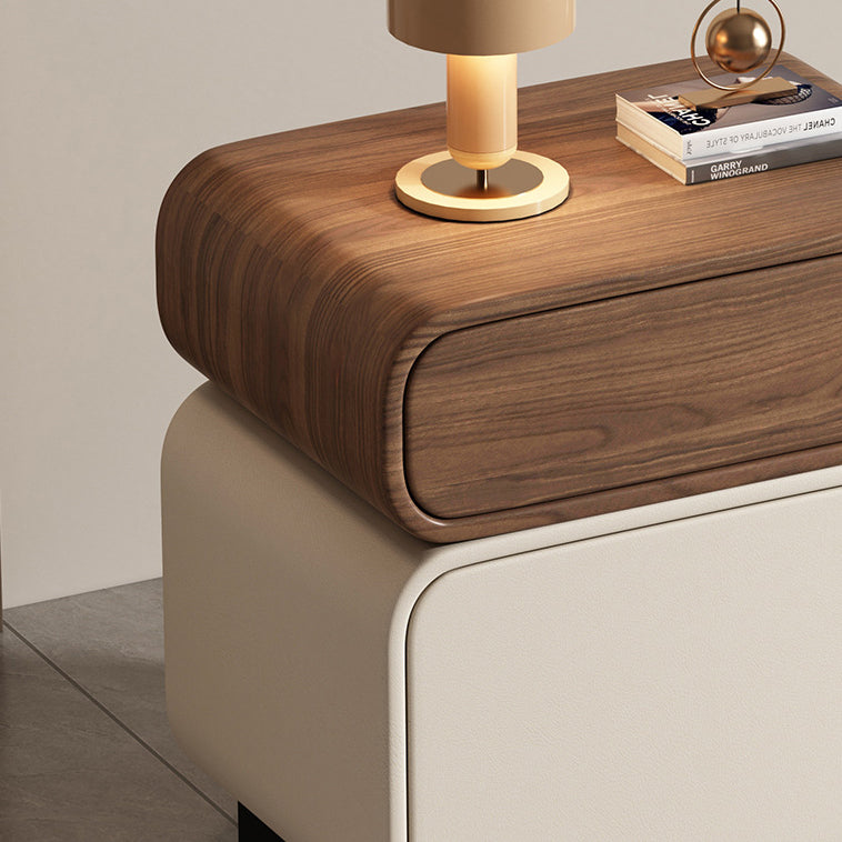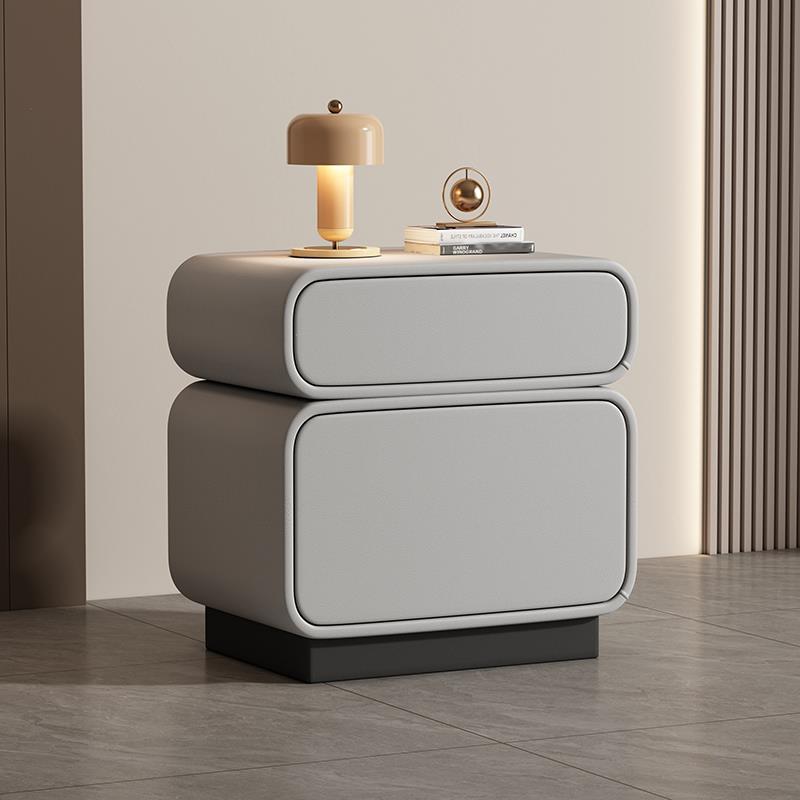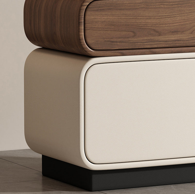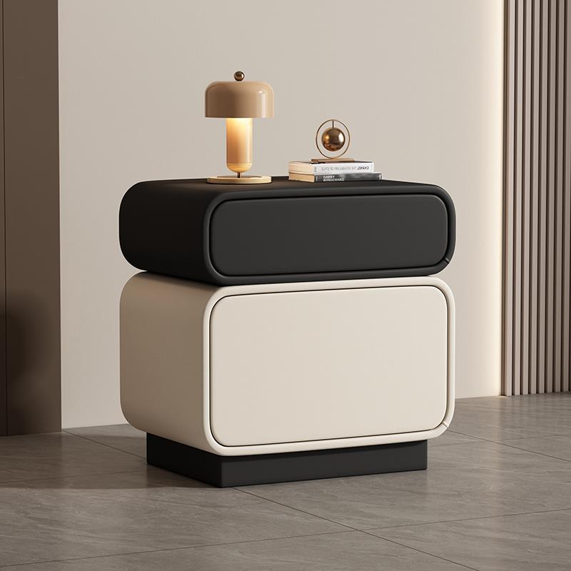 This traditional Chinese–inspired luxury nightstand features a refined blend of solid wood and faux leather, highlighted by a rounded square silhouette that adds softness and safety to modern bedrooms. Designed with two push-to-open drawers, smooth rebound slides, and anti-collision curved edges, it provides practical bedside storage in walnut, beige, khaki, light gray, and black while maintaining a clean, elegant look ideal for contemporary bedroom interiors.