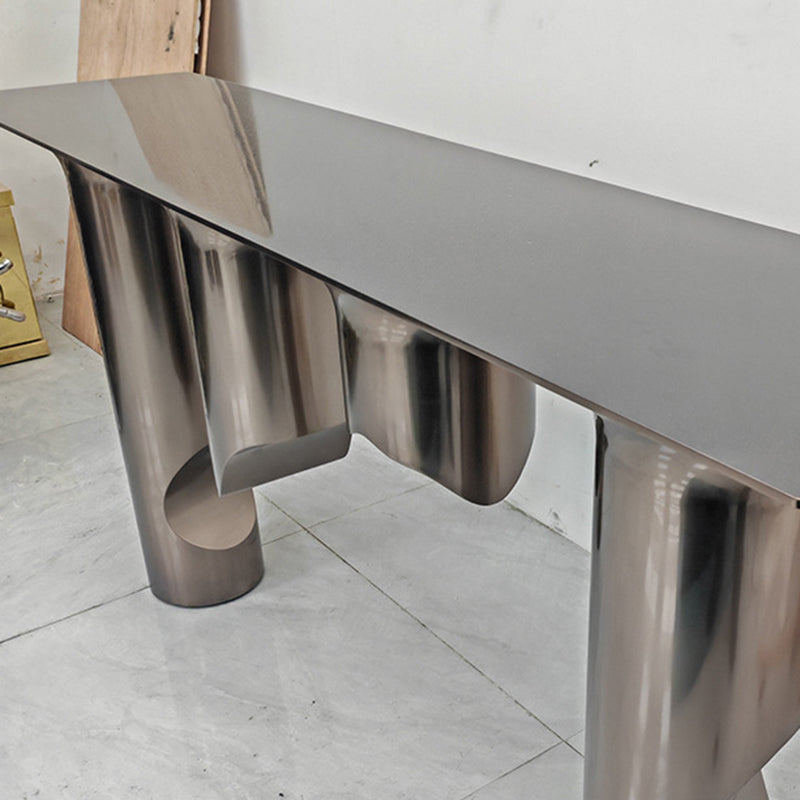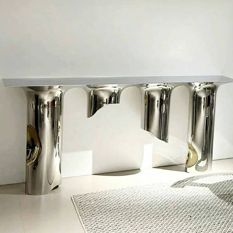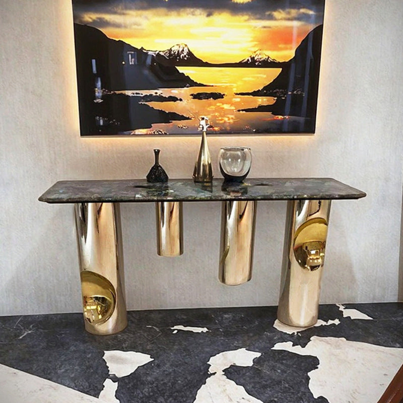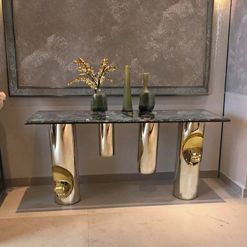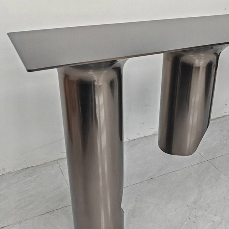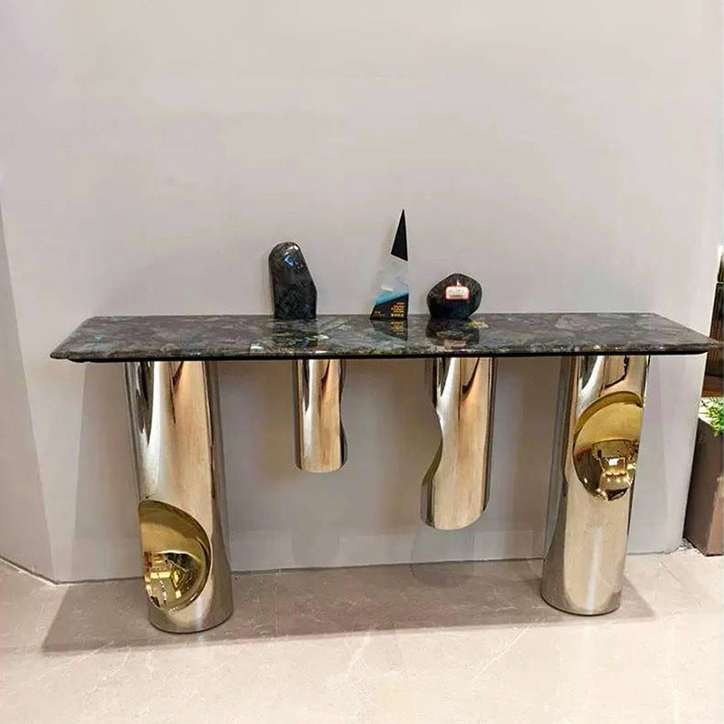 This black and silver contemporary console table features a refined marble top with natural veining and a sturdy stainless steel frame, offering durability and modern elegance. Its single-shelf design provides functional display space, making it perfect for entryways, living rooms, or bedrooms.