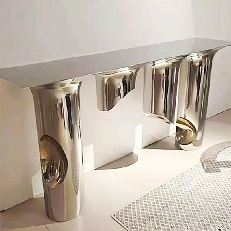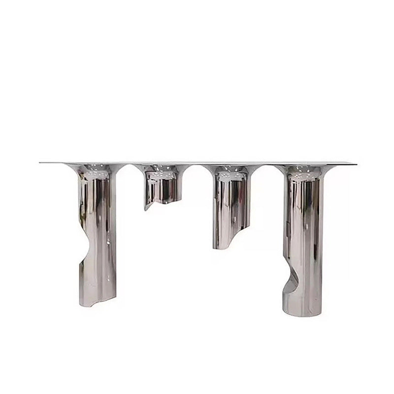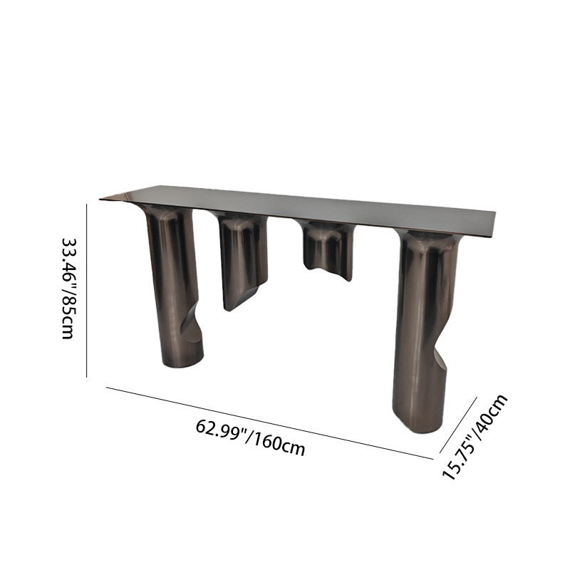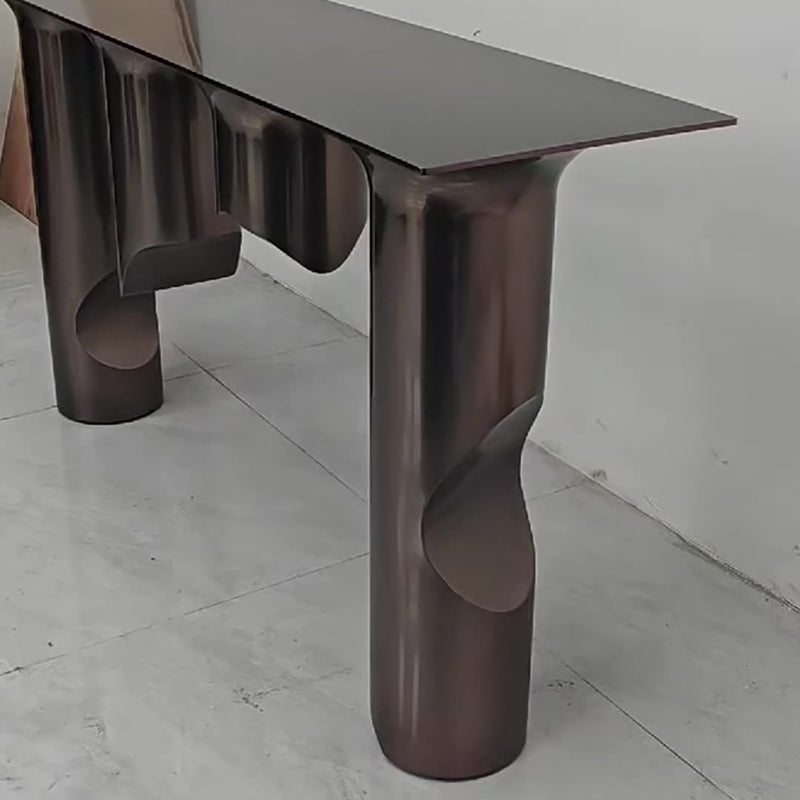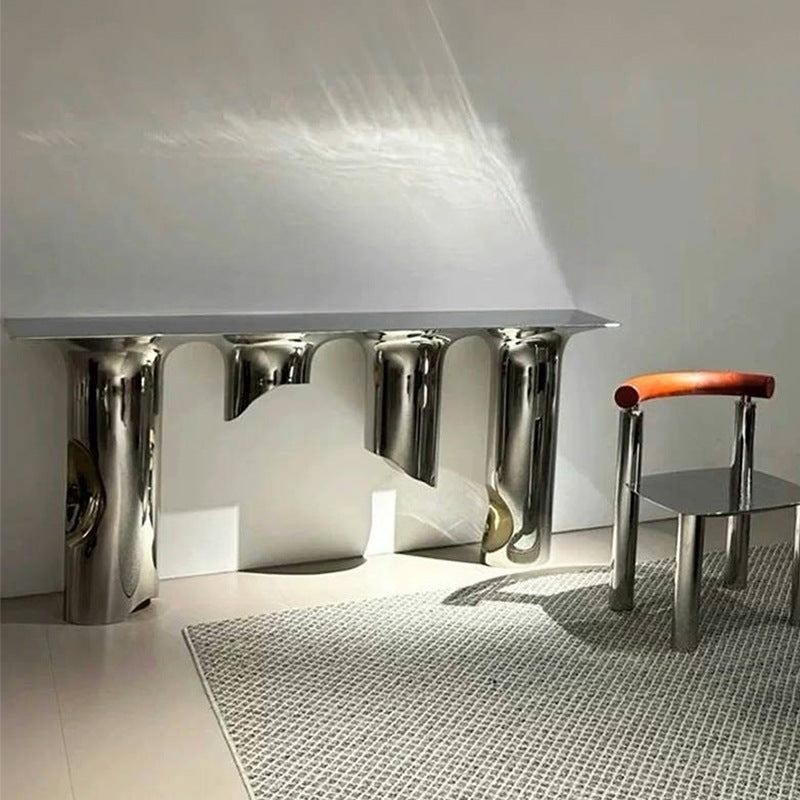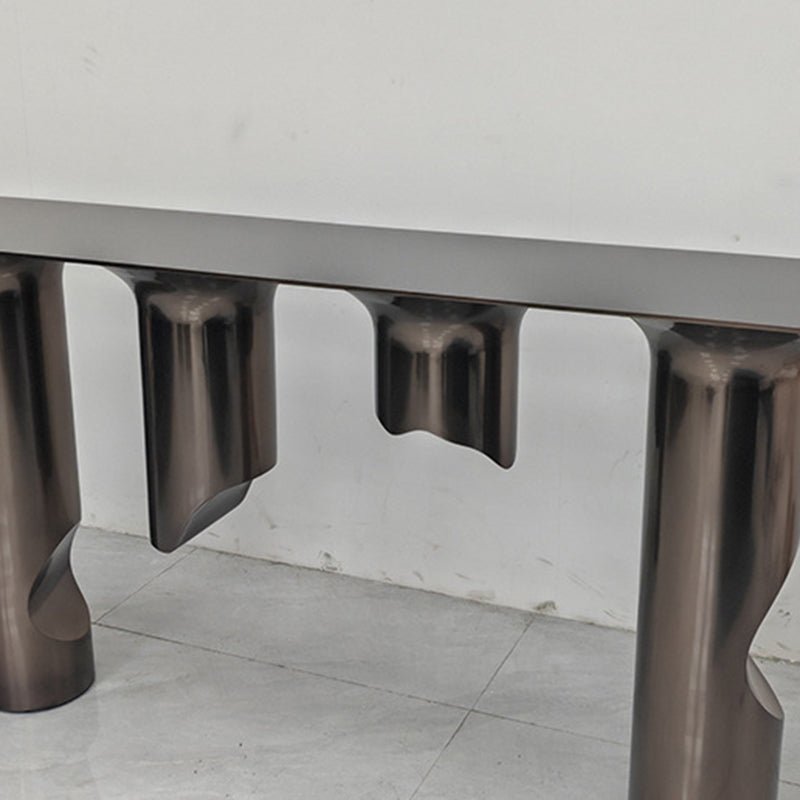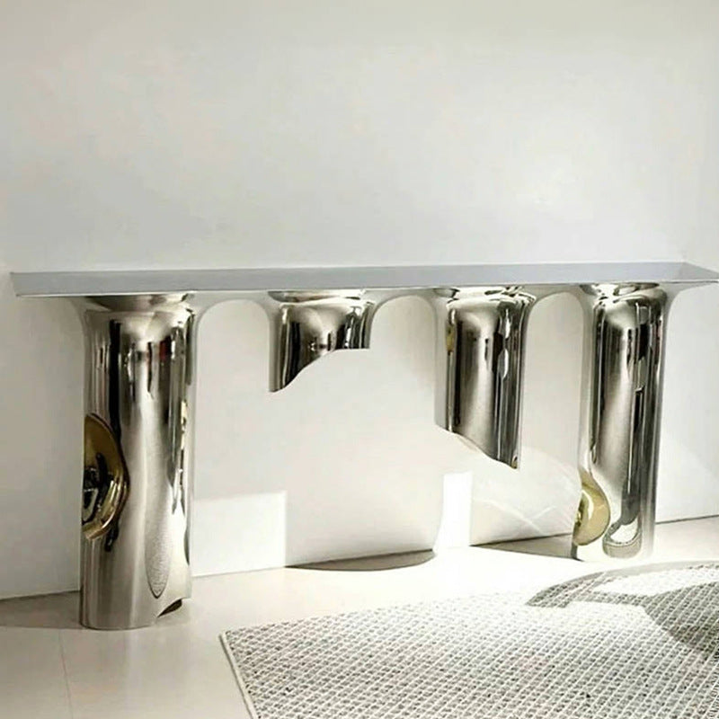 This black and silver contemporary console table features a refined marble top with natural veining and a sturdy stainless steel frame, offering durability and modern elegance. Its single-shelf design provides functional display space, making it perfect for entryways, living rooms, or bedrooms.
