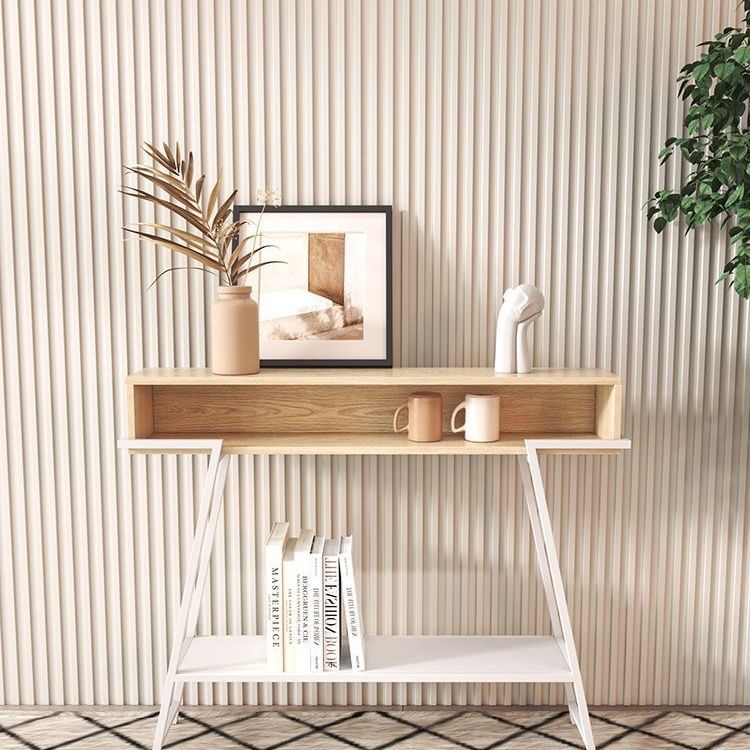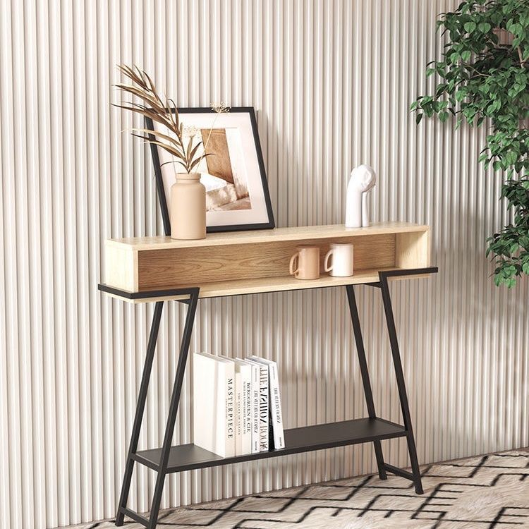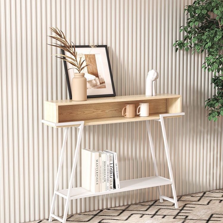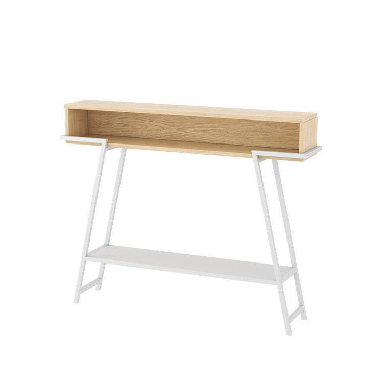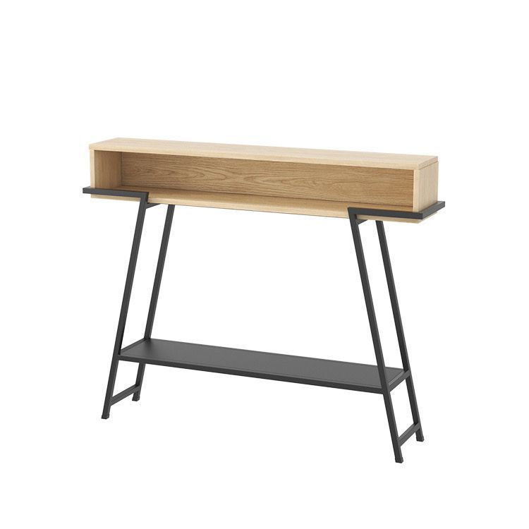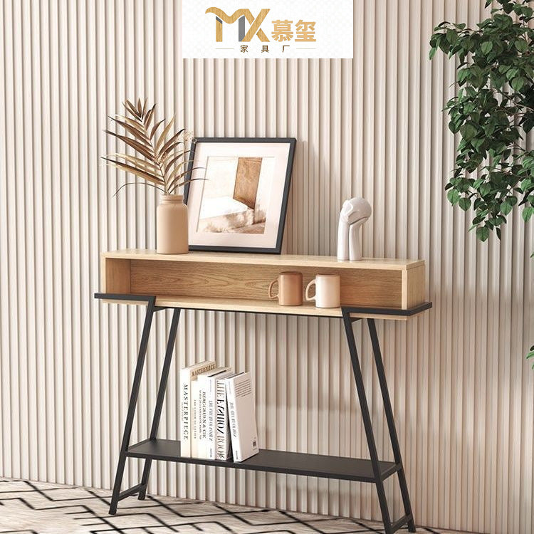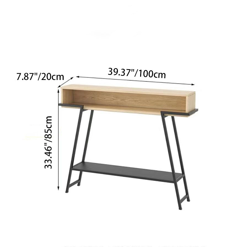 This modern minimalist entryway console table features a rectangular solid wood tabletop supported by a sturdy iron frame, designed with a practical 3-tier open storage structure. Available in black or white, it provides a large-capacity surface and stable iron construction, ideal for use in entryways, living rooms, or bedrooms.