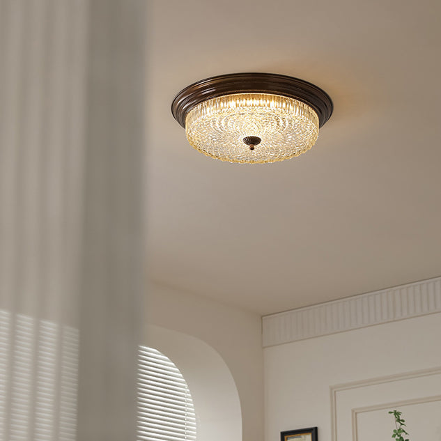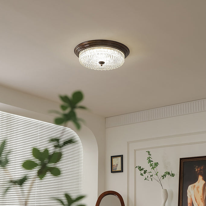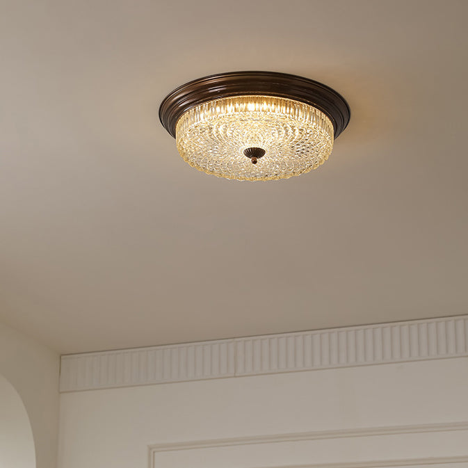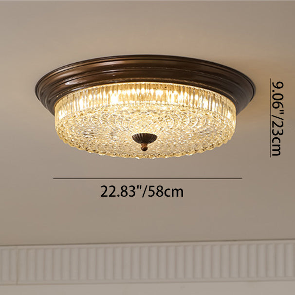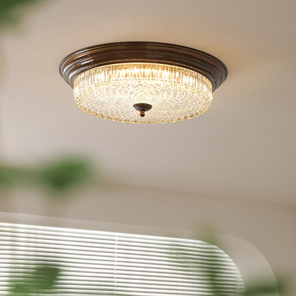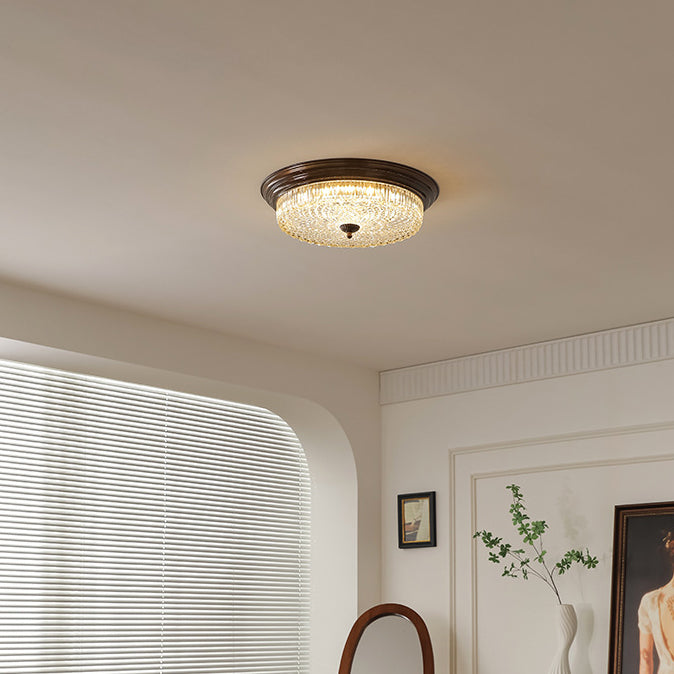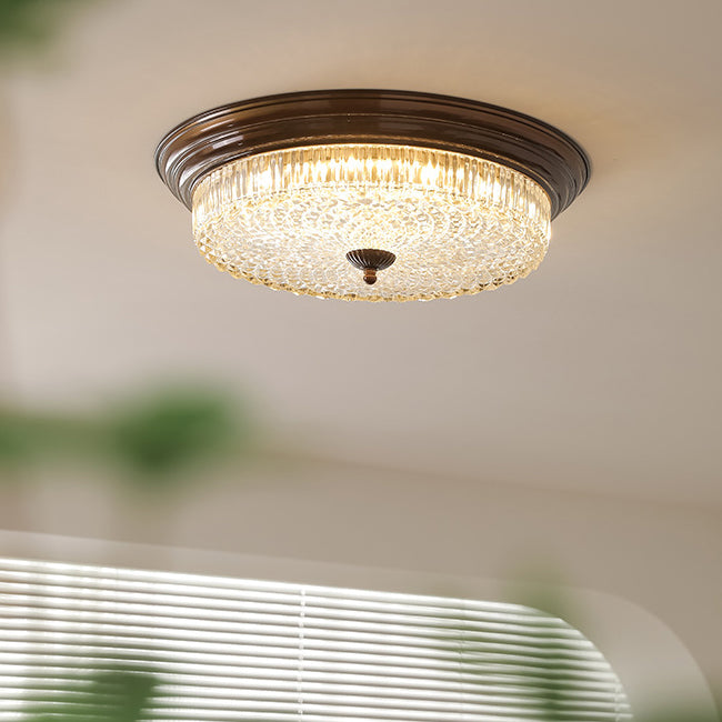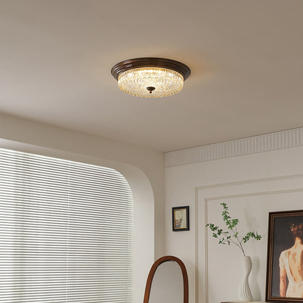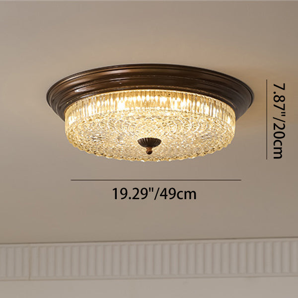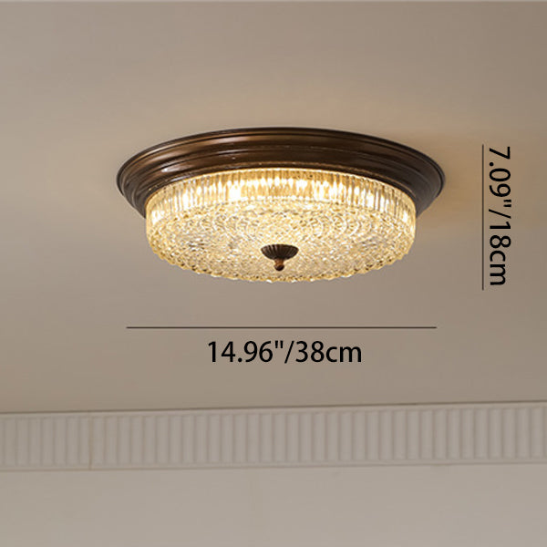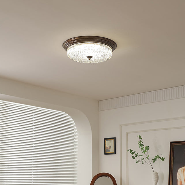 Elevate your bedroom décor with this Traditional French flush mount ceiling light crafted from glass and iron in a walnut finish. Featuring a textured round crystal glass shade, it delivers smooth lines, a refined feel, and soft LED lighting that is gentle on the eyes.