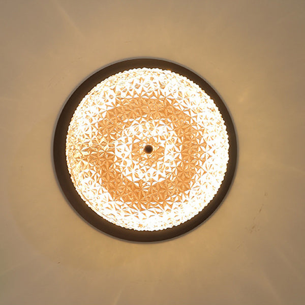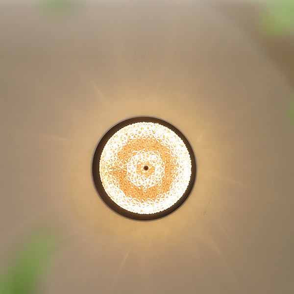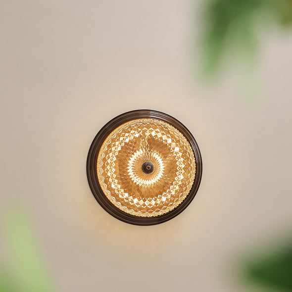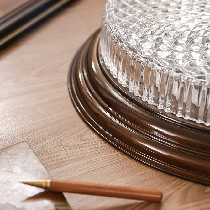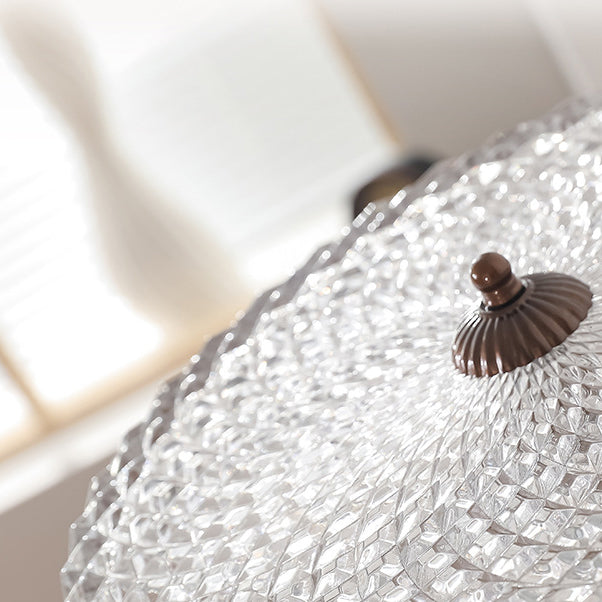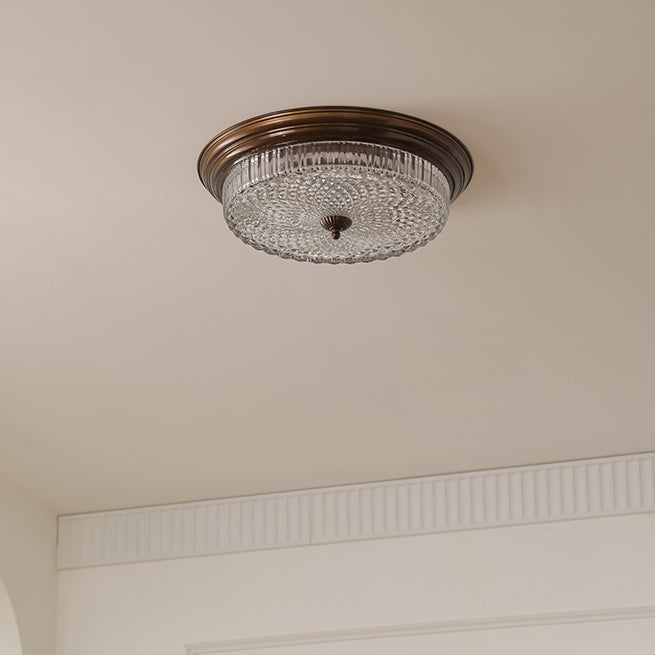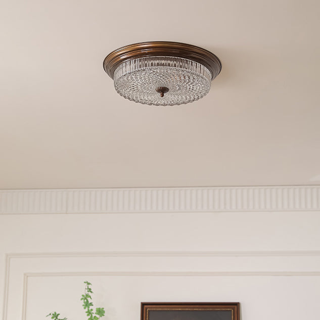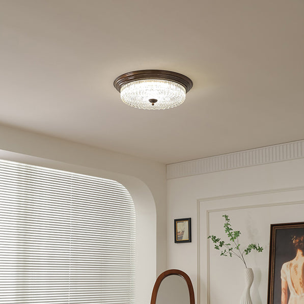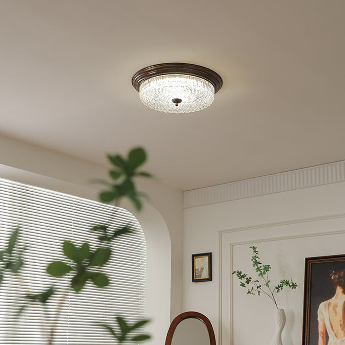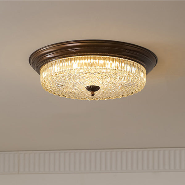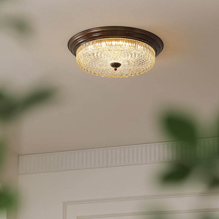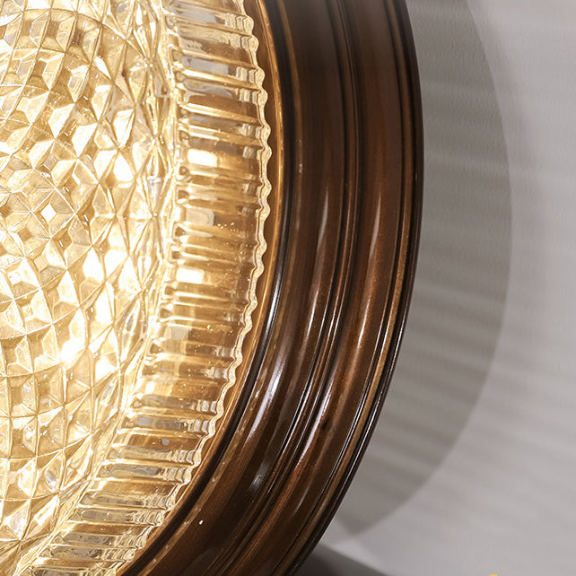 Elevate your bedroom décor with this Traditional French flush mount ceiling light crafted from glass and iron in a walnut finish. Featuring a textured round crystal glass shade, it delivers smooth lines, a refined feel, and soft LED lighting that is gentle on the eyes.