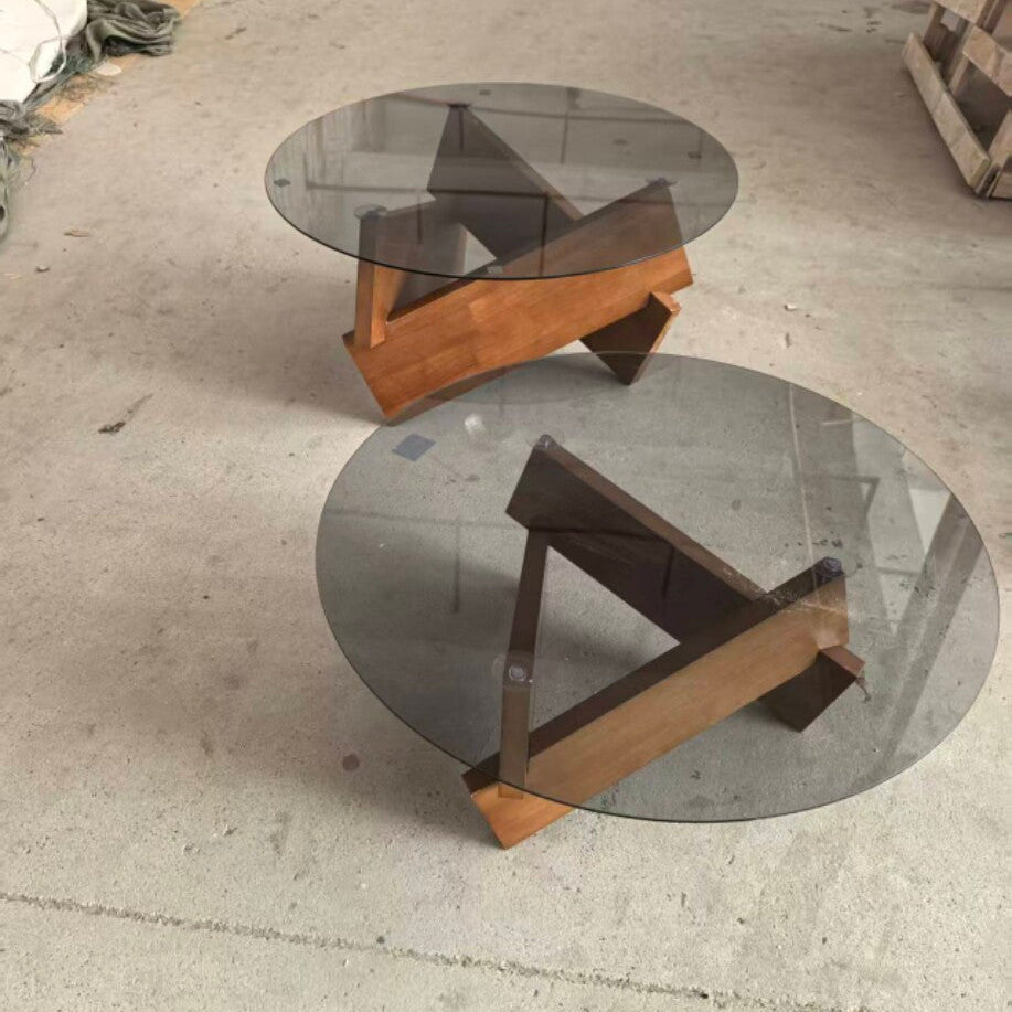 Dieser moderne runde Couchtisch verfügt über ein robustes Gestell aus Massivholz mit Zapfenverbindungen und eine Tischplatte aus gehärtetem Glas, erhältlich in den Ausführungen Walnuss, Schwarz und Natur. Das dreieckig verstärkte Design bietet sowohl Eleganz als auch Stabilität—perfekt für stilvolle, kompakte Wohnzimmer.