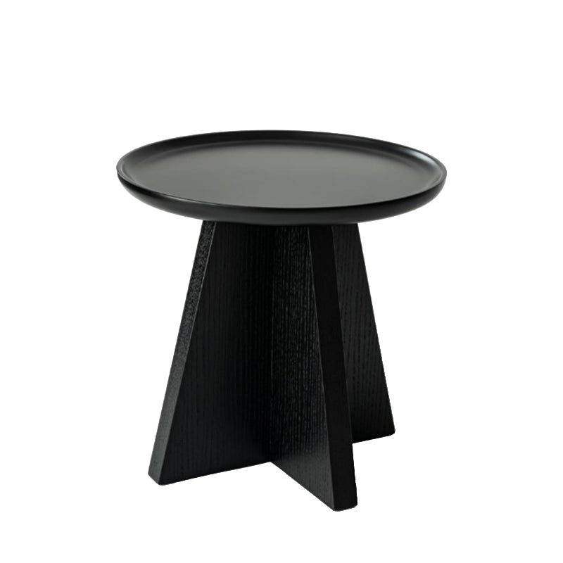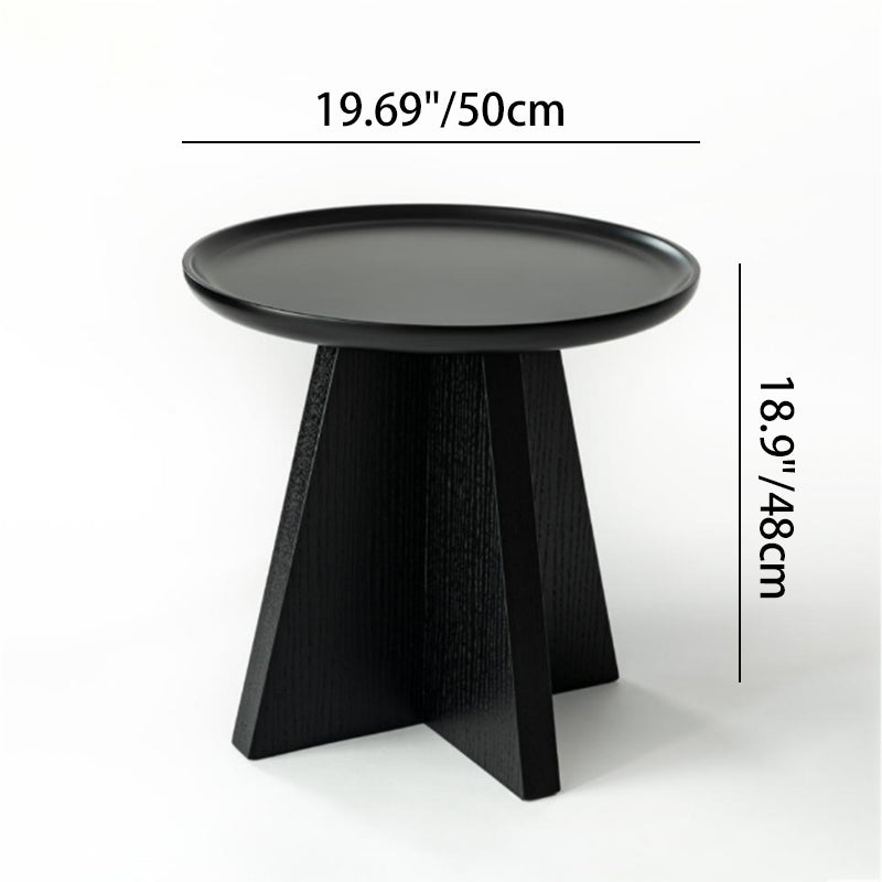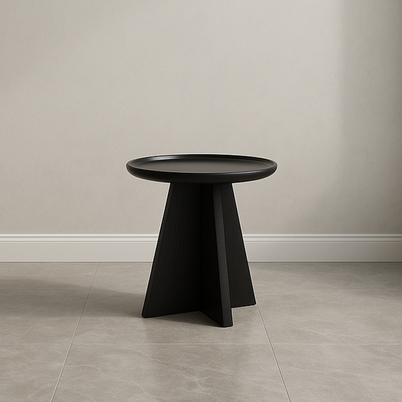 Bring sculptural simplicity into your home with this modern minimalist round side table. Crafted from solid multi-layer wood and eco-friendly E1-grade MDF, it offers excellent durability and stability. The raised-edge tabletop keeps items securely in place, while the architectural cross-panel base adds a bold, modern statement. Perfect for the living room, bedroom, or any corner needing functional style.