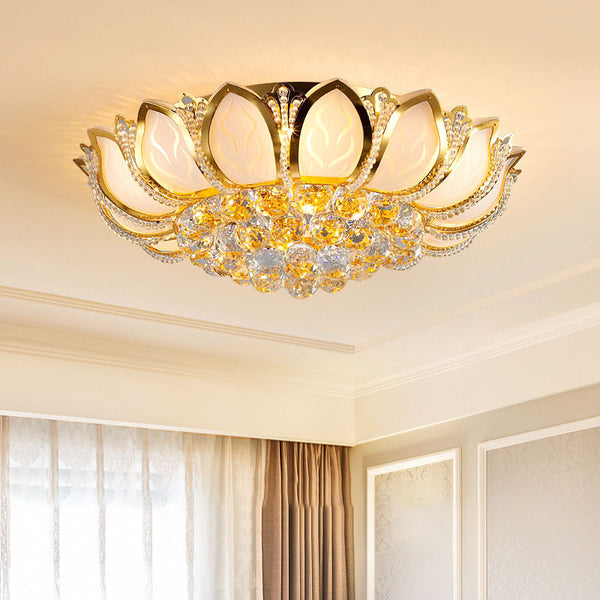 Moderne Luxus-Deckenleuchte im goldenen Glamour-Lotus-Stil mit Milchglassockel und Kristallperlen, 4/6 Lichter, Deckenleuchte für Wohnzimmer