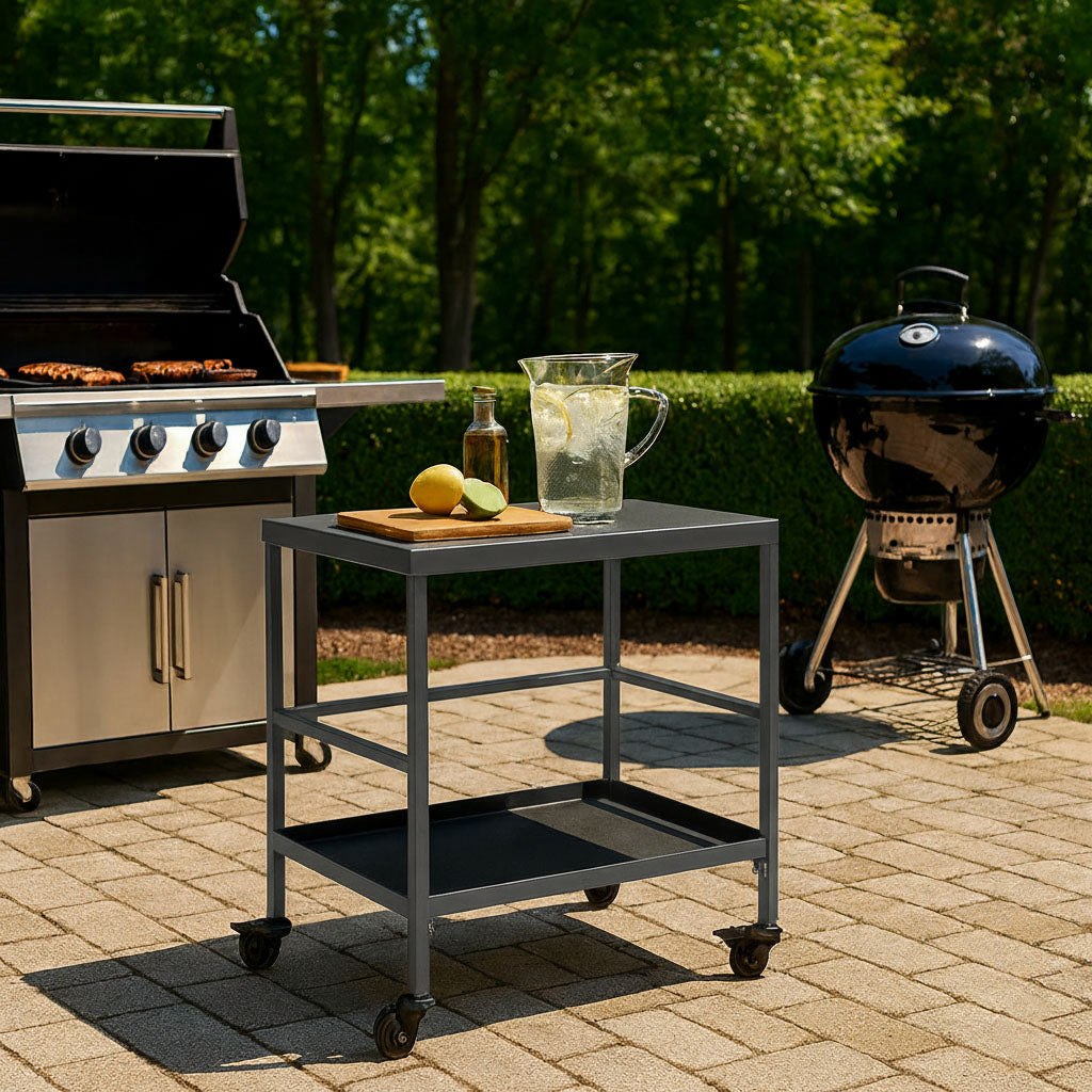 This outdoor side table features a practical cart design for easy mobility, ideal for various outdoor settings. It offers two levels of storage space, keeping your items organized and accessible. The industrial style adds a modern touch, while four wheels, two of which are lockable, ensure stability. The surface is treated for rust and corrosion resistance, enhancing durability for all weather conditions. Whether used as a cart, side table, or mobile storage rack, it provides a convenient and stylish solution for both indoor and outdoor spaces.