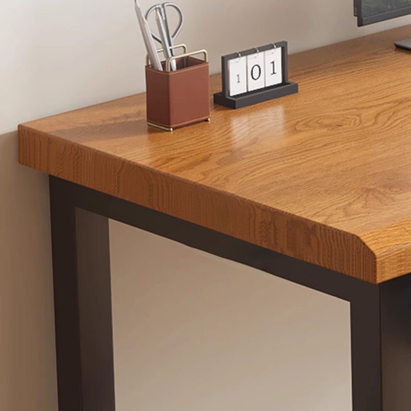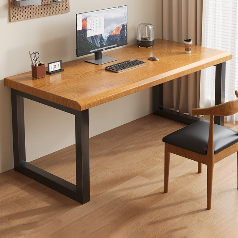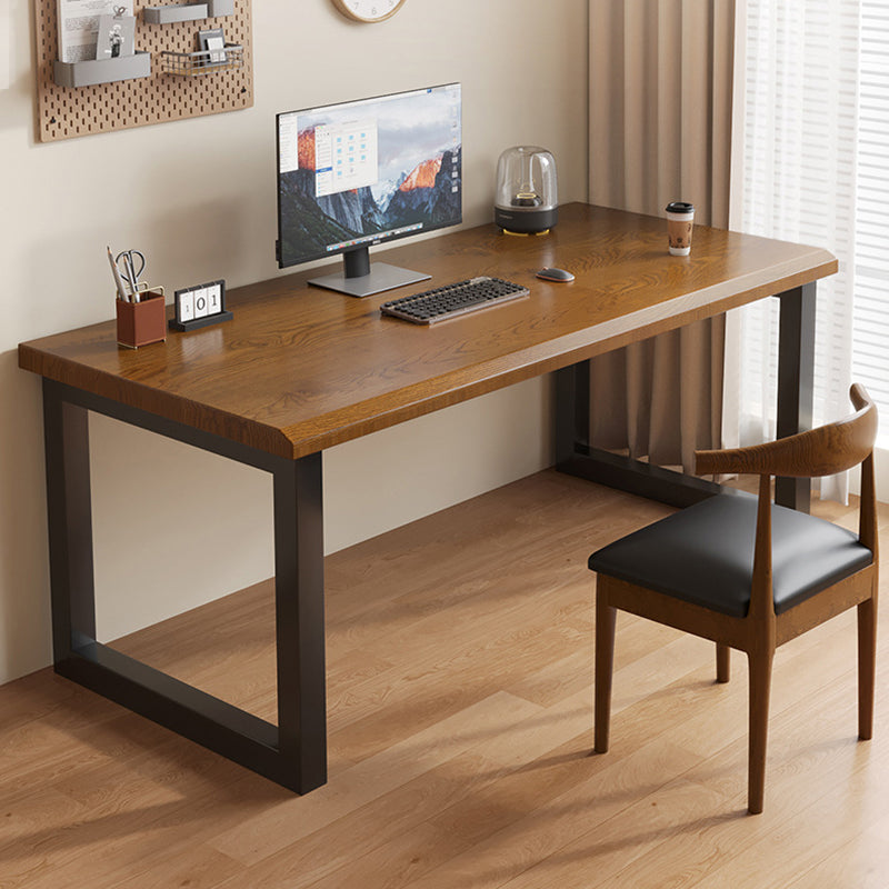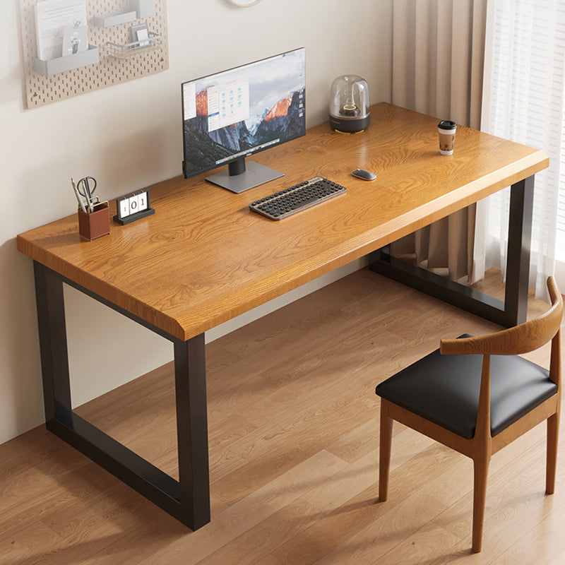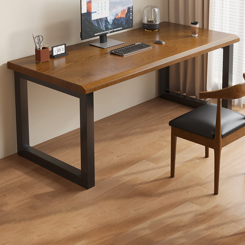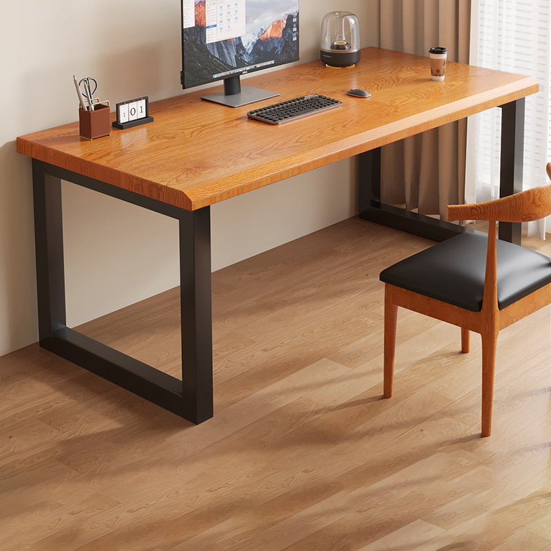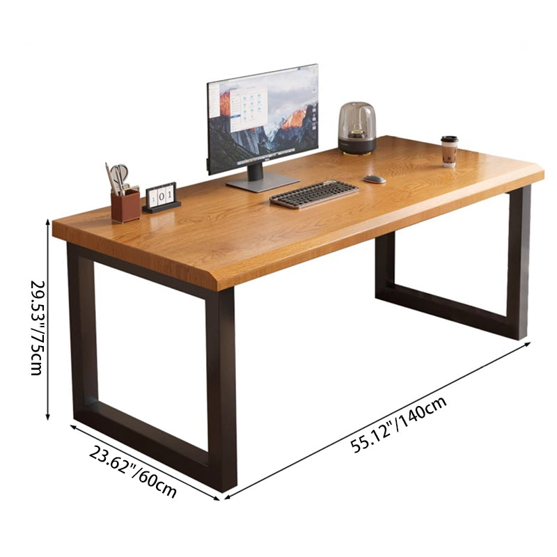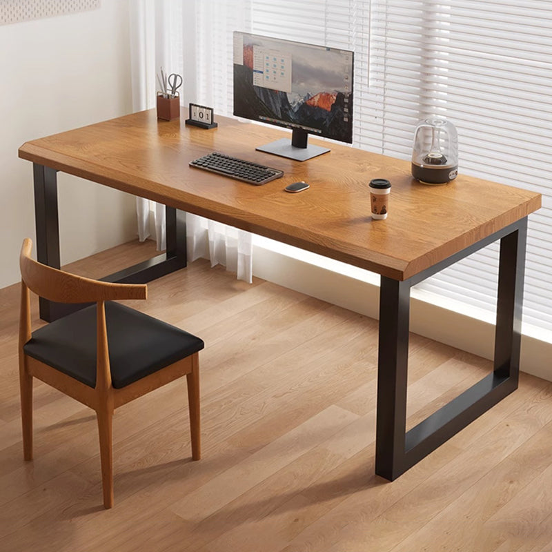 This Traditional Chinese office desk features a wide rectangular solid wood tabletop supported by a durable iron frame, offering stable everyday performance for work or study. The single-tier structure highlights the natural wood grain and is available in golden brown, natural wood, black walnut, light walnut, cherry, and dark walnut finishes, combining practicality with timeless style.