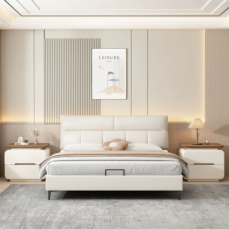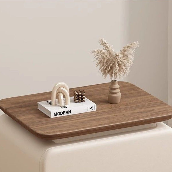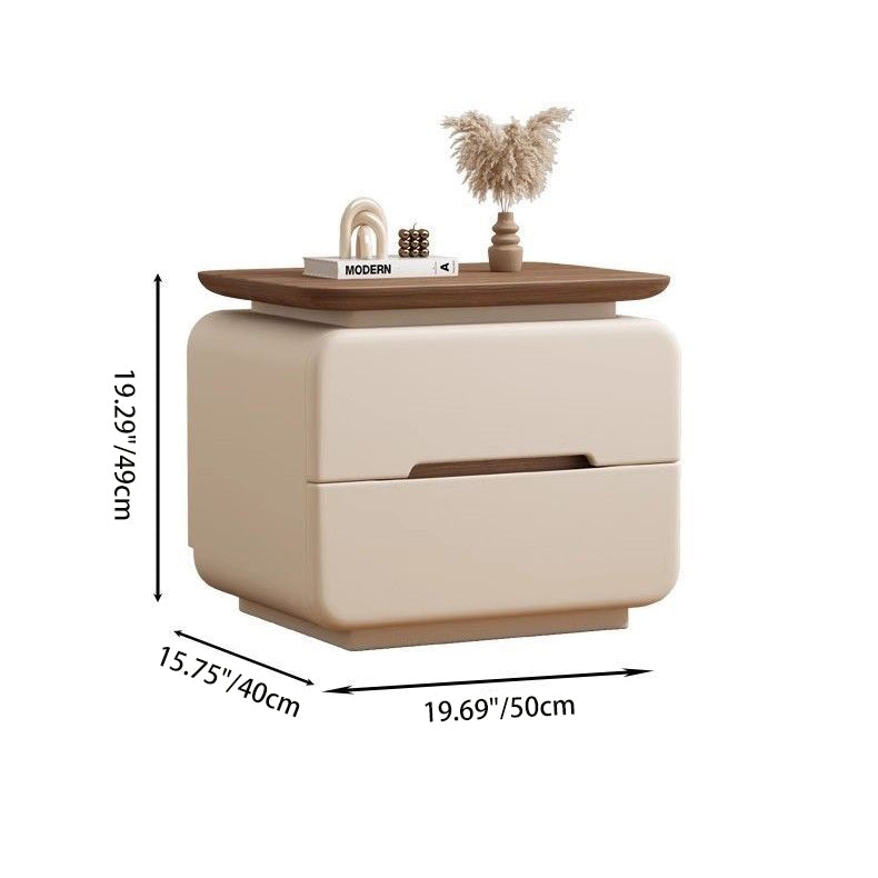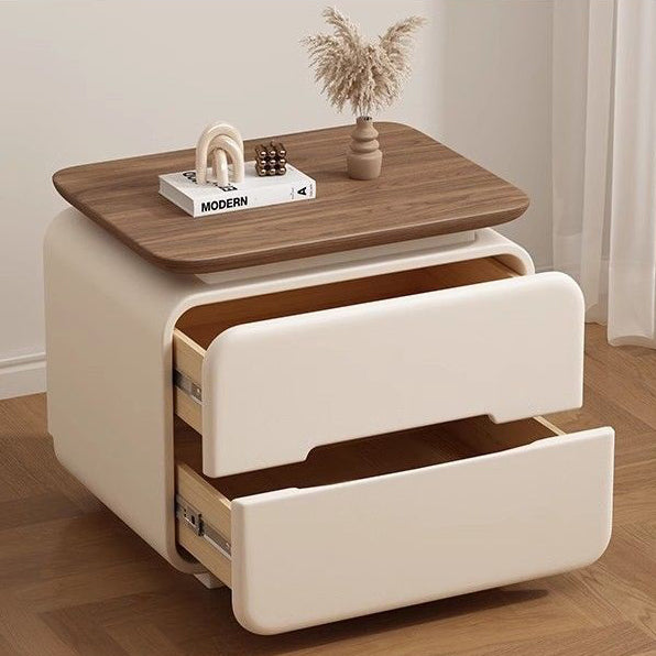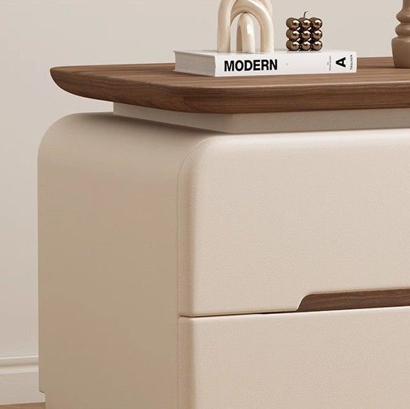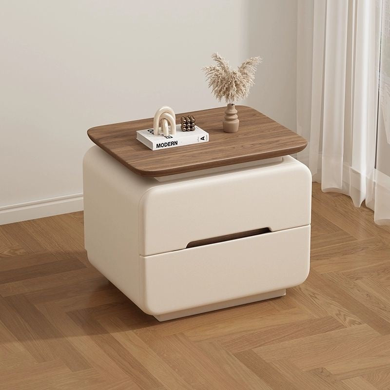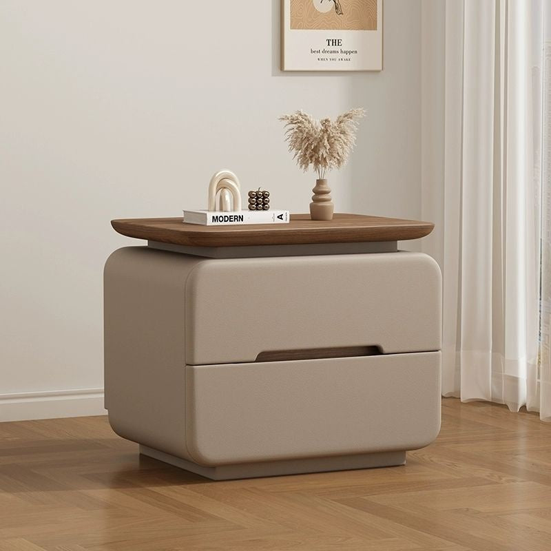 This contemporary bedside table features a solid wood and faux leather construction with a rounded square silhouette that enhances safety and visual softness. Designed with two smooth-glide drawers, recessed handles, and a compact structure, it offers practical storage in cream, khaki, light gray, dark gray, black, and green tones, making it an ideal choice for modern and minimalist bedrooms.