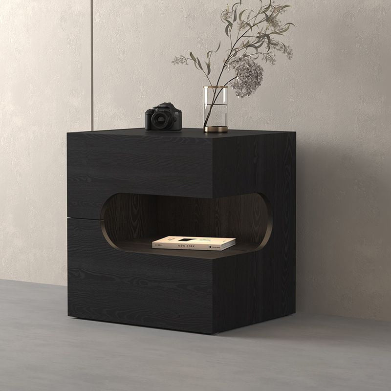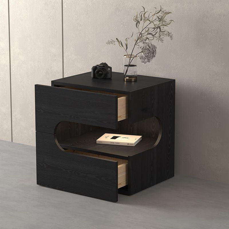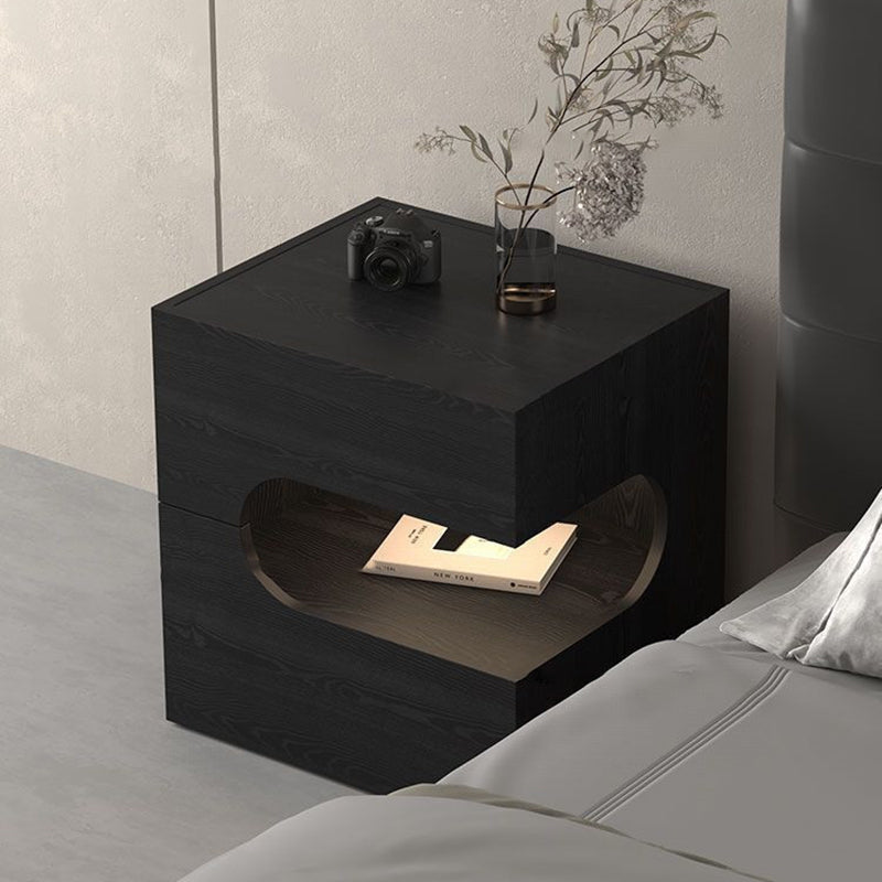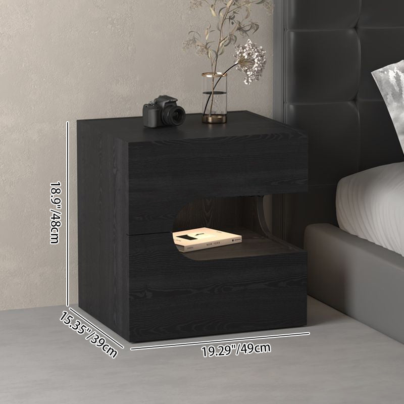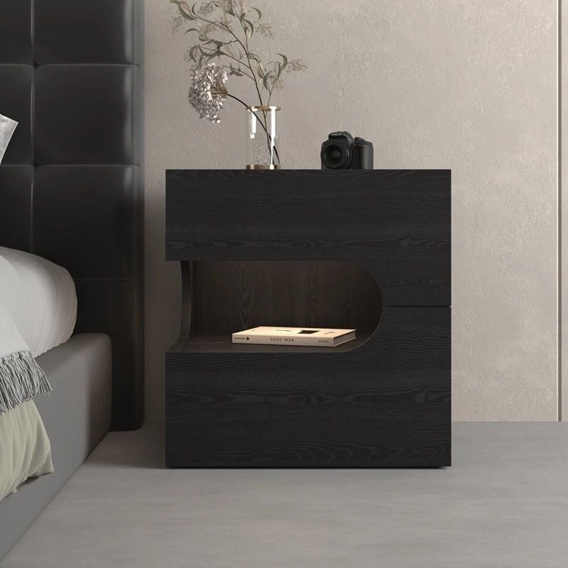 Elevate your evening routine with this modern black nightstand, where minimalist design meets smart functionality. Crafted from durable engineered wood, this piece features a versatile two-tier layout and two spacious drawers, providing the perfect balance of open display space and private bedside storage. The integrated energy-saving magnetic LED light strip adds a contemporary glow and convenient visibility, while the robust construction ensures strong weight support. It is the ideal tech-ready accent for any sophisticated contemporary bedroom.