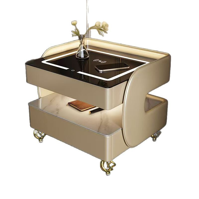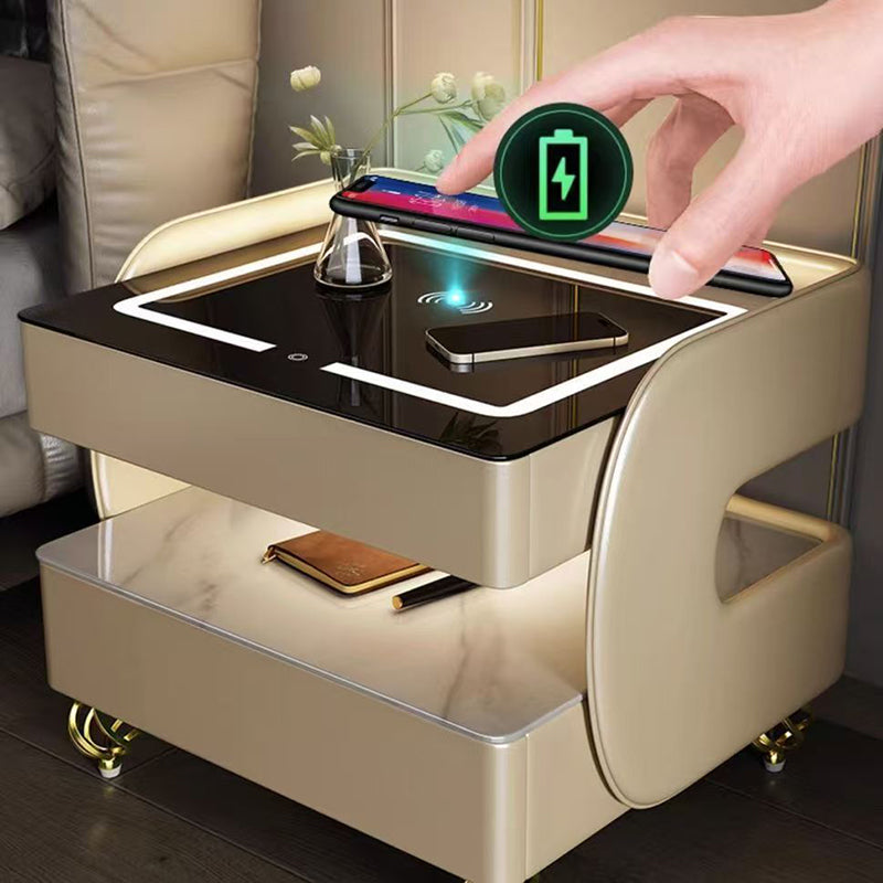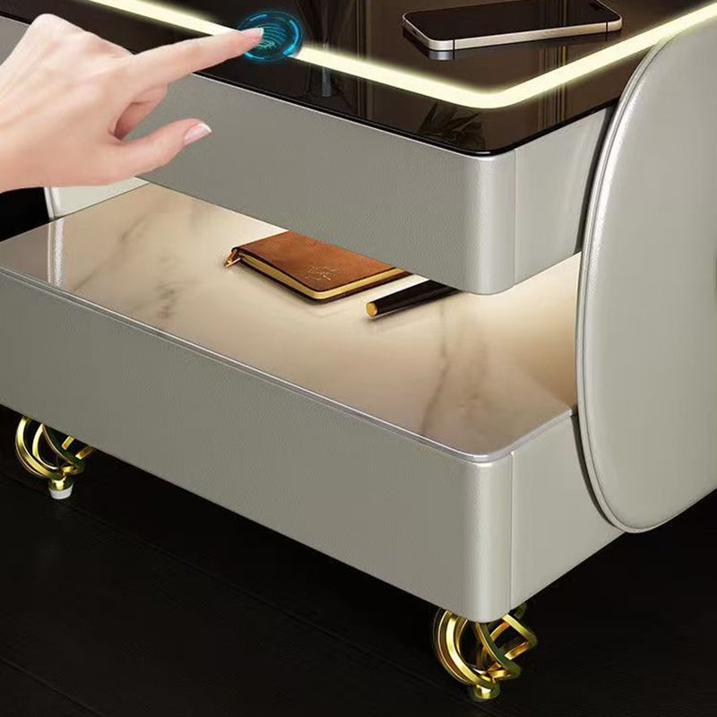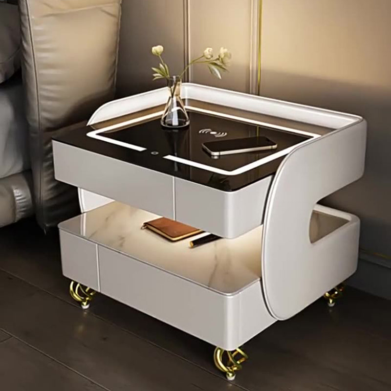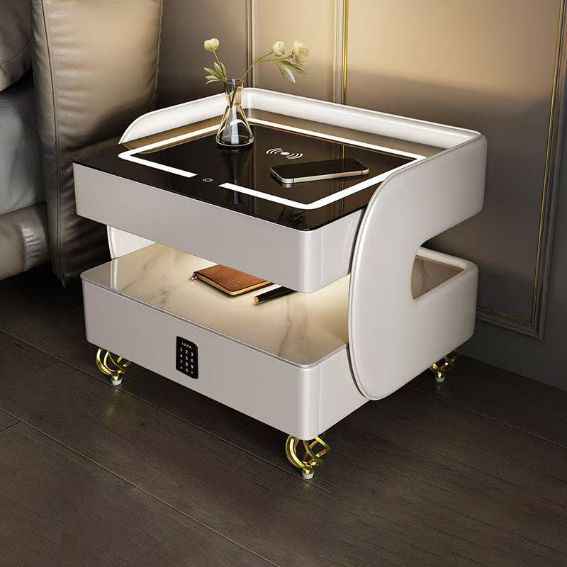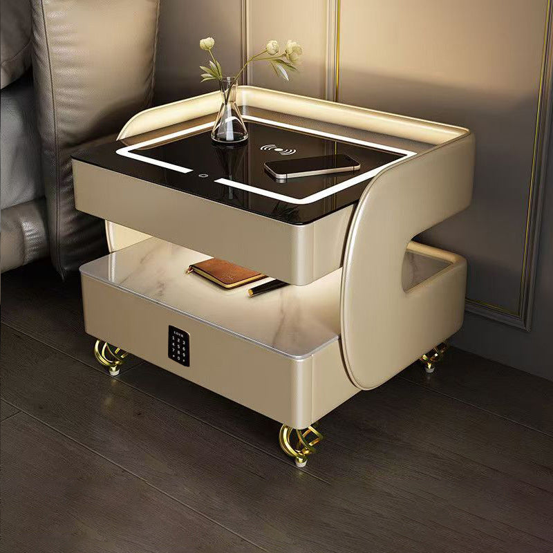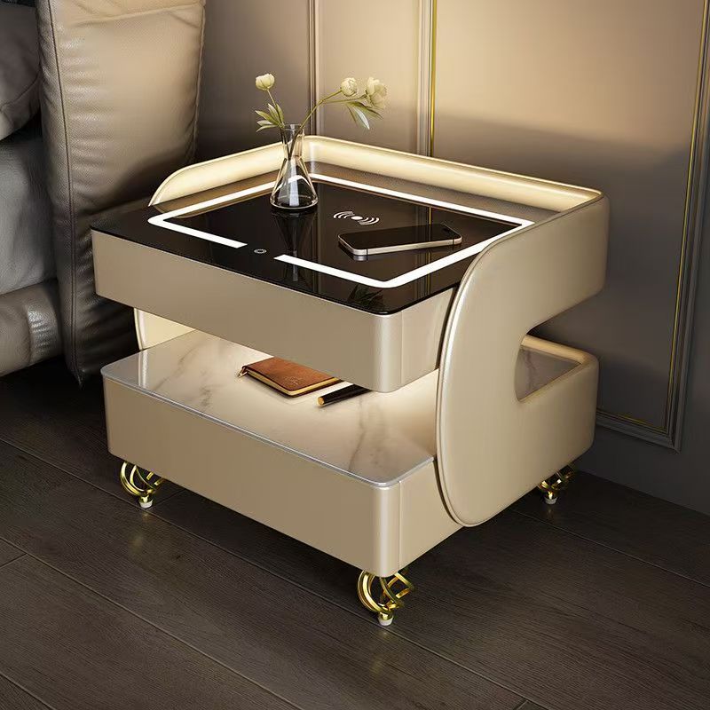 Fusing high-tech innovation with a modern minimalist aesthetic, this smart nightstand is the ultimate bedside companion. The design features a heat-resistant stone tabletop and tempered glass, supported by a solid construction that houses two drawers and dual-layer storage. Designed for the connected lifestyle, it integrates wireless charging, USB ports, and a Bluetooth speaker, all while casting a customizable glow with three-color ambient lighting. Available in beige, champagne, or light gray, it is the perfect blend of style and functionality for the contemporary bedroom.