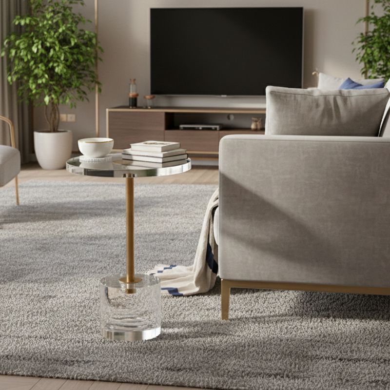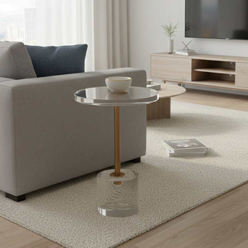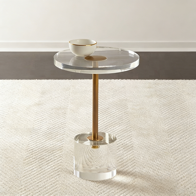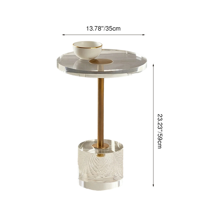 Featuring a transparent acrylic top and base, this round side table is reinforced by a durable metal frame with a sleek gold accent for a touch of modern luxury. Its compact yet sturdy construction makes it a versatile choice as a sofa side table or a minimalist accent piece, seamlessly blending contemporary style with reliable stability in any living room.