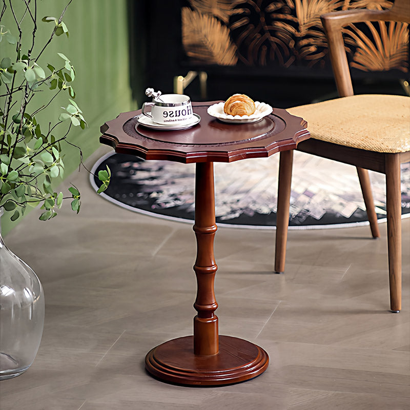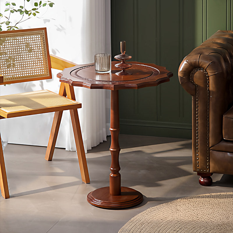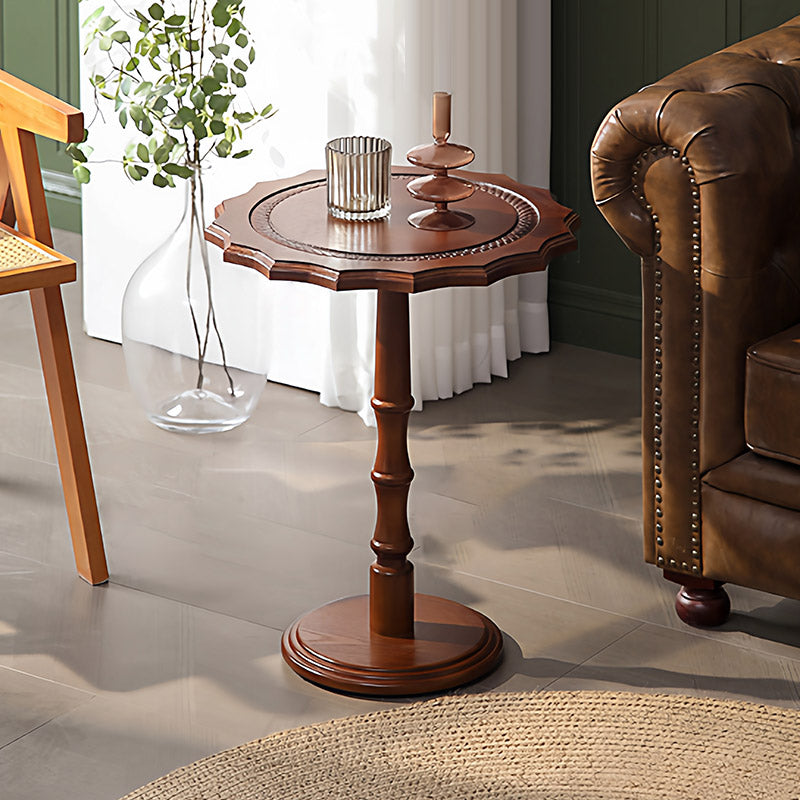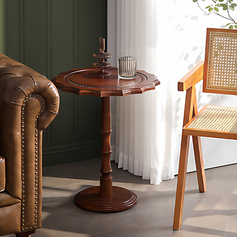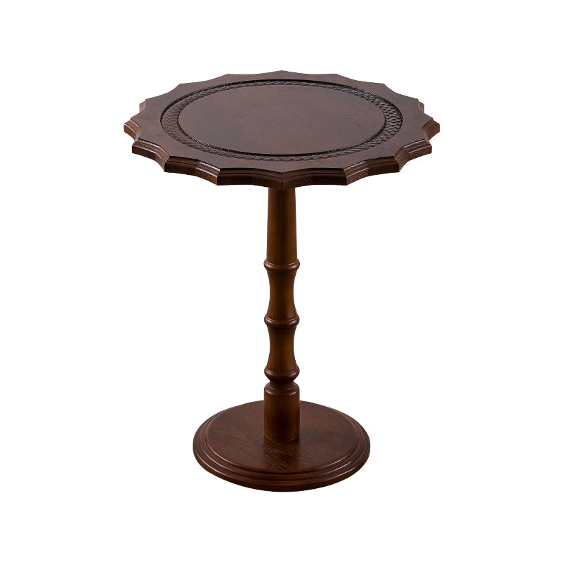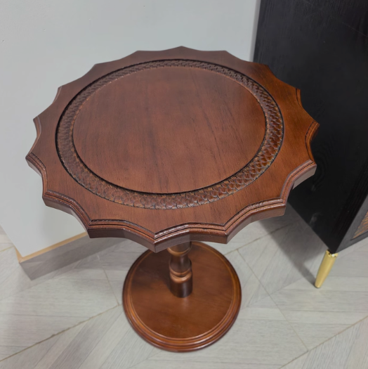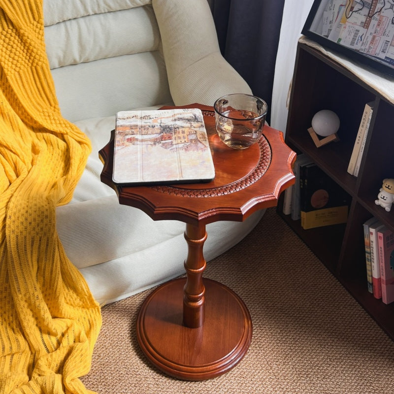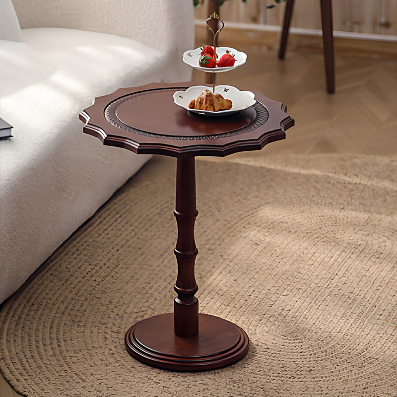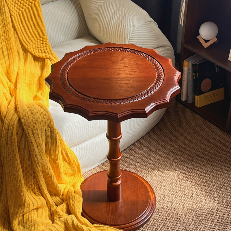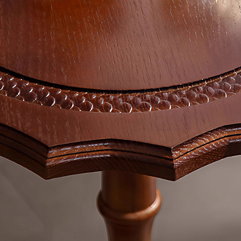 Featuring wavy carved edges and a rich walnut finish, this solid wood accent table with a steel base adds timeless American vintage character while staying sturdy as a sofa side table or small coffee table in the living room.