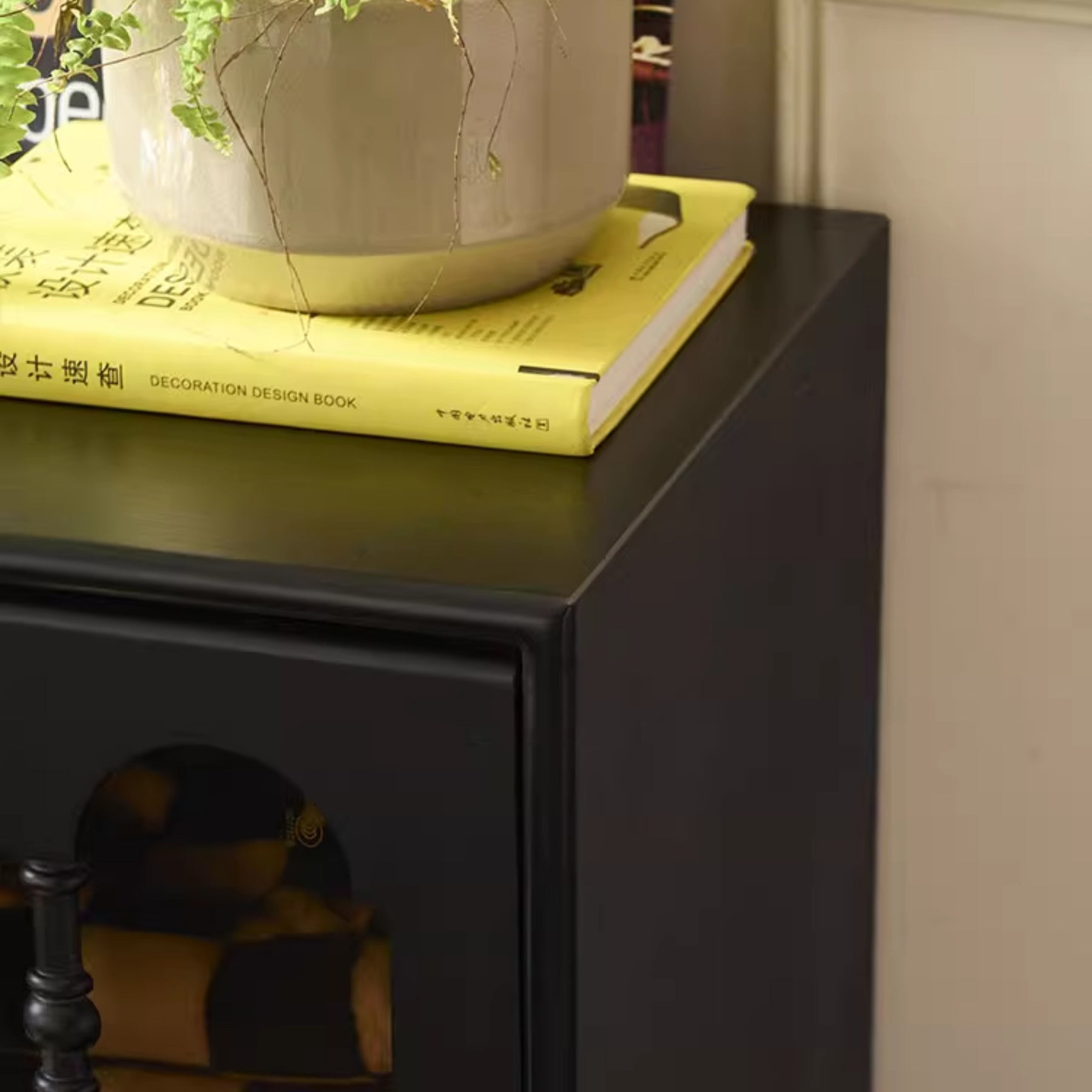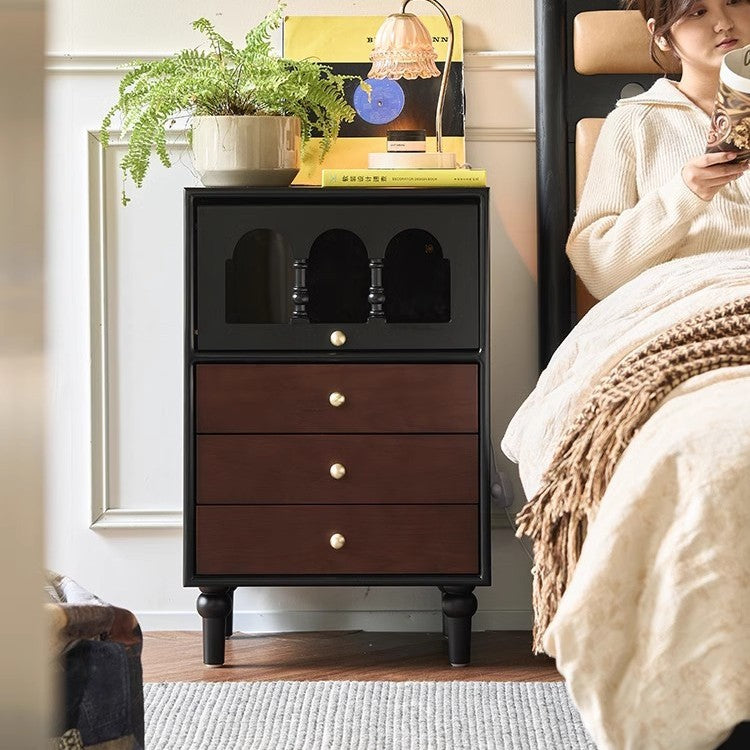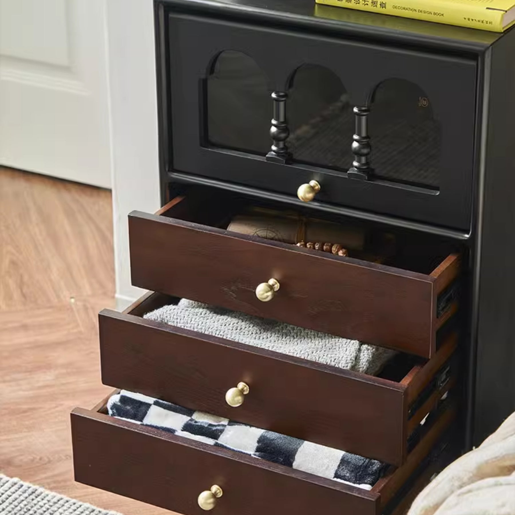 This traditional French–style bedroom nightstand is crafted from pine wood and solid wood plywood, featuring an arched rectangular silhouette with rounded ball details for an elegant vintage look. Designed with three large-capacity drawers, a flip-up concealed door, and finished in black or deep walnut, it delivers refined storage with a subtle luxury feel, ideal for stylish and functional bedroom organization.