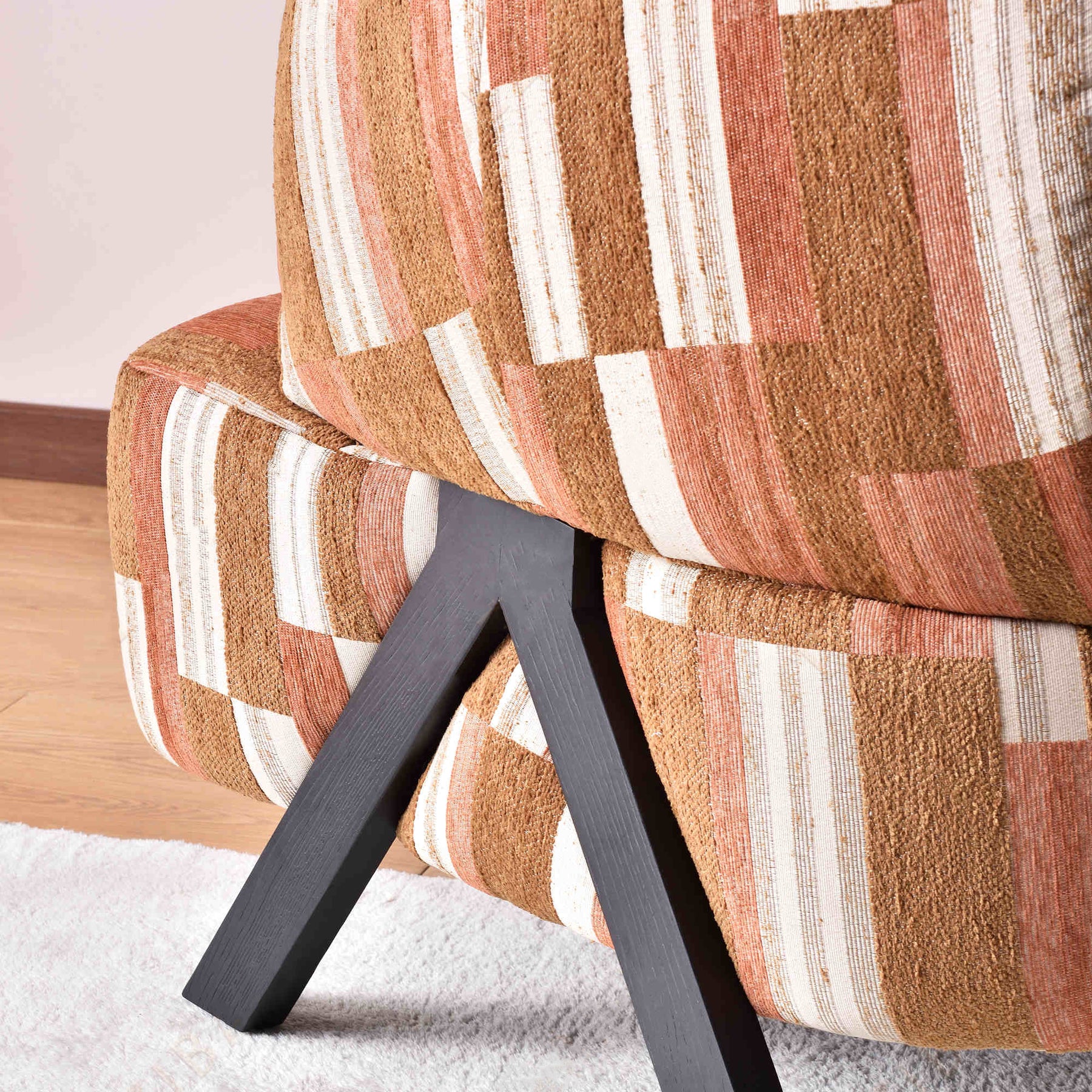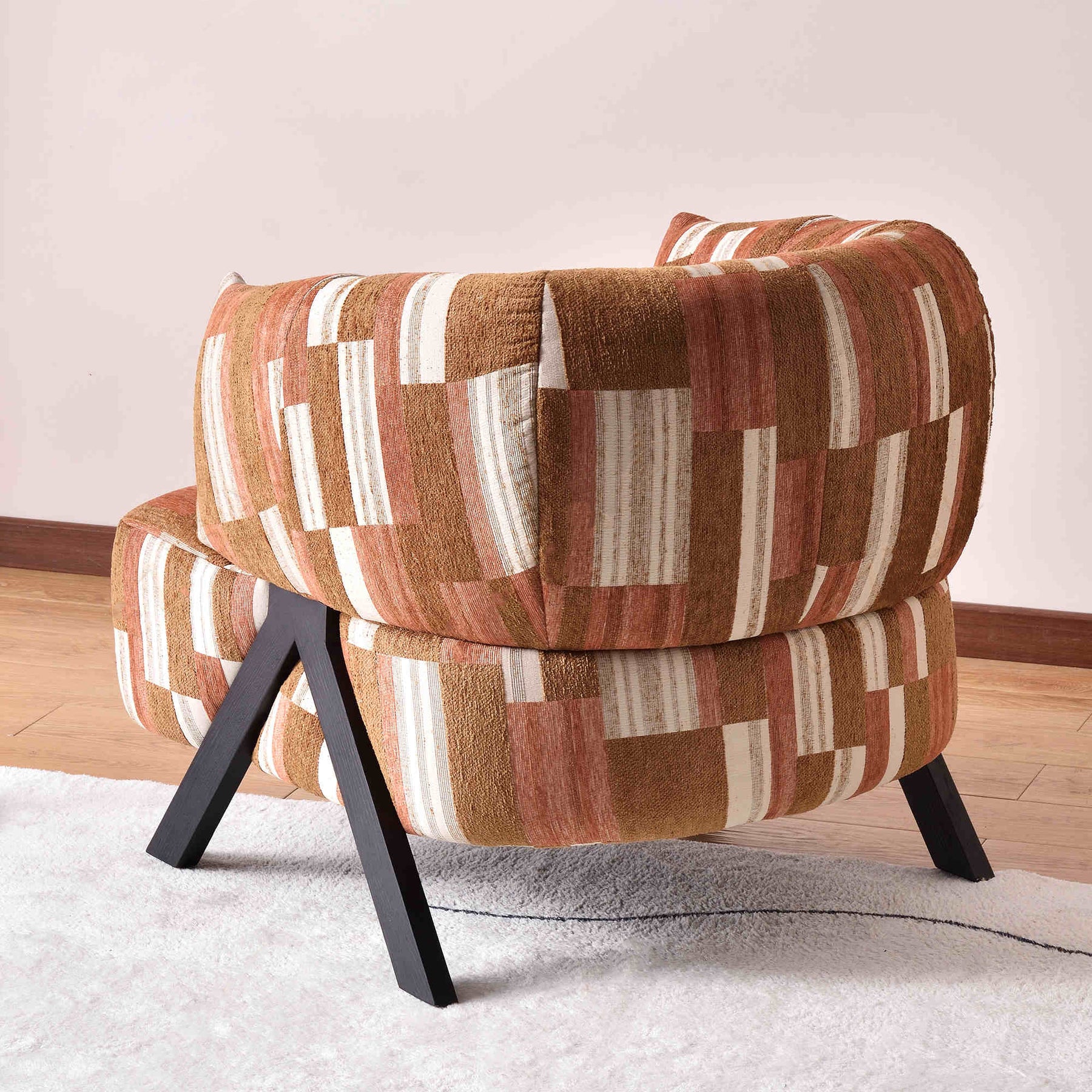 This contemporary Bohemian-style lounge chair combines natural textures with artistic design. Upholstered in a soft, breathable chenille cotton-linen blend, it features a sturdy solid wood frame and black A-shaped wooden legs for lasting stability. The curved backrest offers ergonomic comfort, while the patchwork color scheme --- light green, brown, coffee, and off-white --- adds depth and character. Perfect for living rooms, bedrooms, or reading corners, it brings a relaxed yet refined presence to any space.