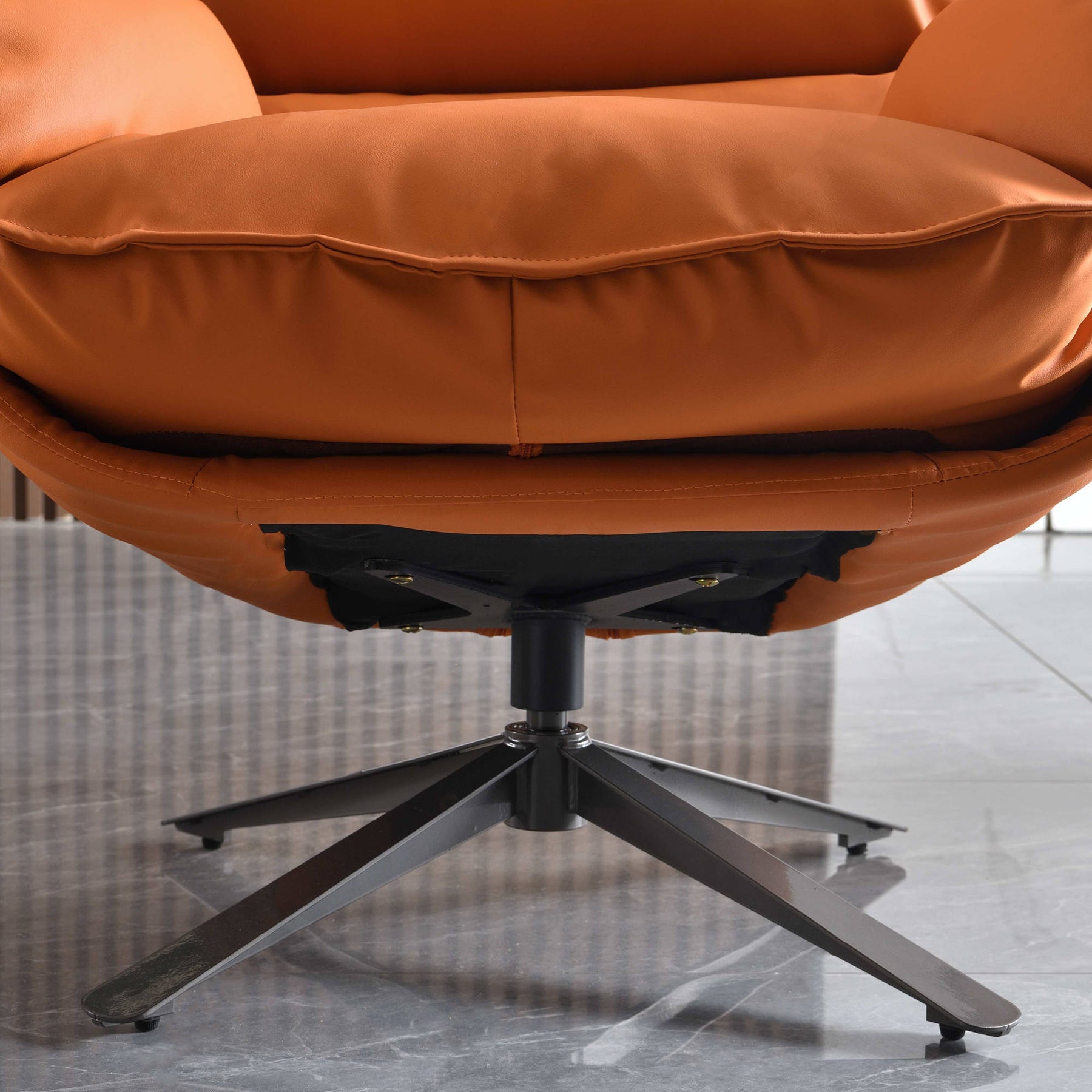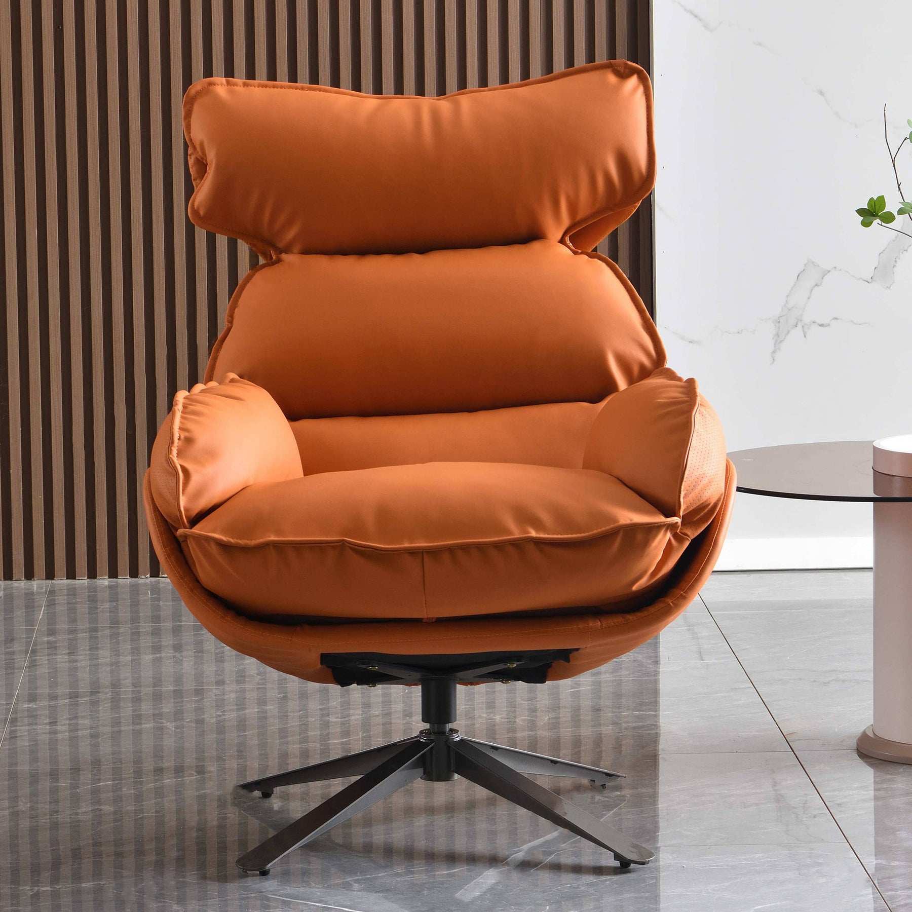 This modern accent chair blends clean lines with a refined silhouette for a contemporary luxe look. Upholstered in soft, durable faux leather, it's filled with high-resilience cotton for a plush, supportive seating experience. The 360° swivel base features smooth dual-axis rotation and sturdy alloy legs. Available in orange, mustard yellow, and off-white to add bold character to any space. Ideal for living rooms, bedrooms, or reading corners, offering both comfort and style.